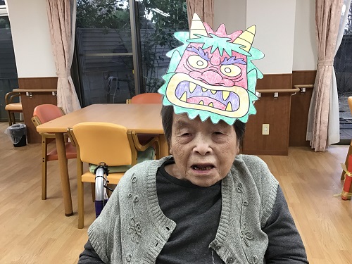 2月3日の豆まきの日のために皆様、ご自分のお面に色を塗り作成されました。