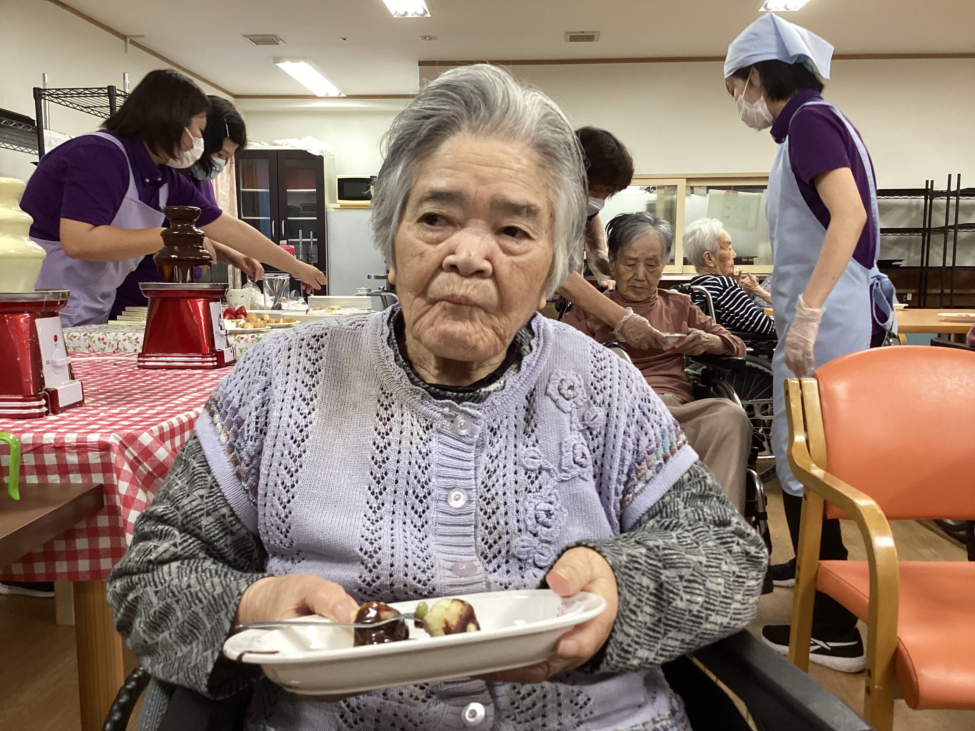 ご入居者の皆様にはこちらで用意したイチゴやバナナ、ワッフルやマシュマロをチョコに掛けて食べて頂きました!!