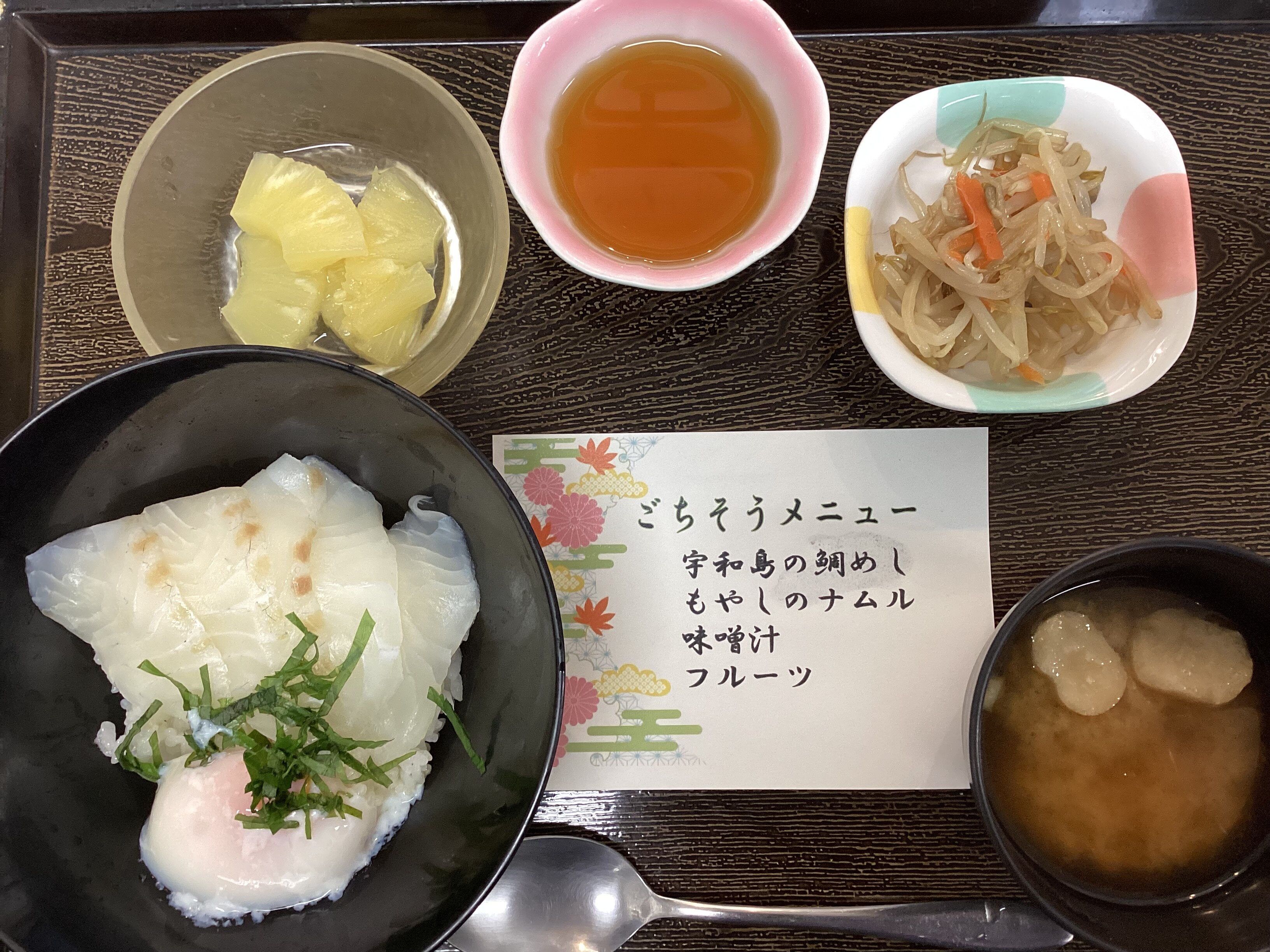 鯛めしは愛媛県の郷土料理の一つとして知られるが、宇和島市を中心とする南予地方では鯛の刺身を、醤油を主体としたタレに生卵、ゴマ、きざみねぎなどの薬味を混ぜたものに和え、ご飯に載せたものを鯛めしと呼ぶそうです。