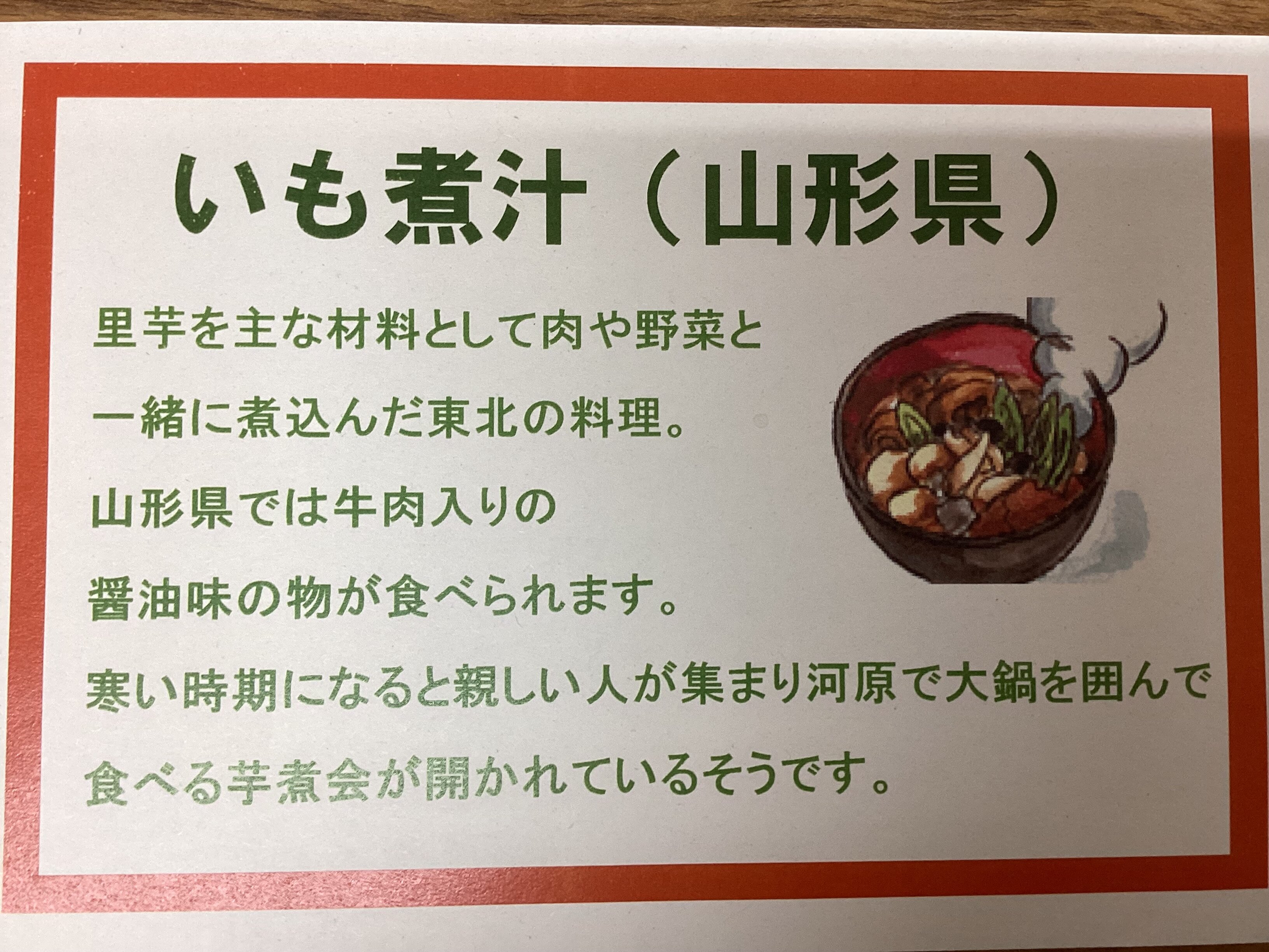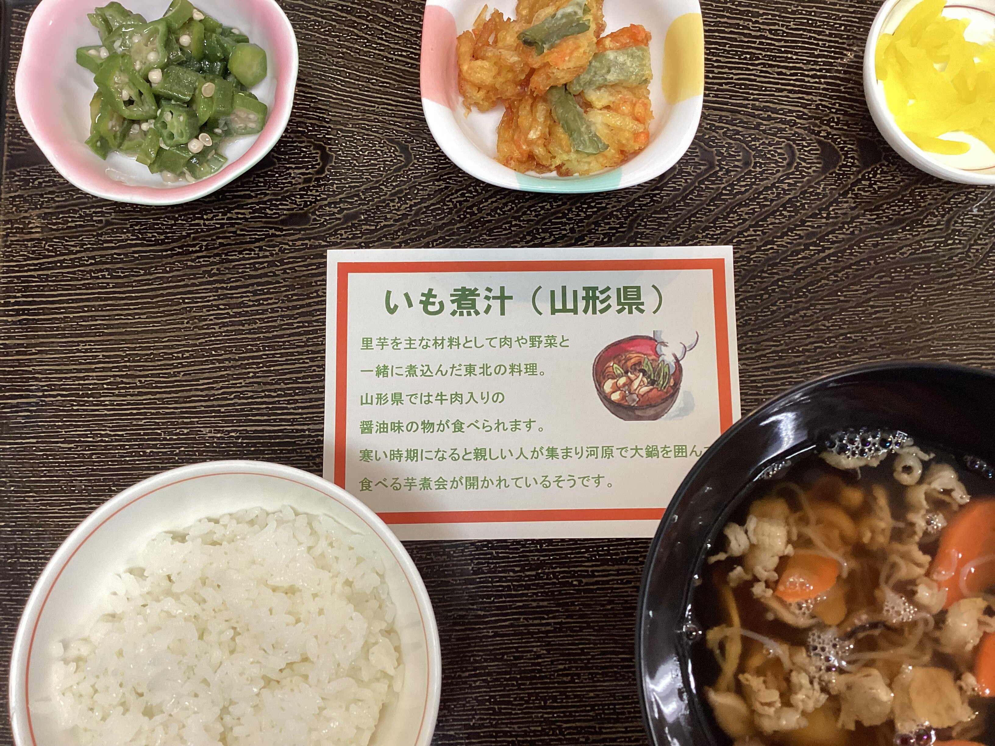 本日は、山形県のご当地メニューの芋煮汁の昼食をご紹介いたします。
