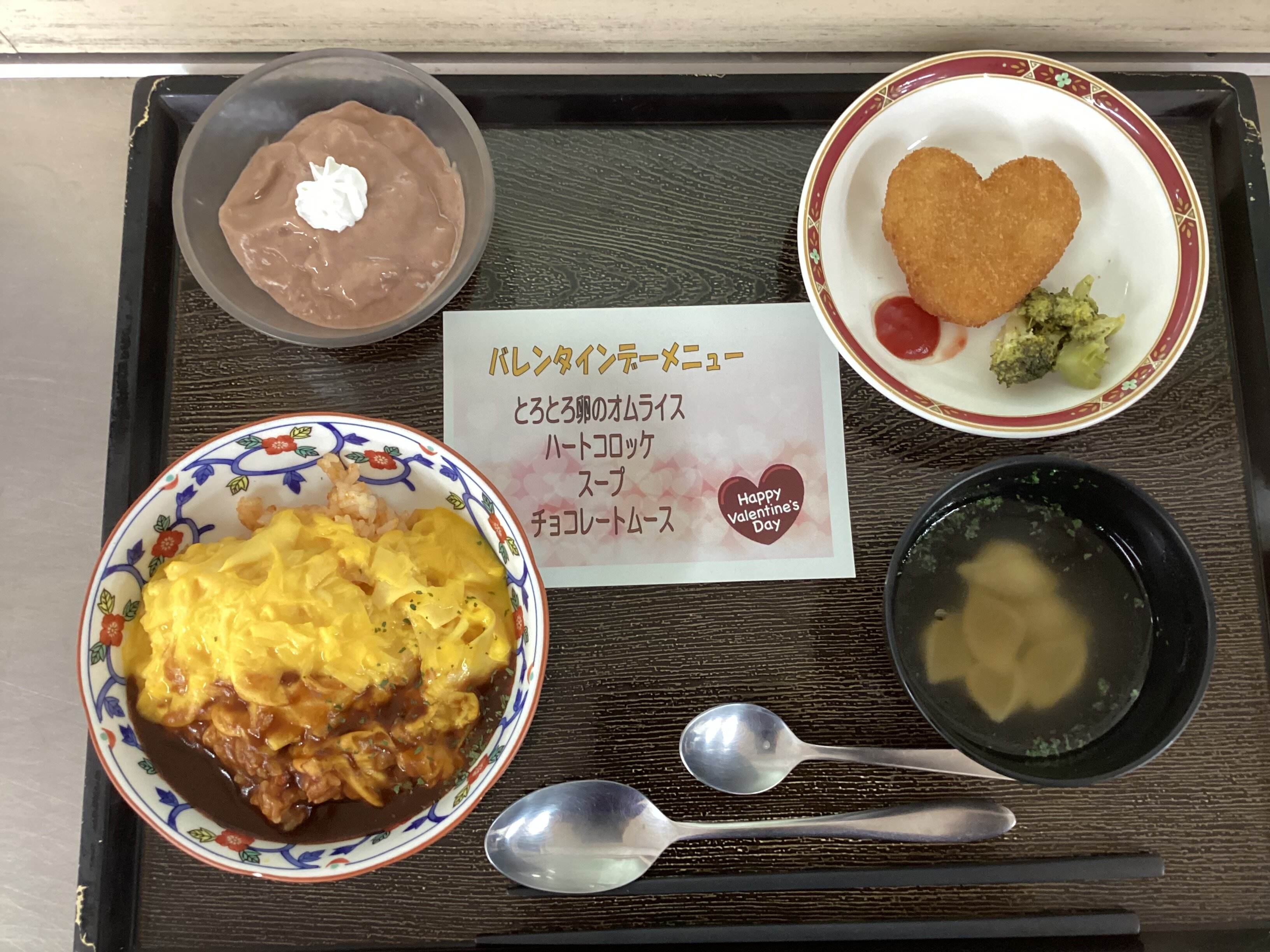 ハートのコロッケにトロトロ卵のオムライスとチョコムースで本日にピッタリメニューでした(#^.^#)