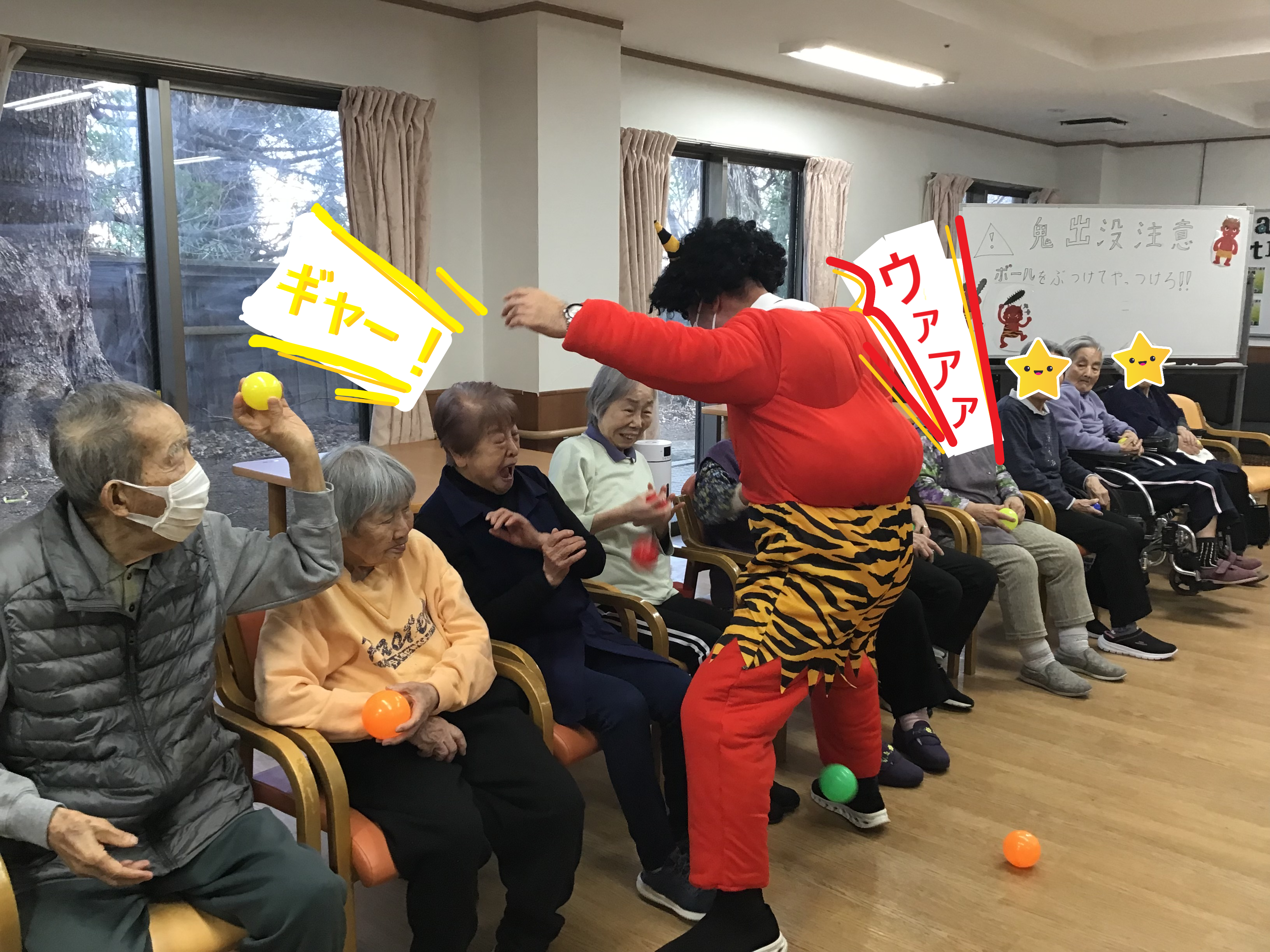 豆の代わりにカラーボールを持って、皆様退治なされます!( `ー´)ノ