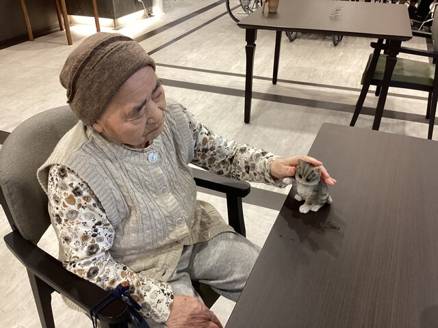 テーブルにちょこんと座っている小さな猫の置物。それを見つけたご入居者が、「あら、可愛いわね」と優しく手を伸ばされました。頭をそっとなでる手つきはとても穏やかで、まるで本物の猫ちゃんに接しているかのよう。その場にいた私たちスタッフも、思わず心がポカポカと温かくなりました。