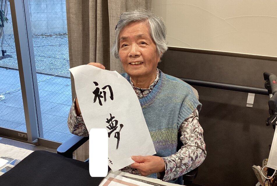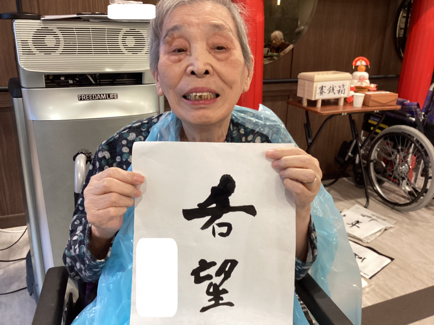 墨のいい香りがフロアに広がると、なんだか背筋がピシッと伸びるような、清々しい気持ちになりますね。ご入居者の皆さんも、青いエプロンをつけて準備万端!「何を書こうかしら?」と相談しながら、一筆一筆とても丁寧に筆を走らせていました。