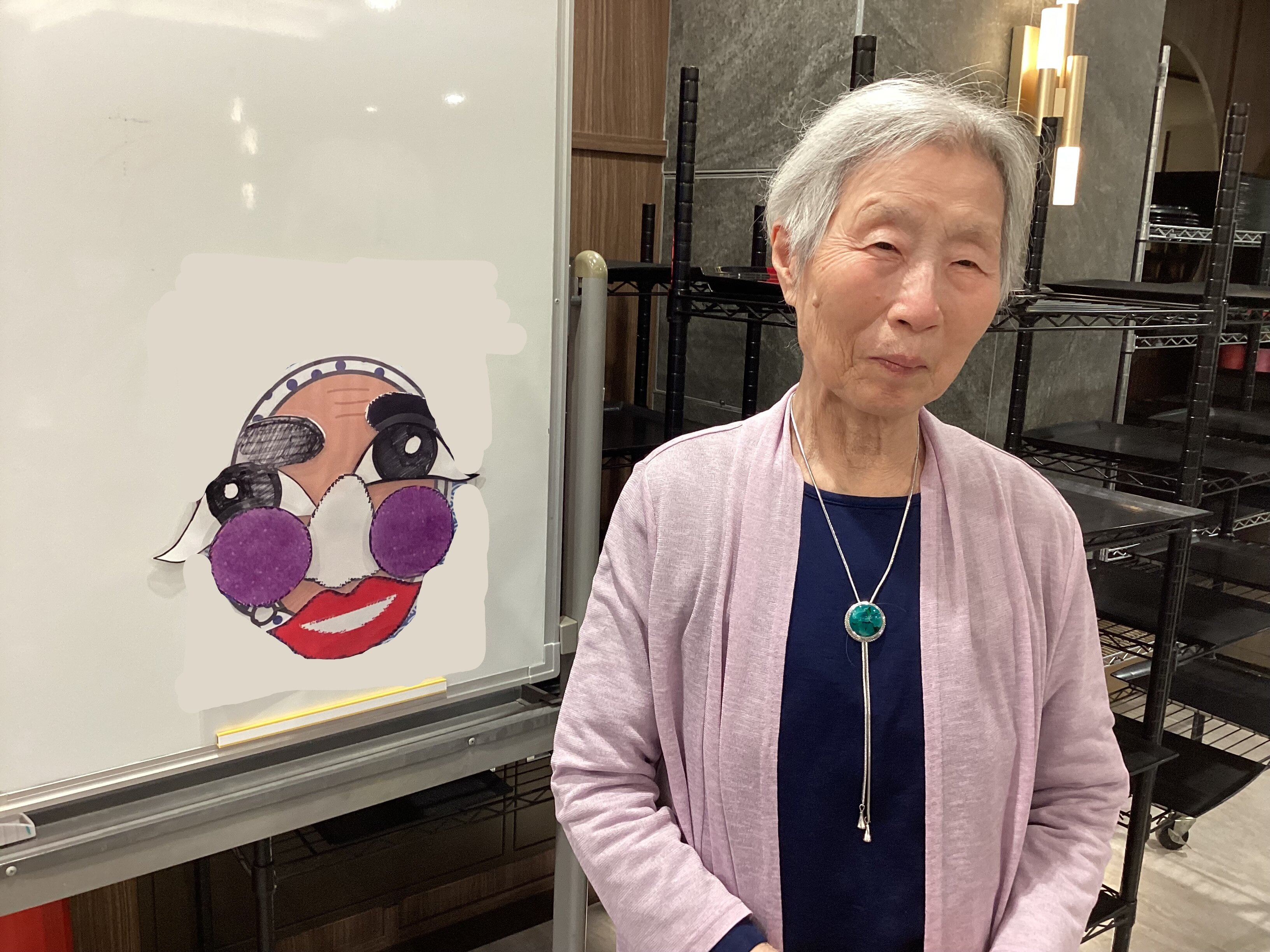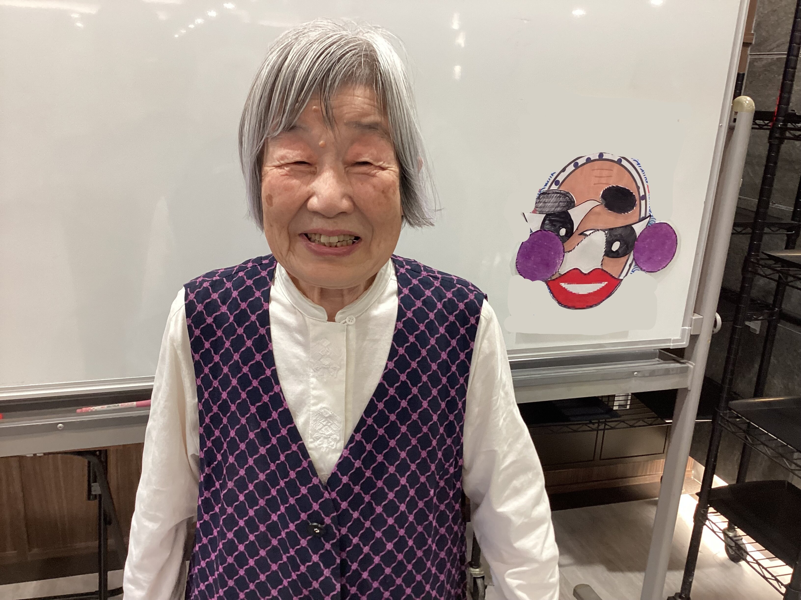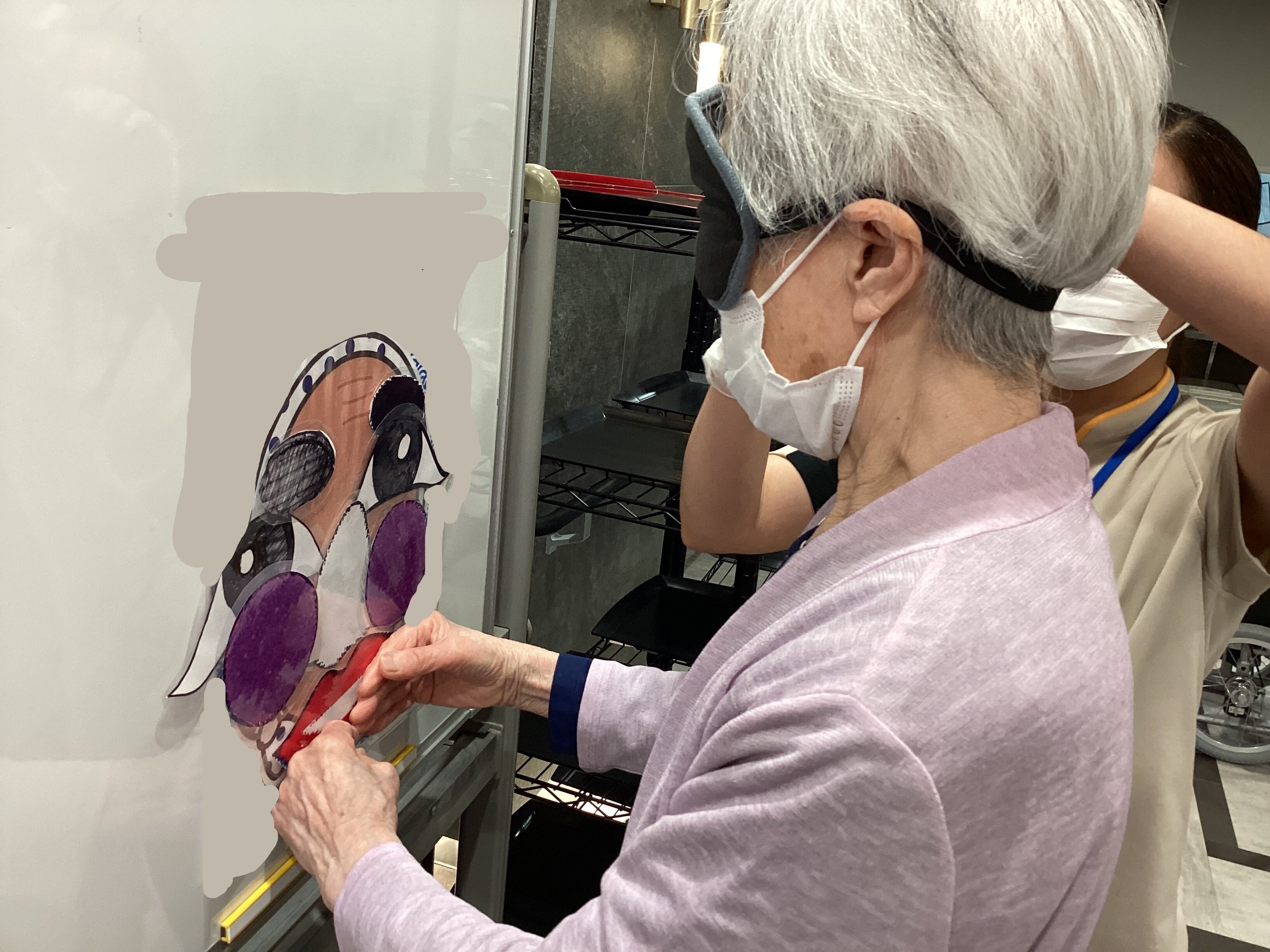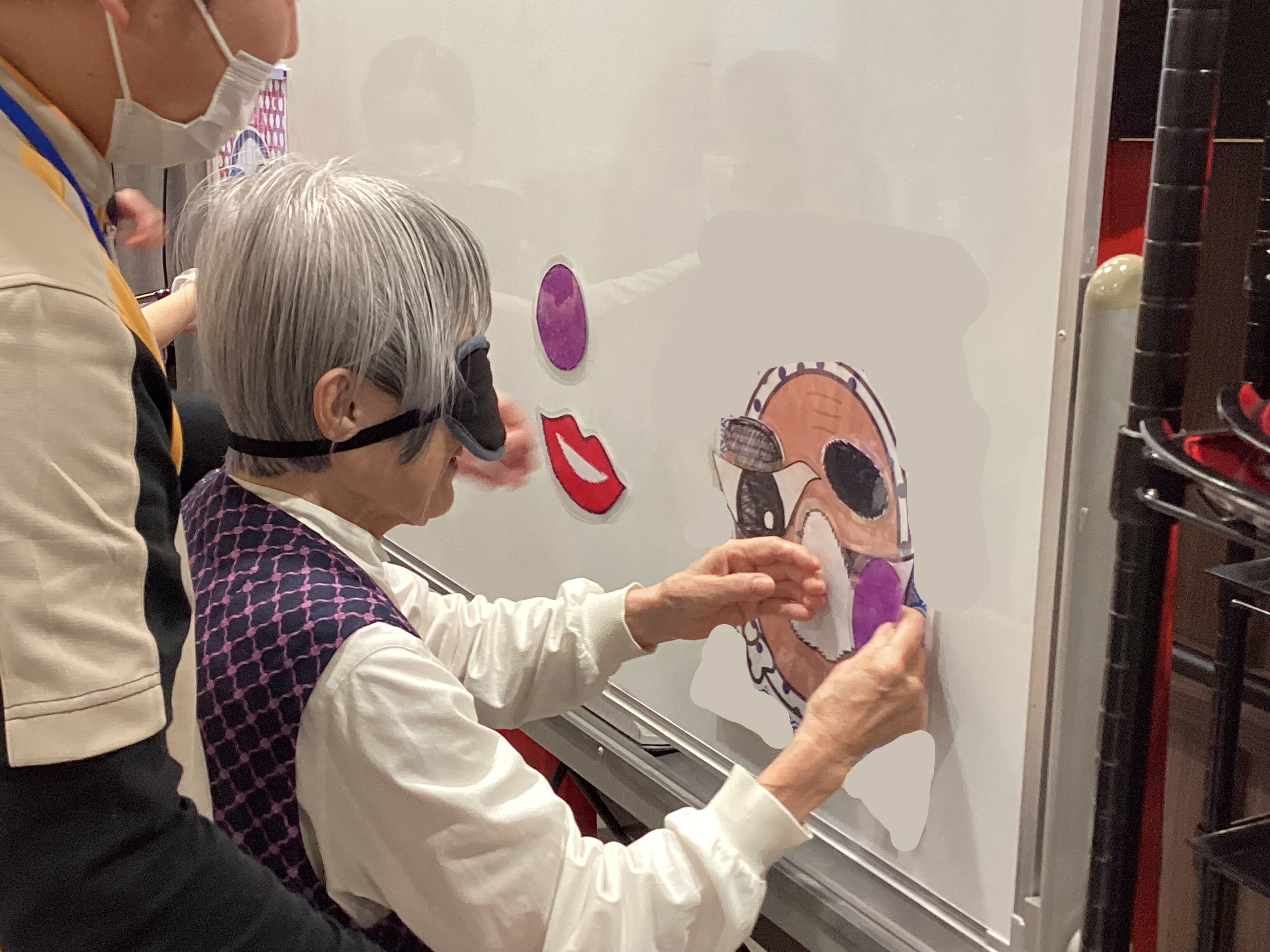 「もっと上!」「あ、そこは鼻だよ!」と、周りのご入居者からも応援の声が飛び交い、会場は大盛り上がり。目隠しを外した瞬間のご本人の「あらやだ!」「面白い顔になっちゃった!」という弾けるような笑顔がとっても印象的でした。
