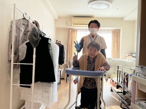 最初は「歩くのは大変、、」と仰られていたご入居者様も理学療法士とのリハビリにより今では歩きながらピースサインをいただけるくらい余裕ができました(*^^*)