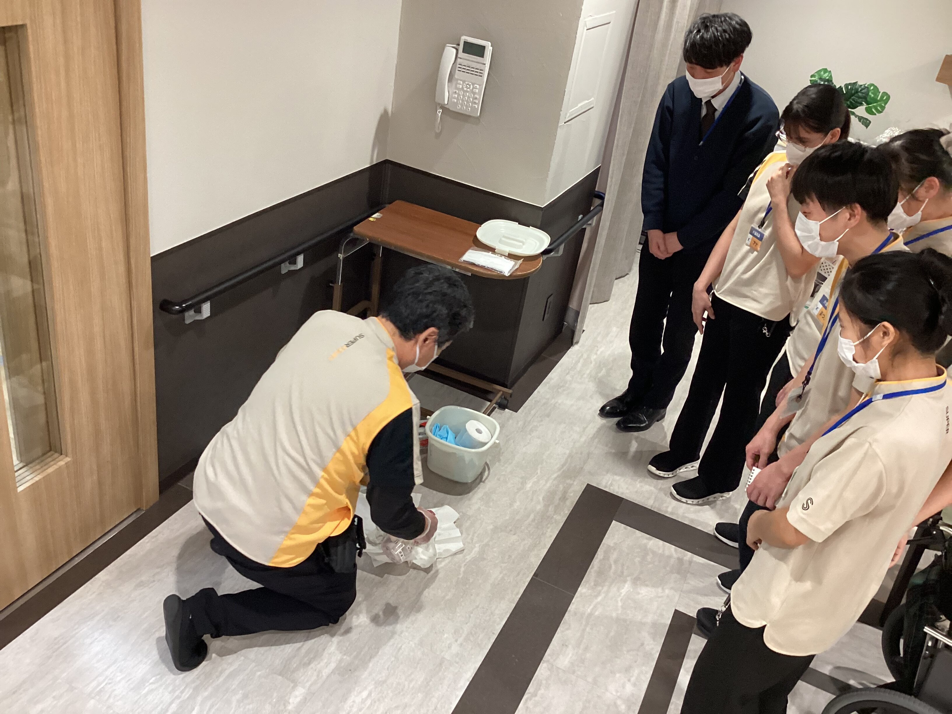 今回は、万が一の事態に備えた「防護服の着脱」や「適切な消毒手順」を実践形式で復習しました。写真のように、ベテランスタッフのお手本を若手スタッフが真剣な眼差しで見守り、一つひとつの動作を確認しています。