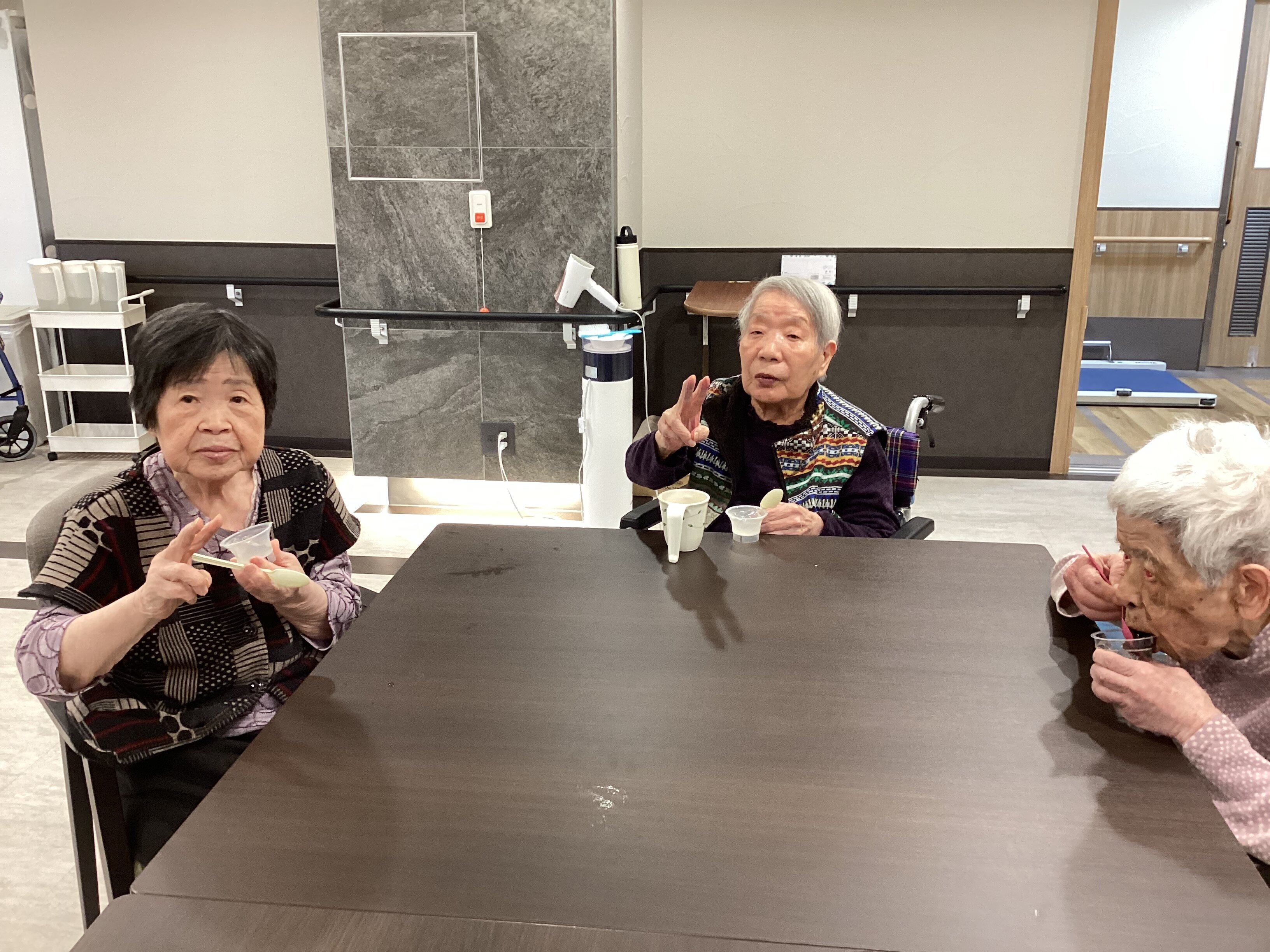 食堂に集まって、ゼリーを召し上がっているところにパシャリ!とカメラを向けると、素敵な笑顔でピースサインをしてくださいました。