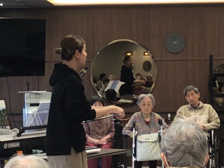 先生のリードに合わせて皆さまが集中して参加されている姿が印象的です。知っている曲を歌うことは、回想法としての側面もあり、脳の活性化や情緒の安定、さらにはリハビリへの意欲向上にも繋がると考えられているそうです。リズムに乗って表情がパッと明るくなる瞬間があり、音楽の持つ力を再確認いたしました。