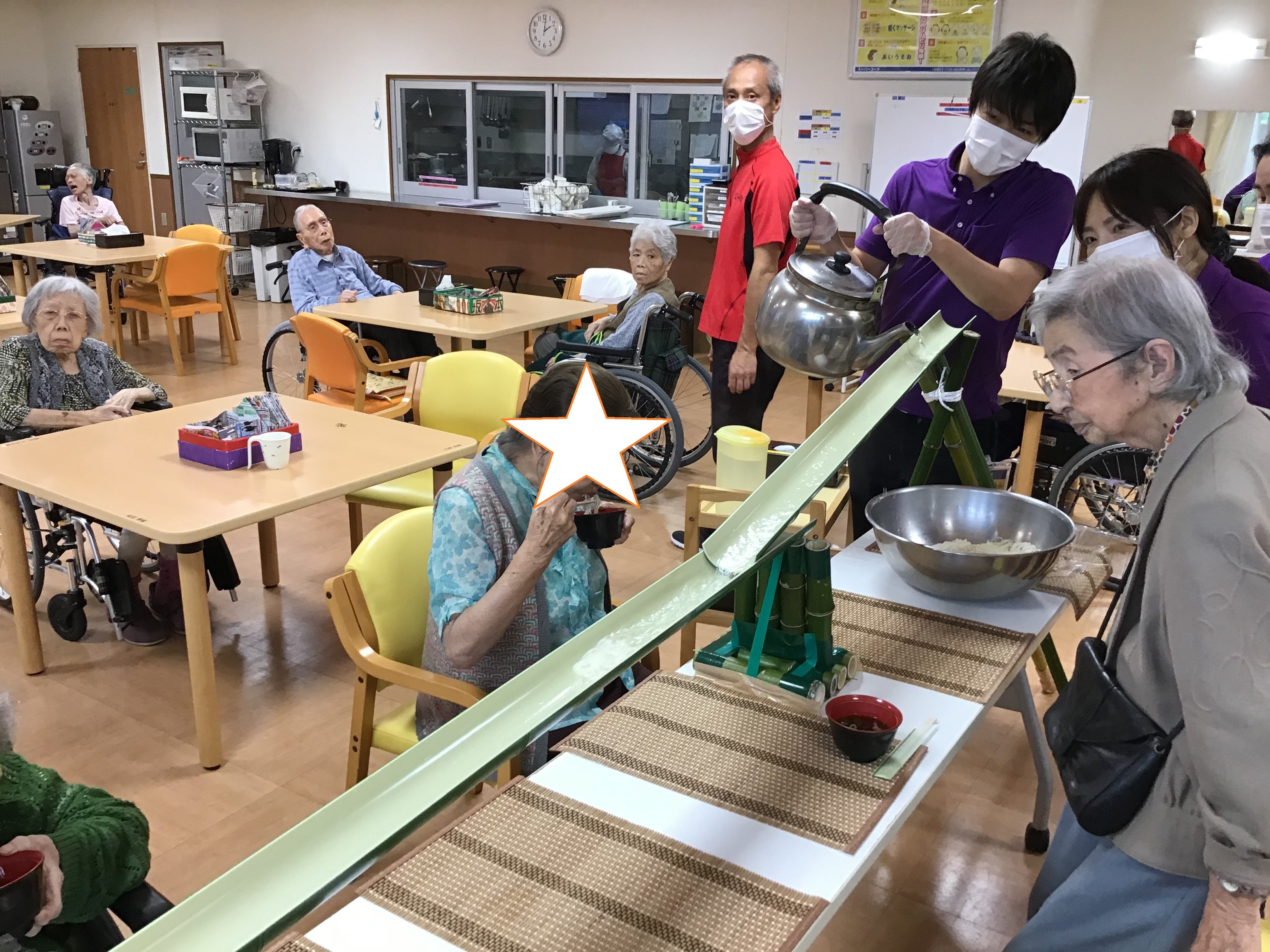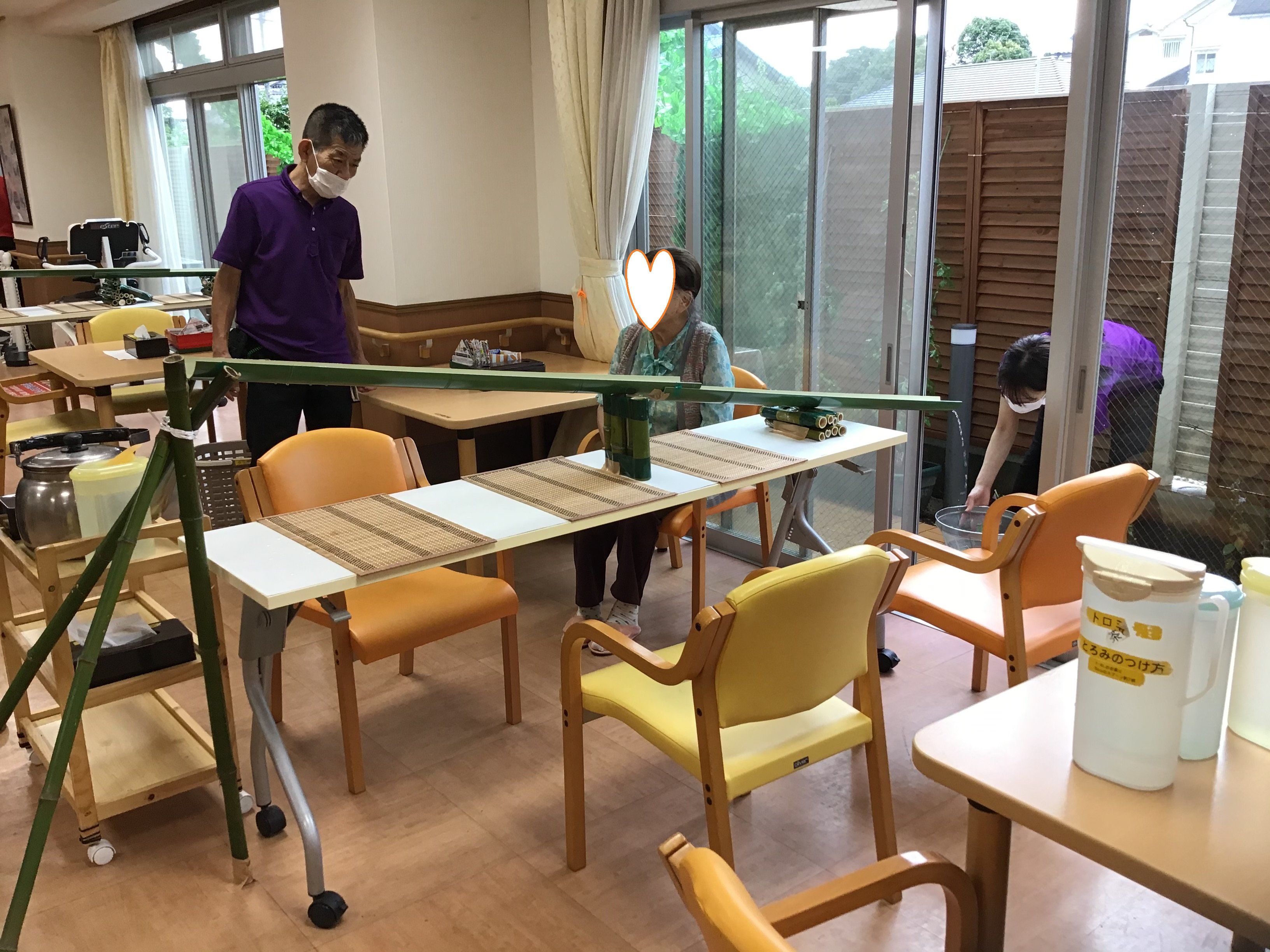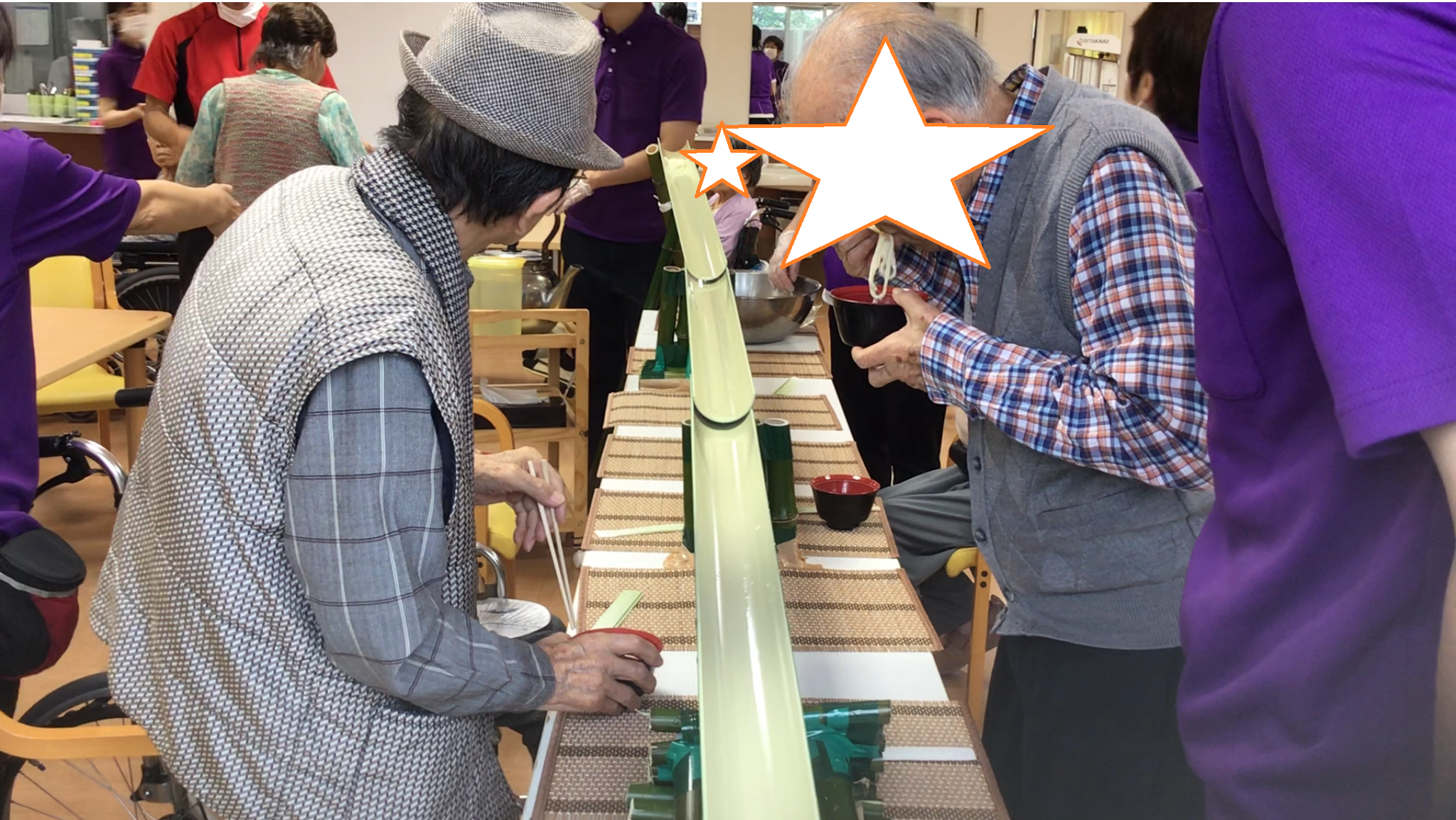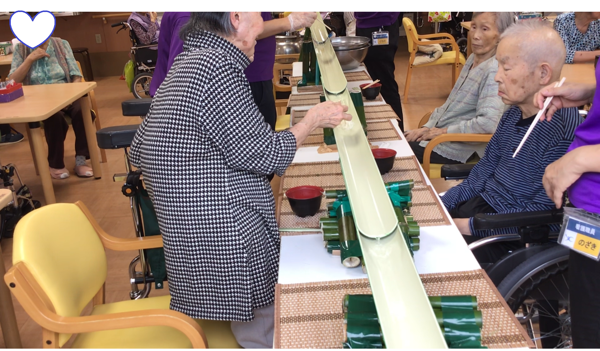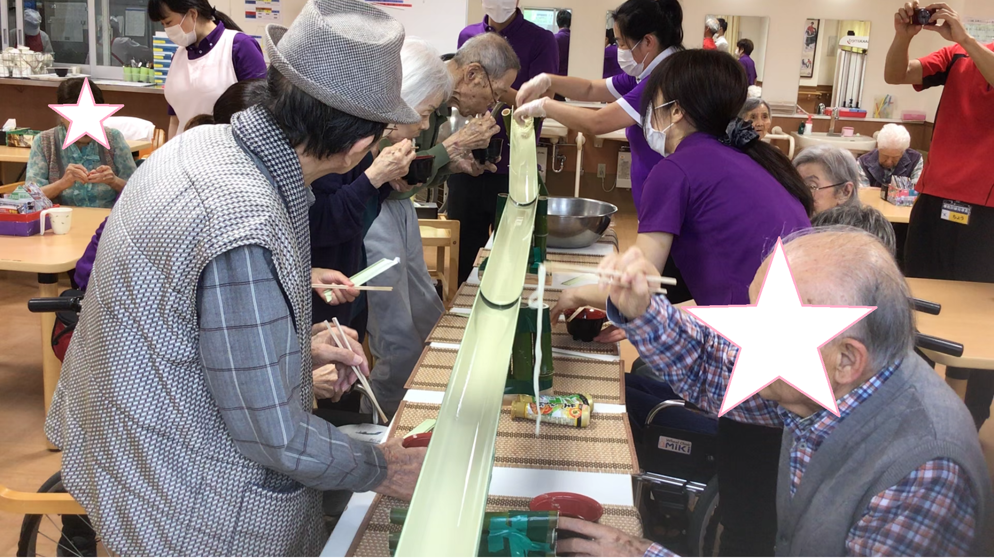 流しそうめん良いですね。ご入居者が前のめりになっていらっしゃいますね。ご入居者の笑顔のために私たちも頑張りたいです!