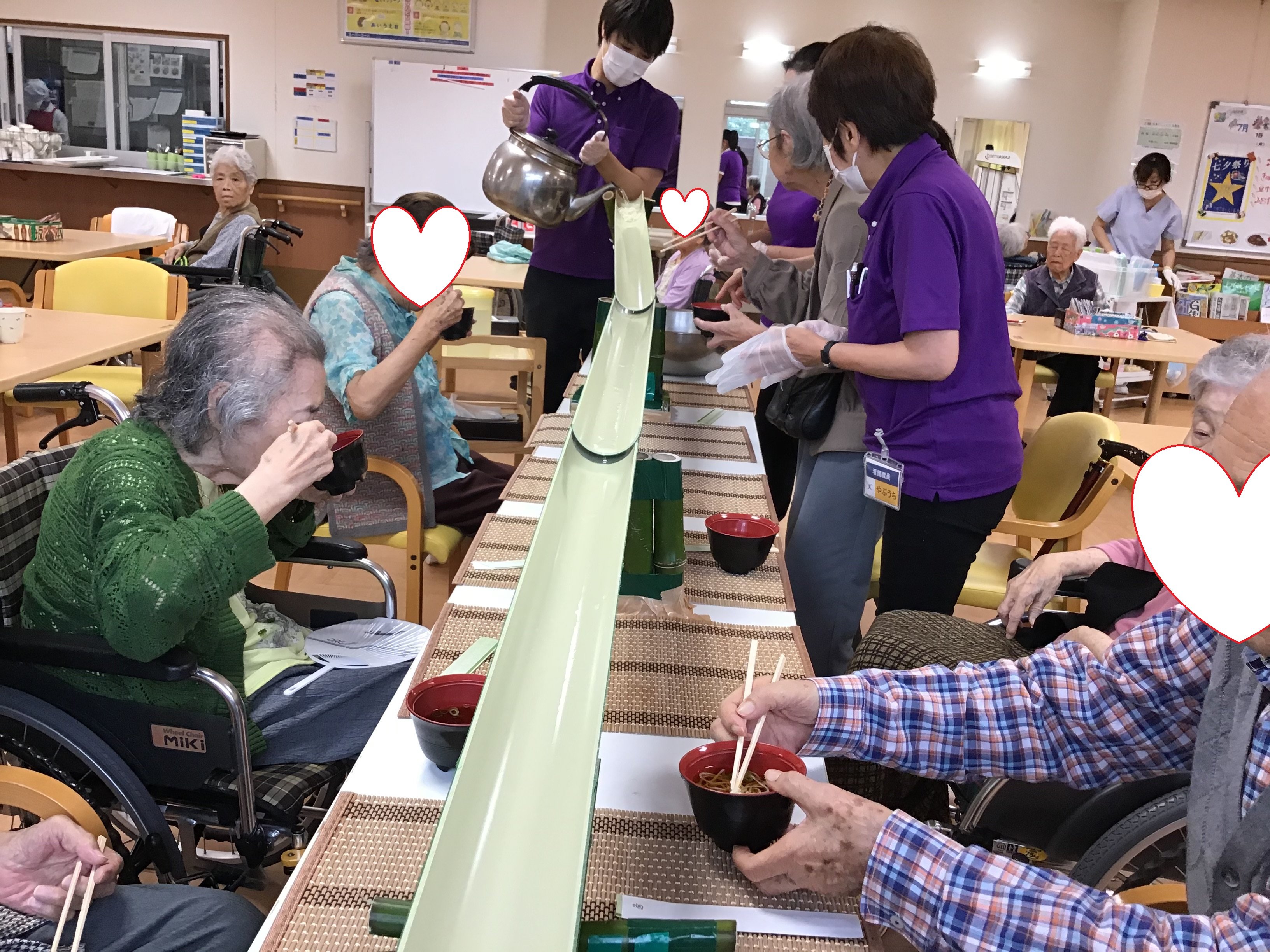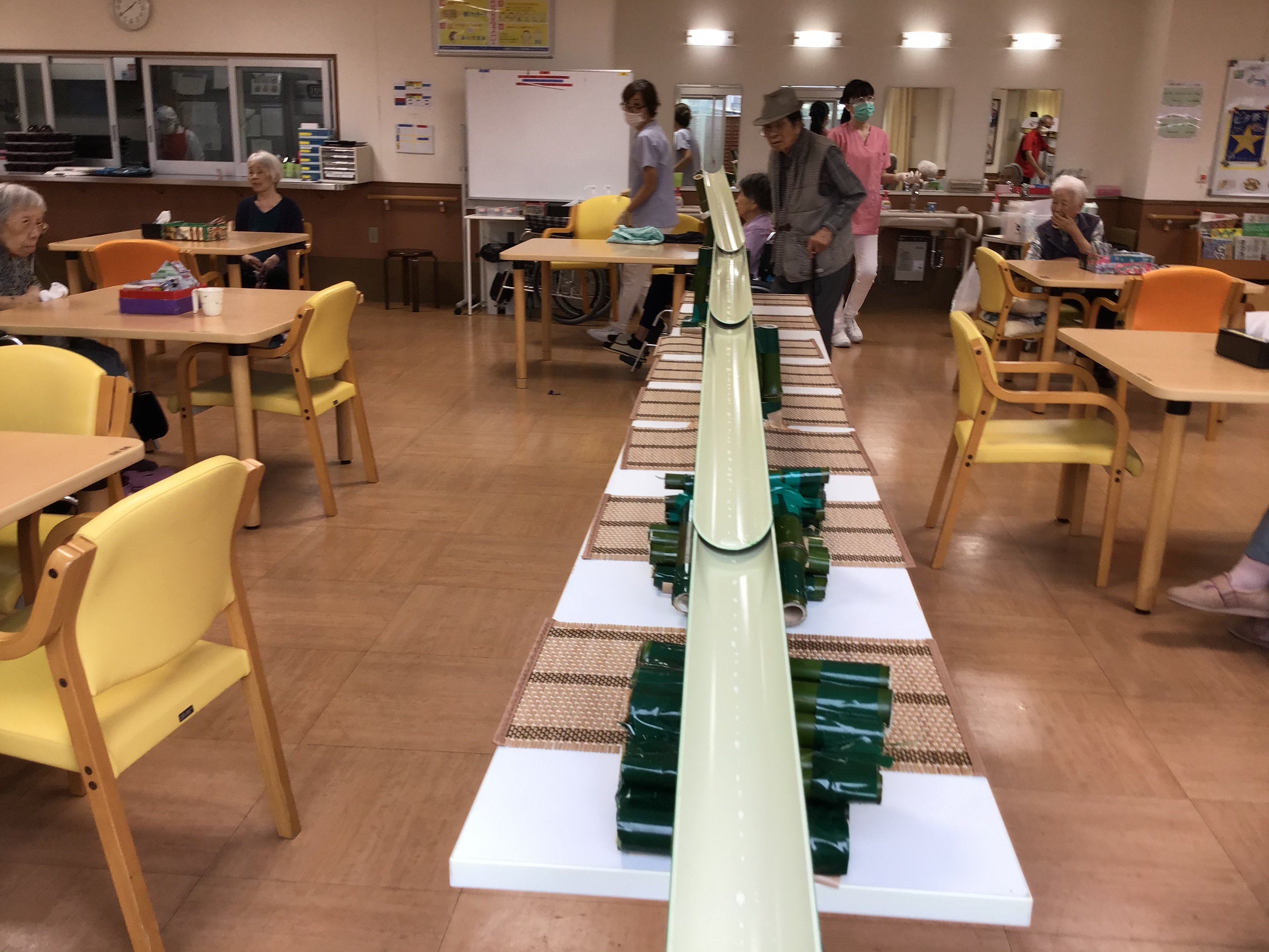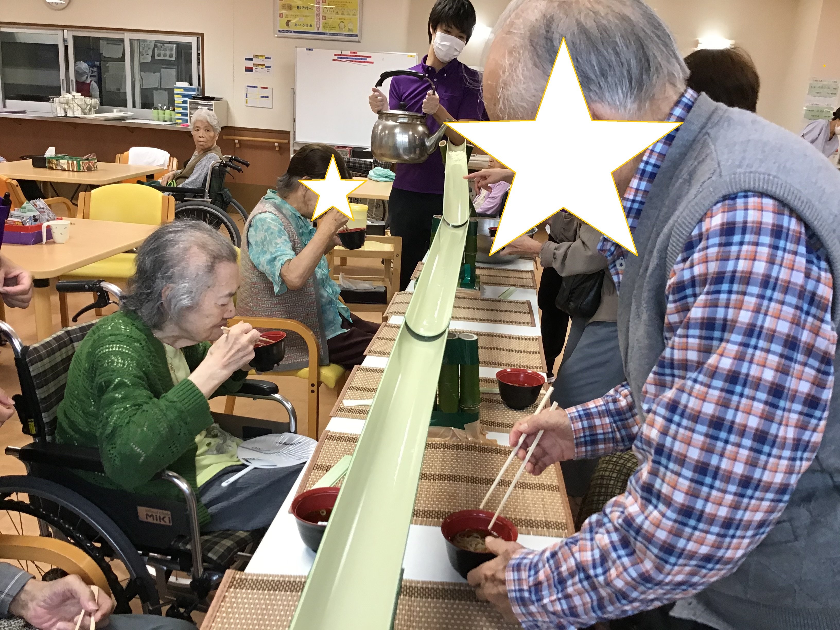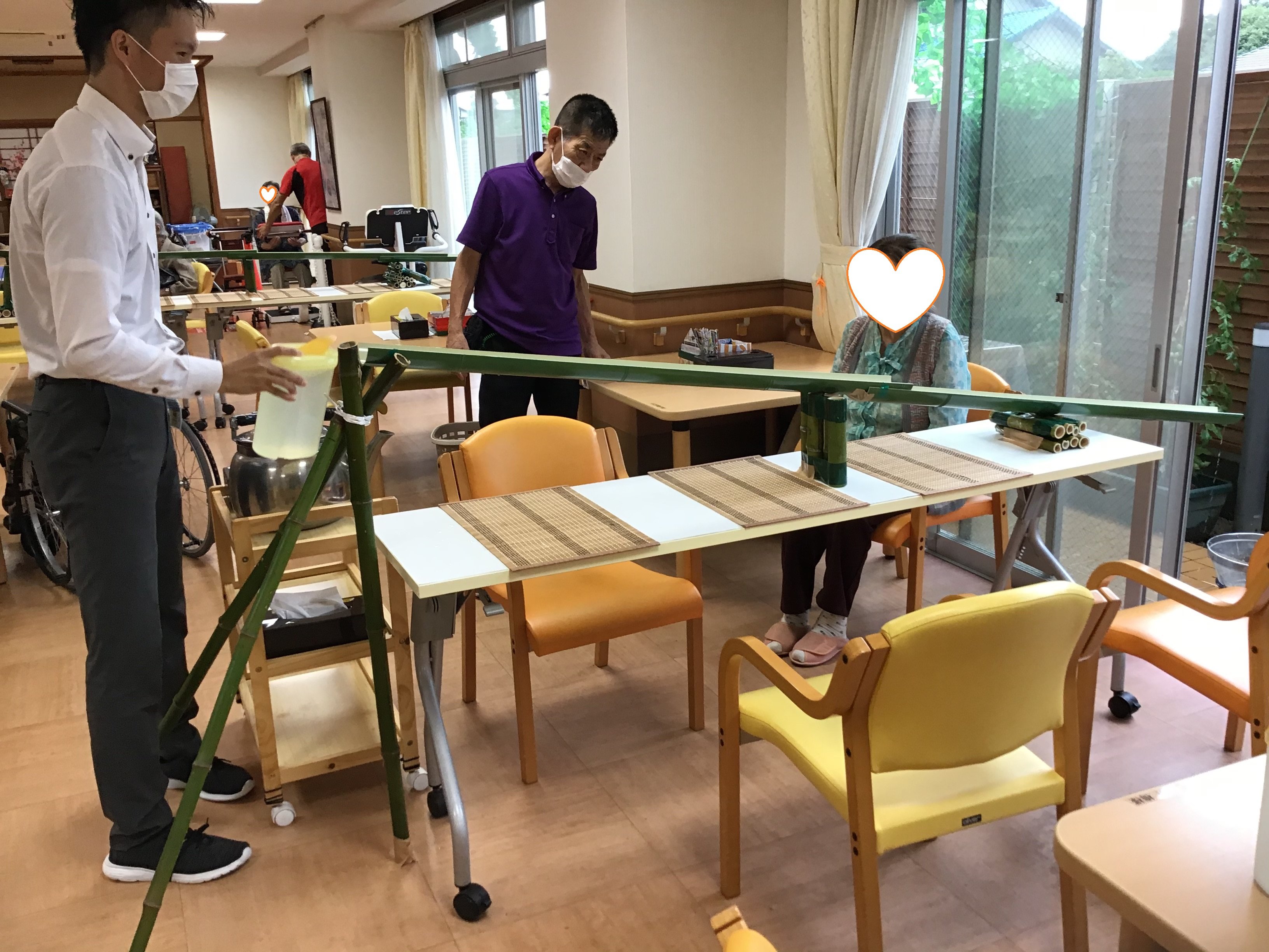 流しそうめん良いですね。ご入居者が前のめりになっていらっしゃいますね。ご入居者の笑顔のために私たちも頑張りたいです!