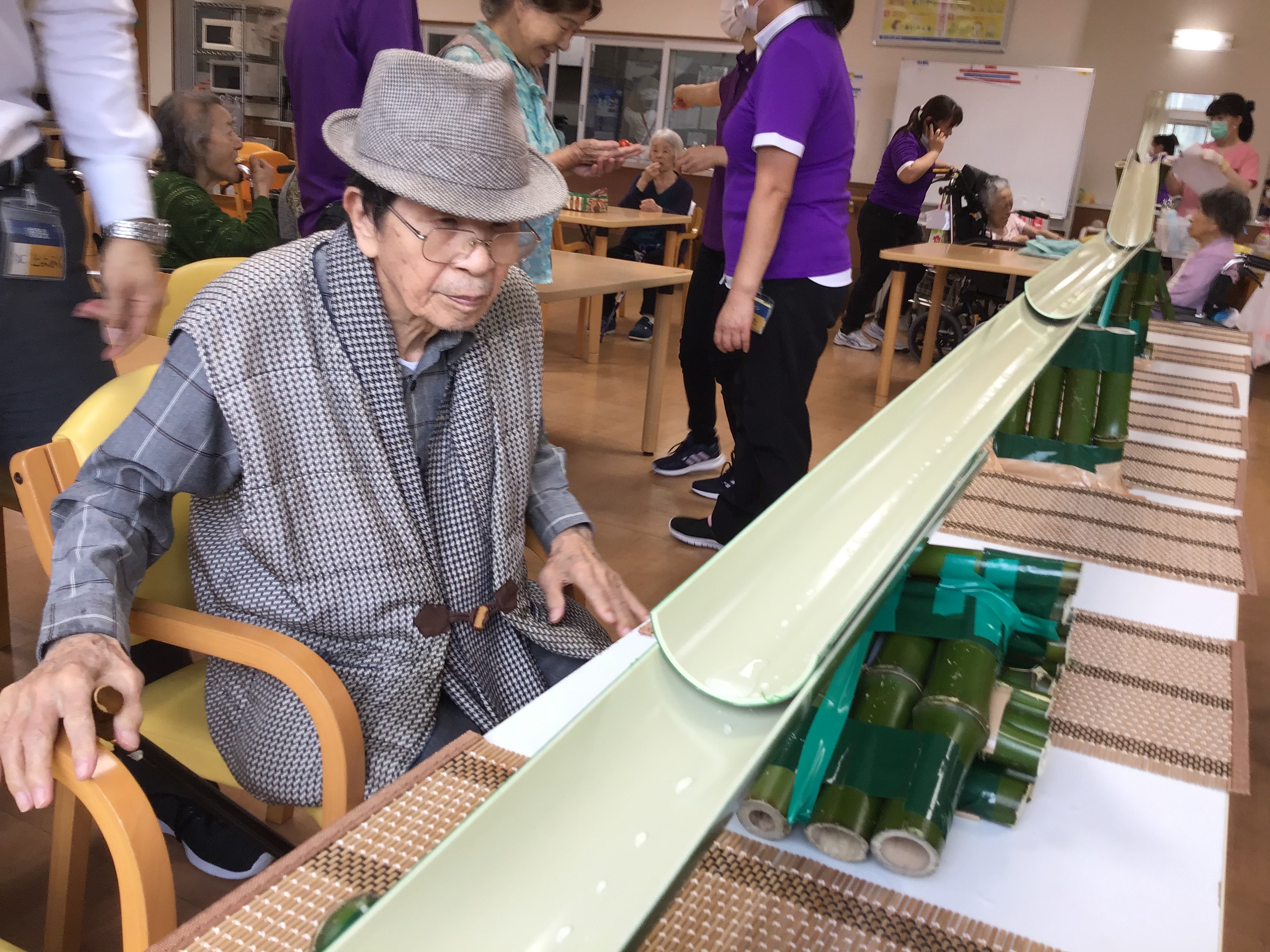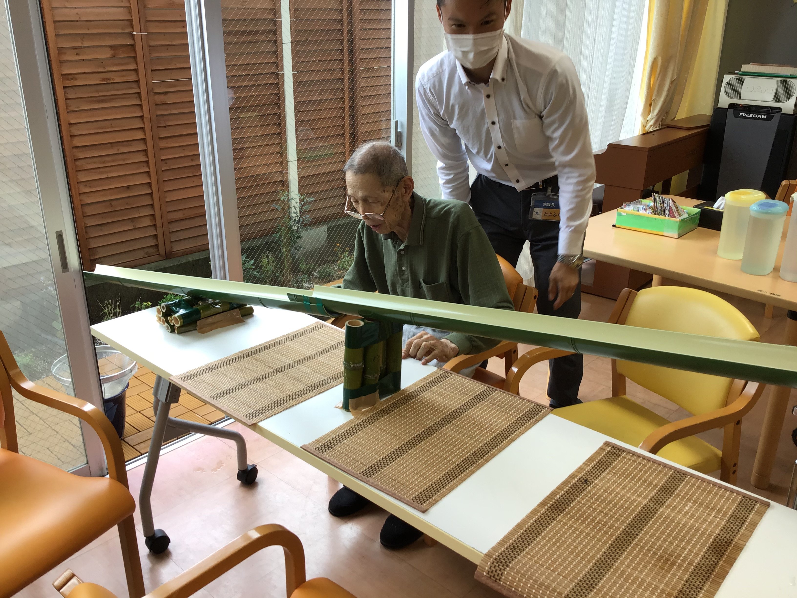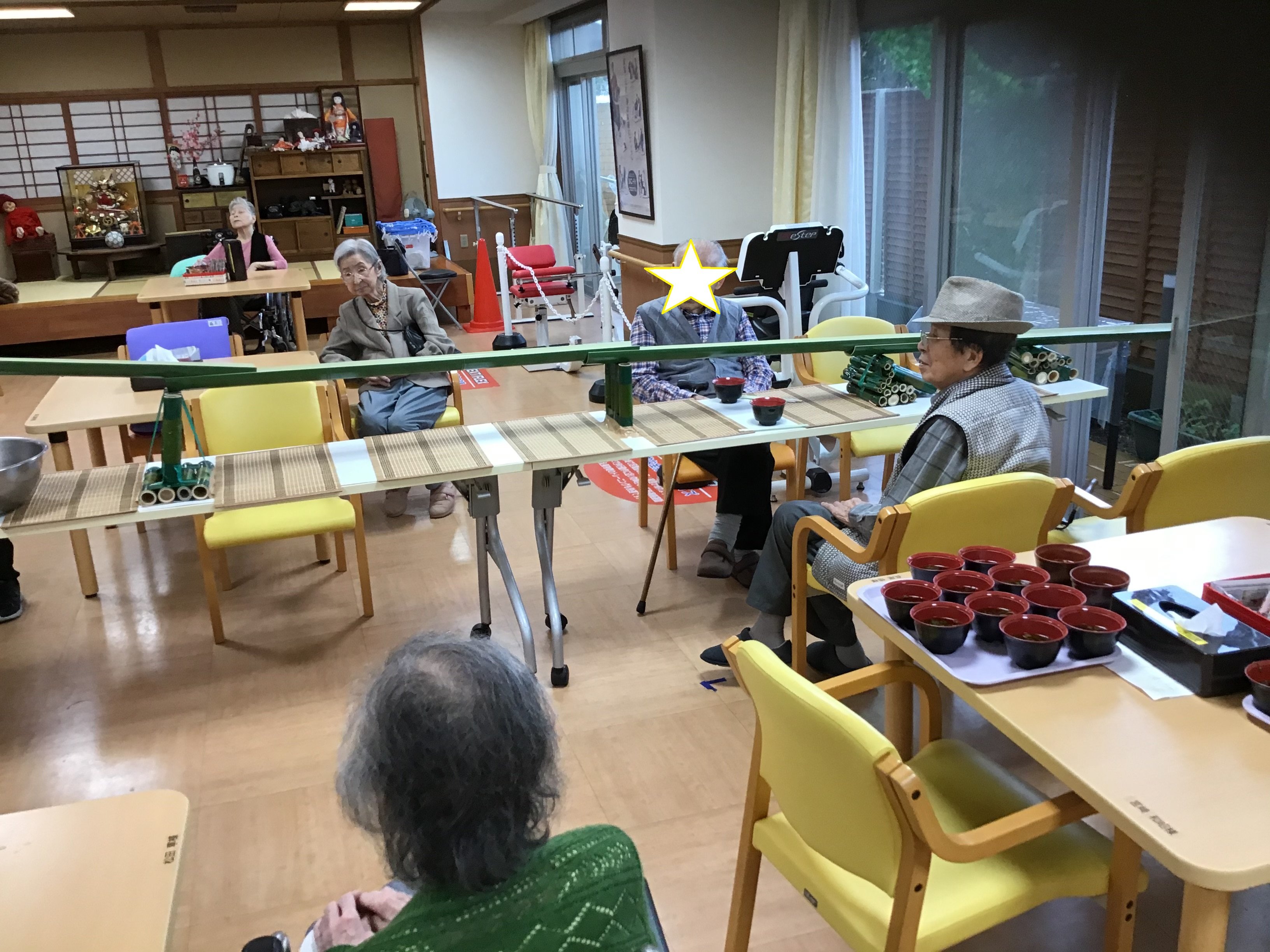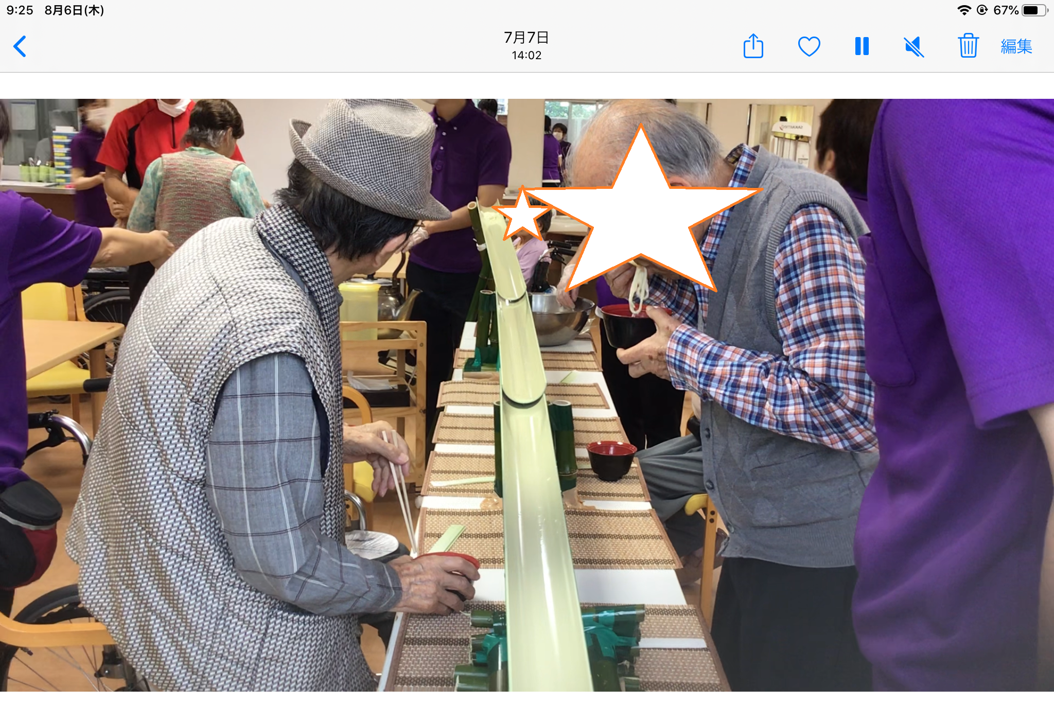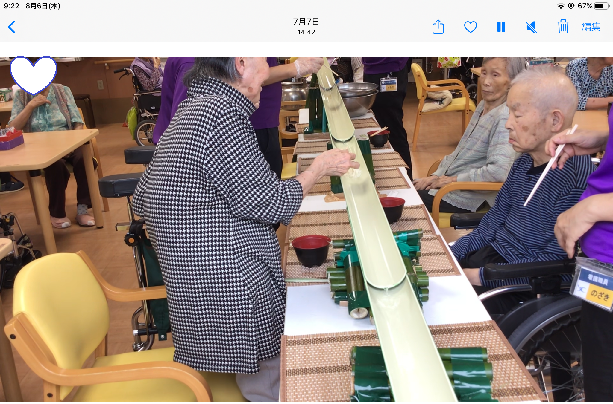 流しそうめん良いですね。ご入居者が前のめりになっていらっしゃいますね。ご入居者の笑顔のために私たちも頑張りたいです!