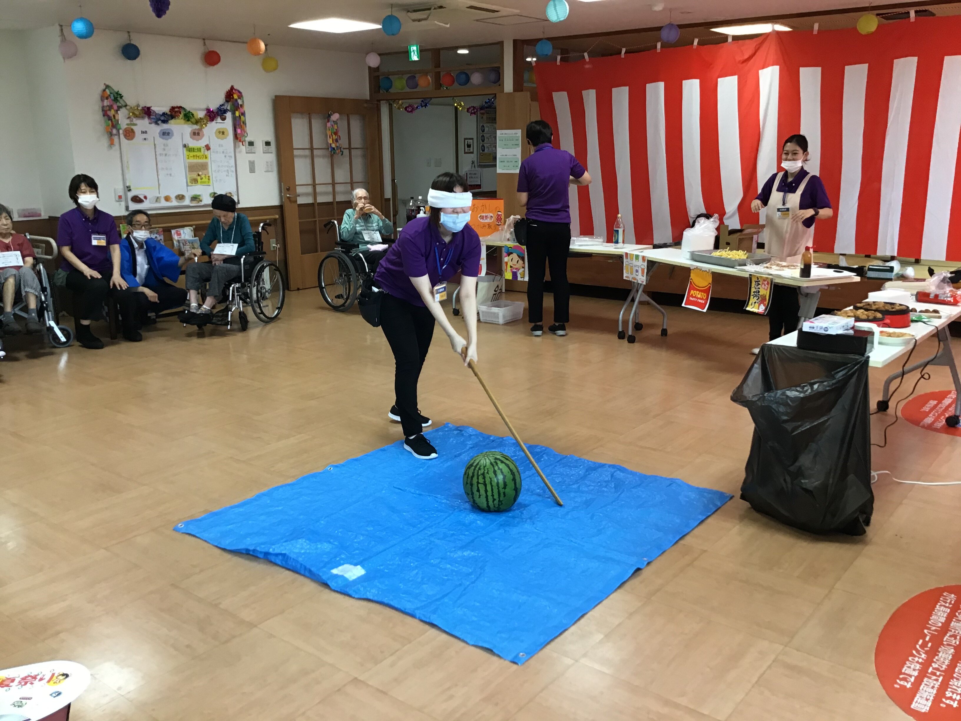 お祭りのメニューが美味しそうでとても楽しそうですね。スイカ割りも本格的で盛り上がりが伝わってきます。