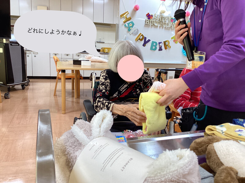 施設からのプレゼントもお渡しします。思い思いに好きなプレゼントを選んで頂きます。