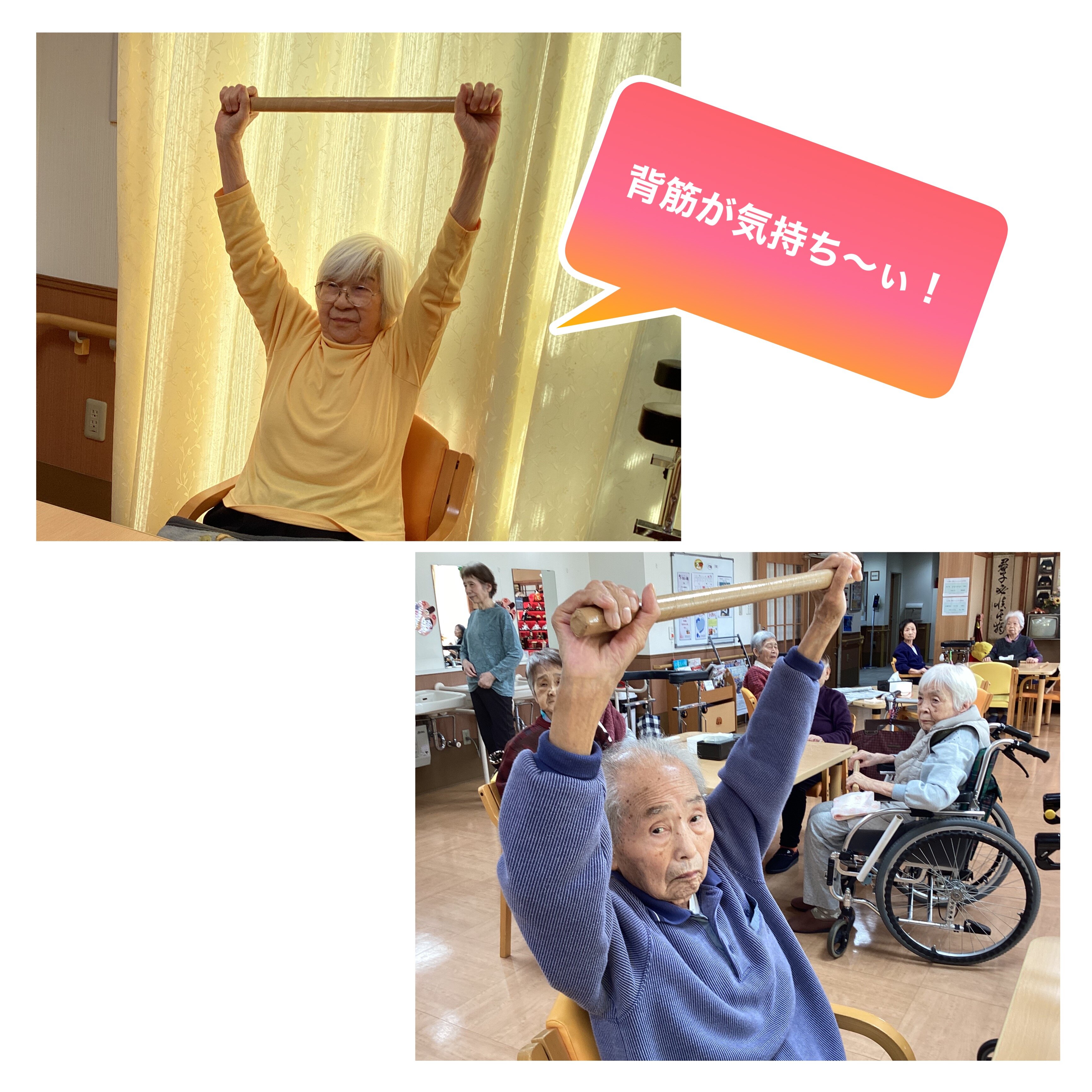 今日はご入居者の皆様に毎回喜んでいただけます棒体操をご紹介します!