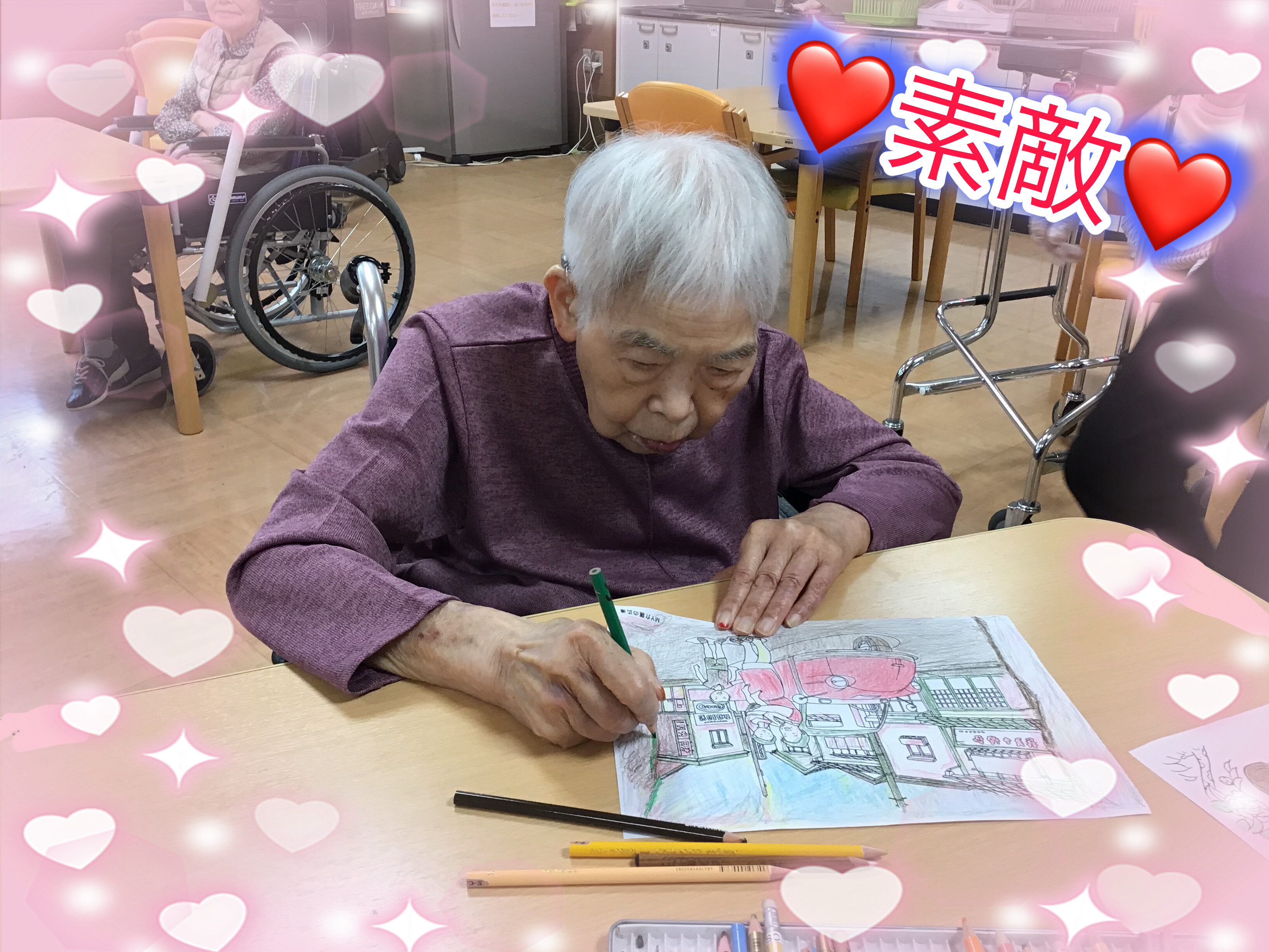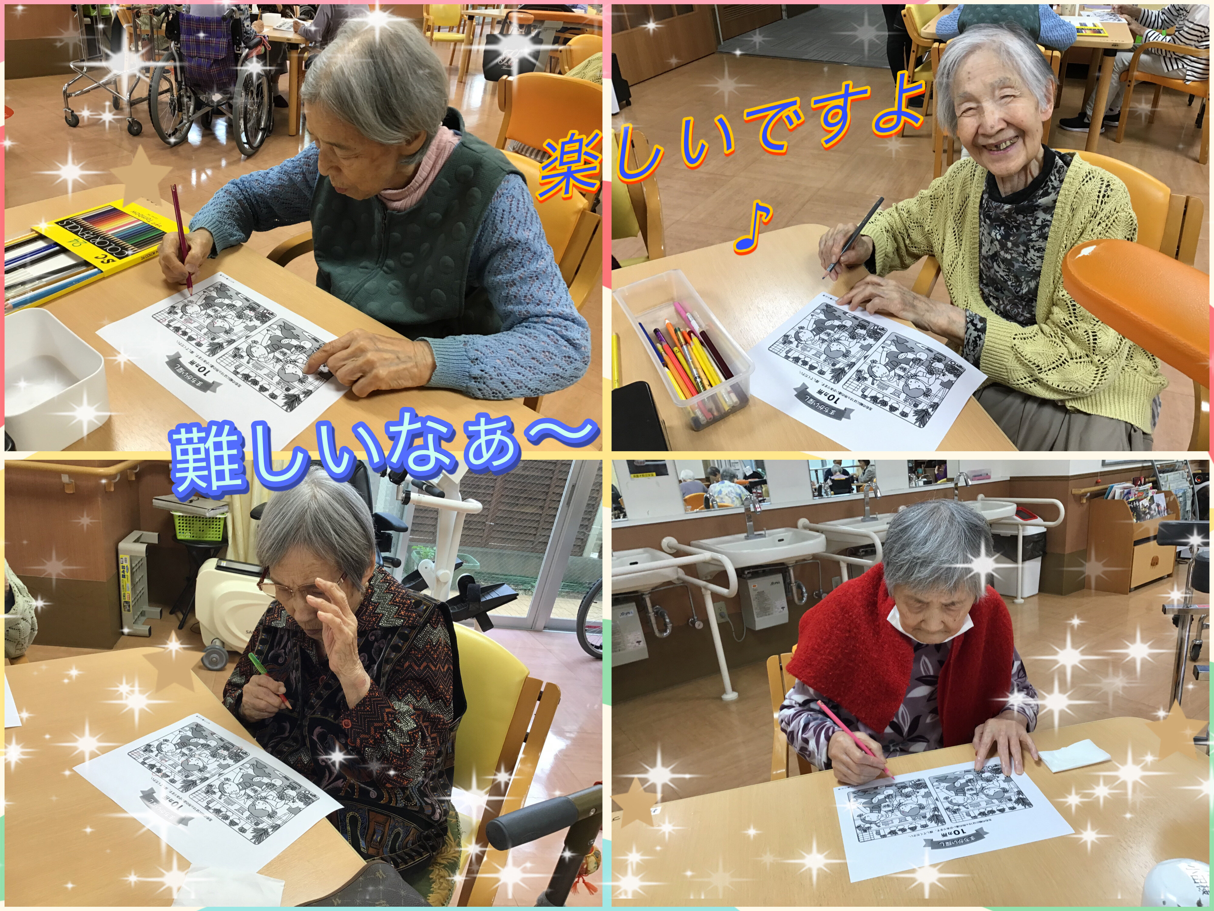 間違い探しが済んだら、モノクロの間違い探しのプリントを塗り絵にされたり、各々で楽しんでいらっしゃいます(^_-)-☆