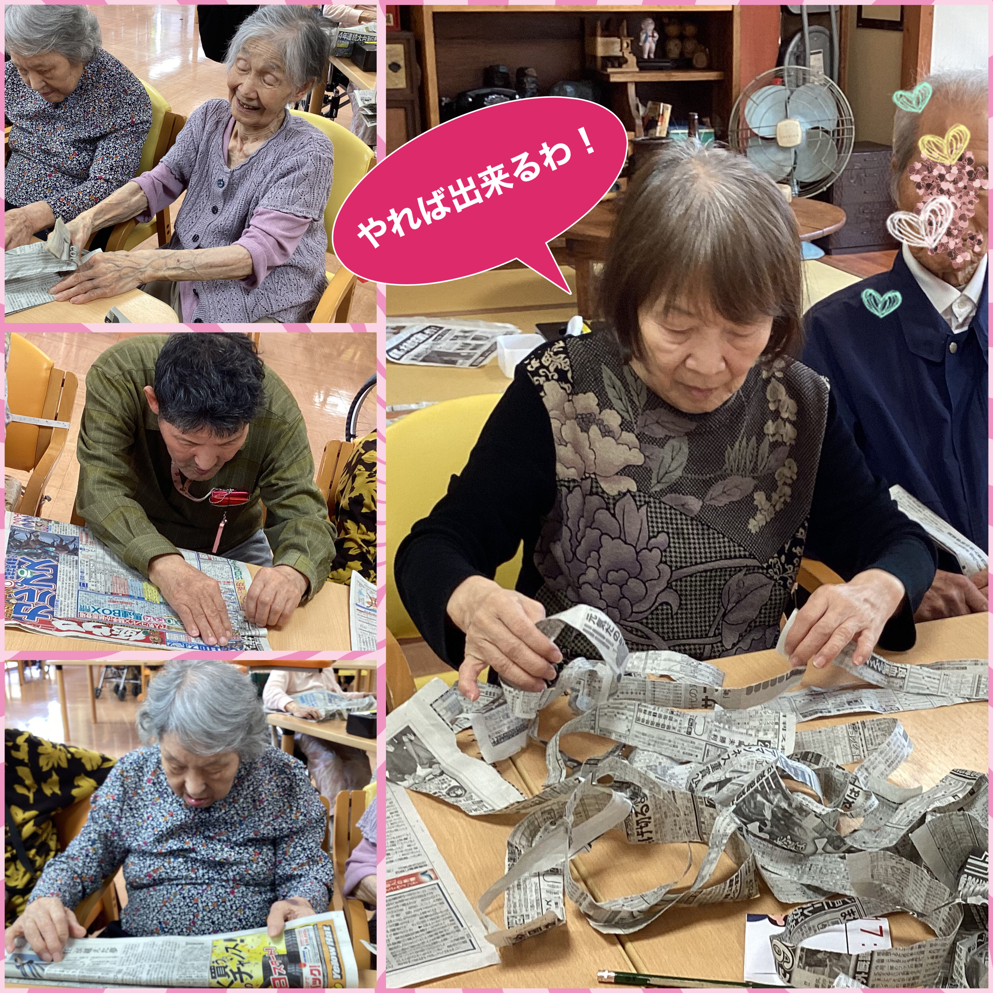 できるだけ新聞を端のほうから細く細かく!手指の運動になりますね!