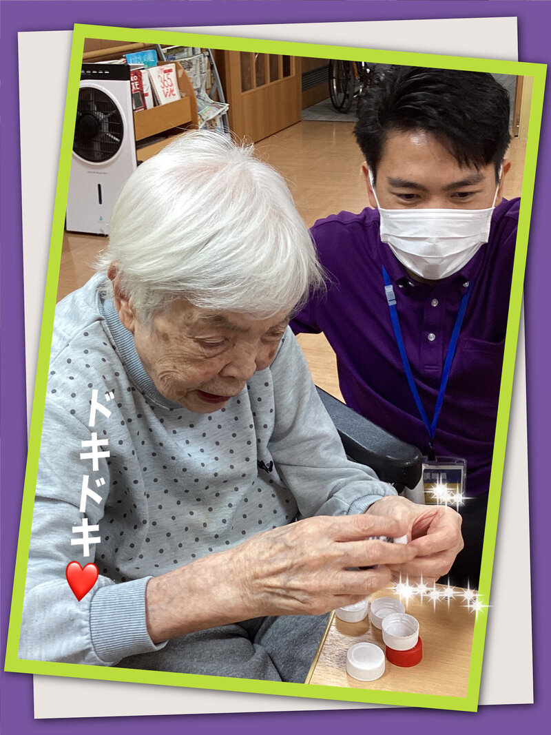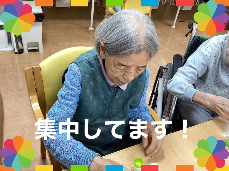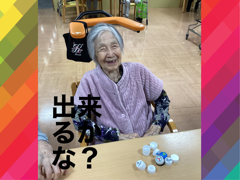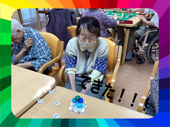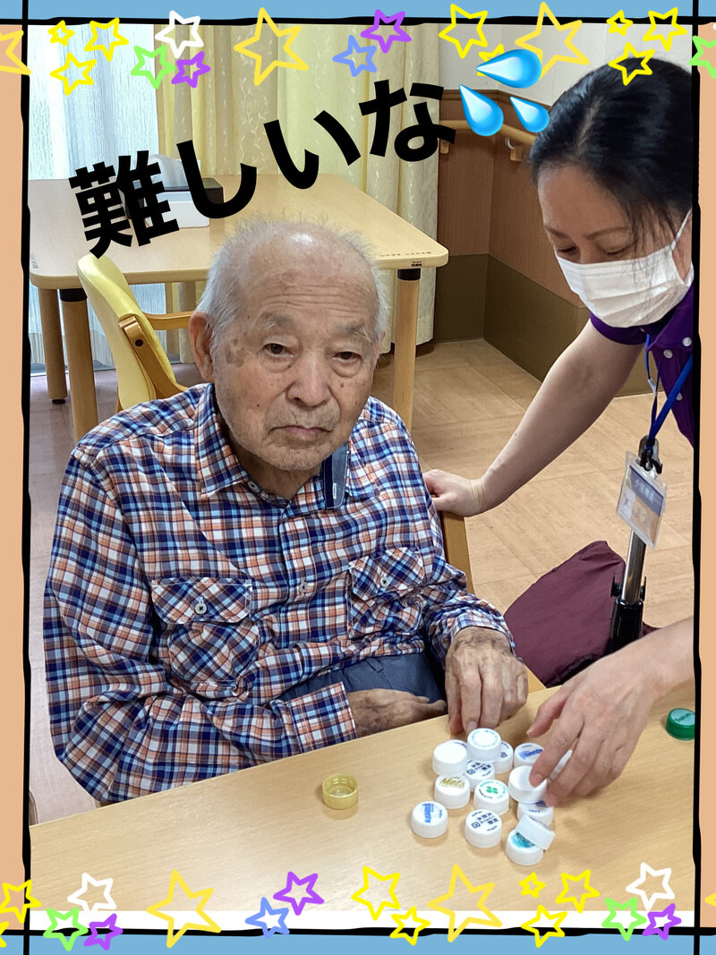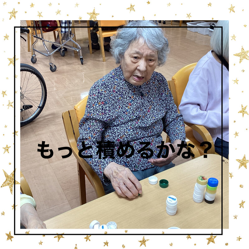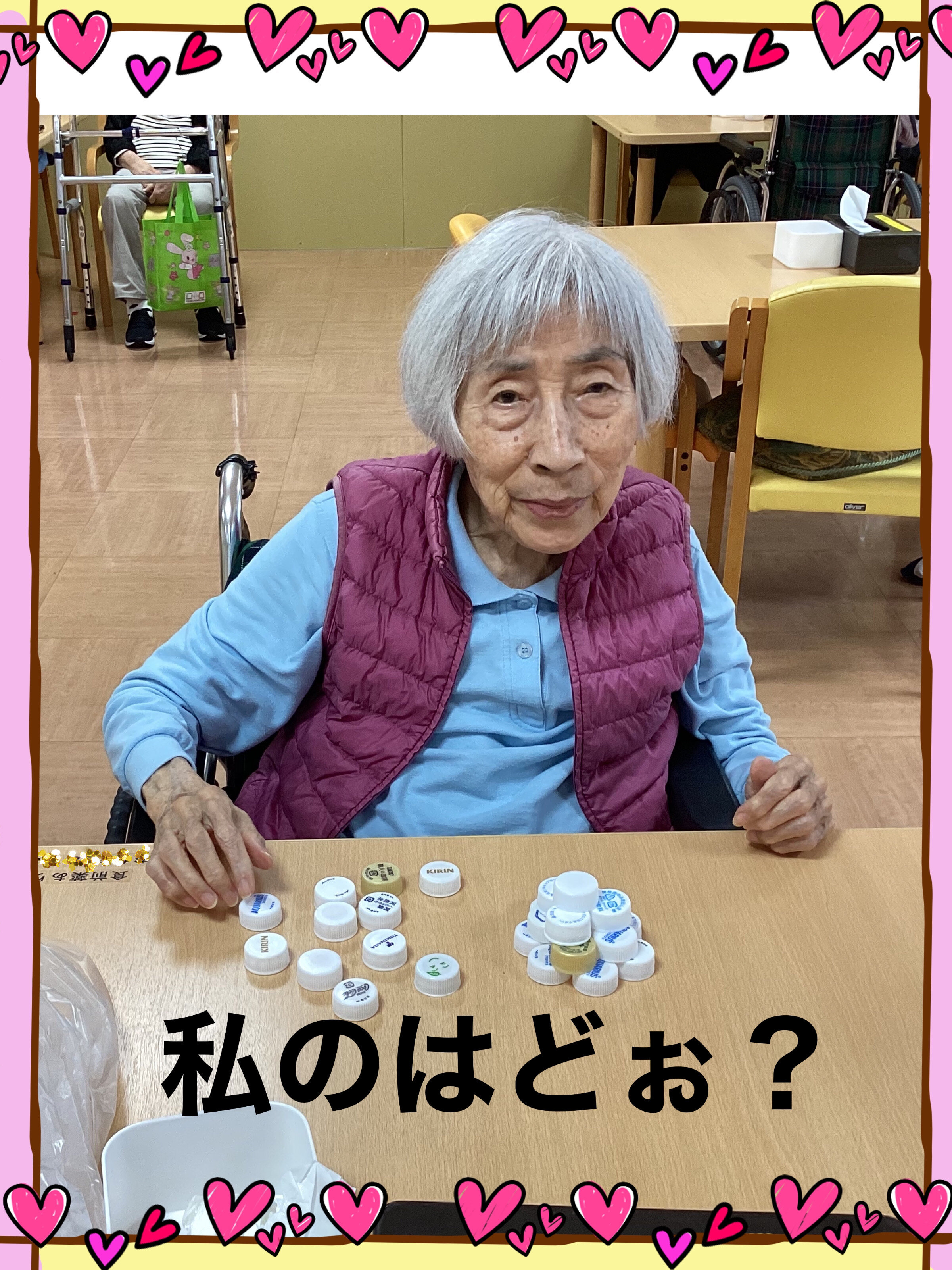 本日のレクリエーションは、施設で集めているペットボトルの蓋を使った手先ゲーム。