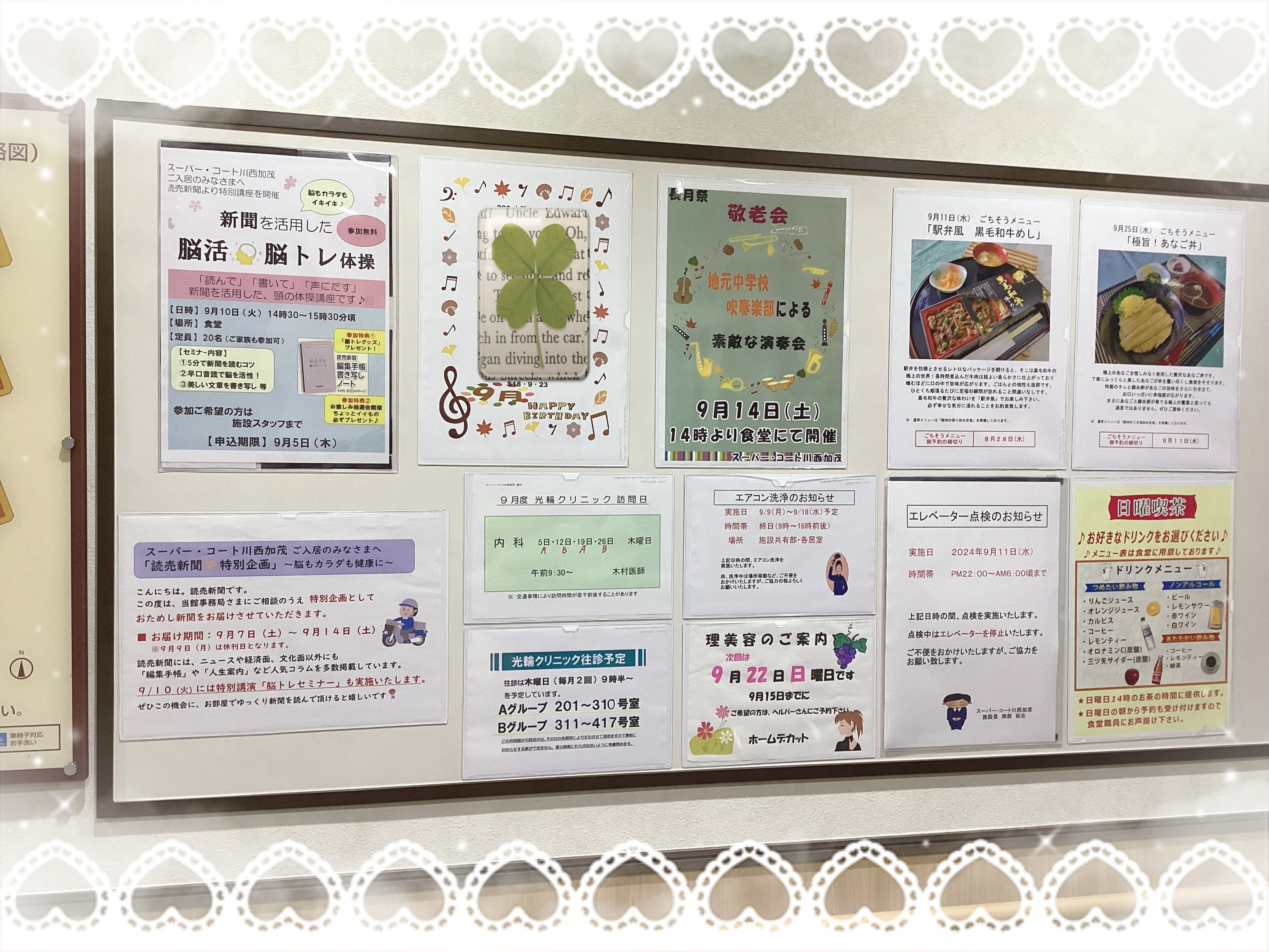 ご入居者の皆様もインフォメーションボードをご覧になりイベントを楽しみにしていらっしゃる方や理美容のお知らせをご覧になり予約される方もいらっしゃいます。