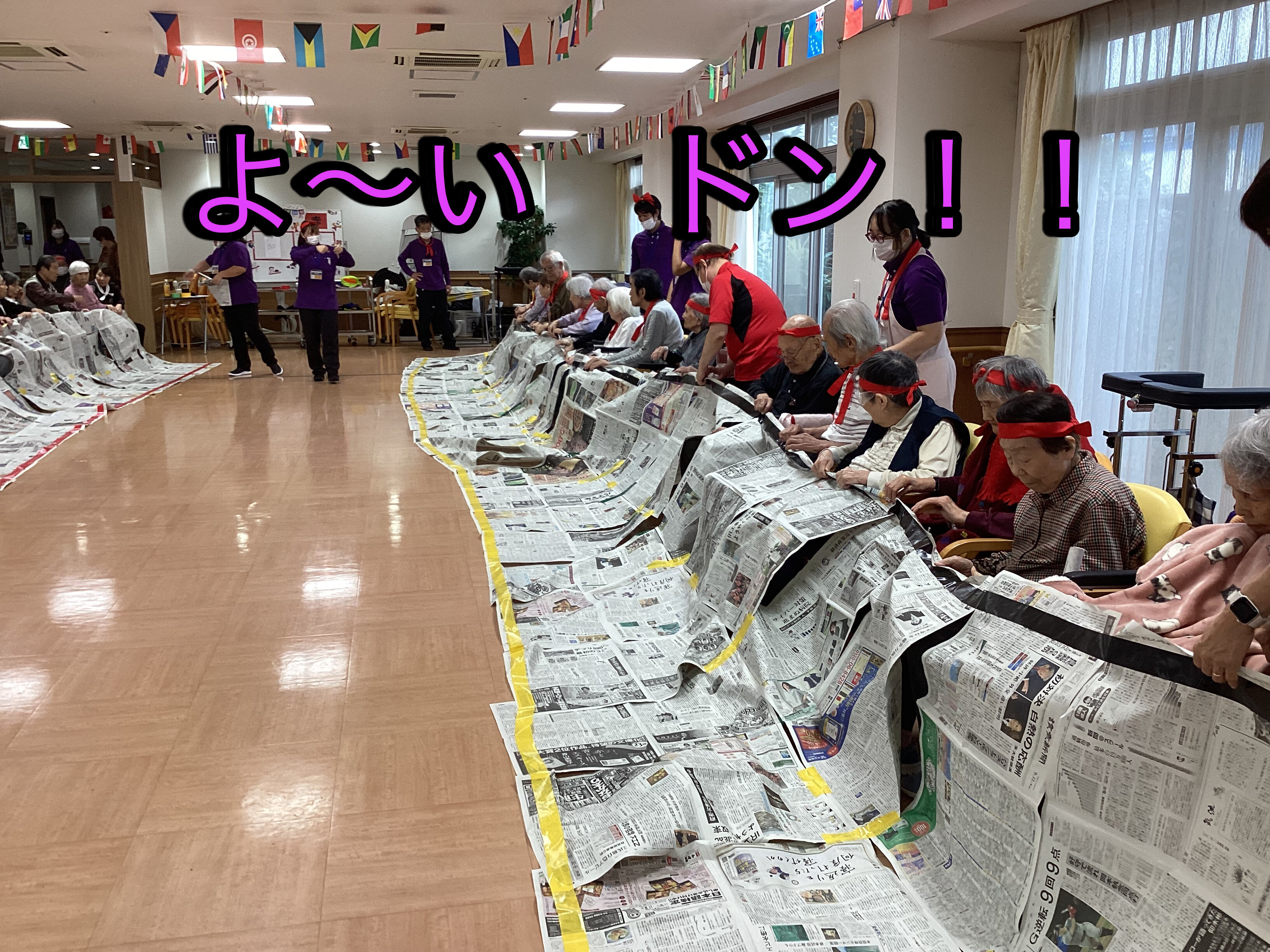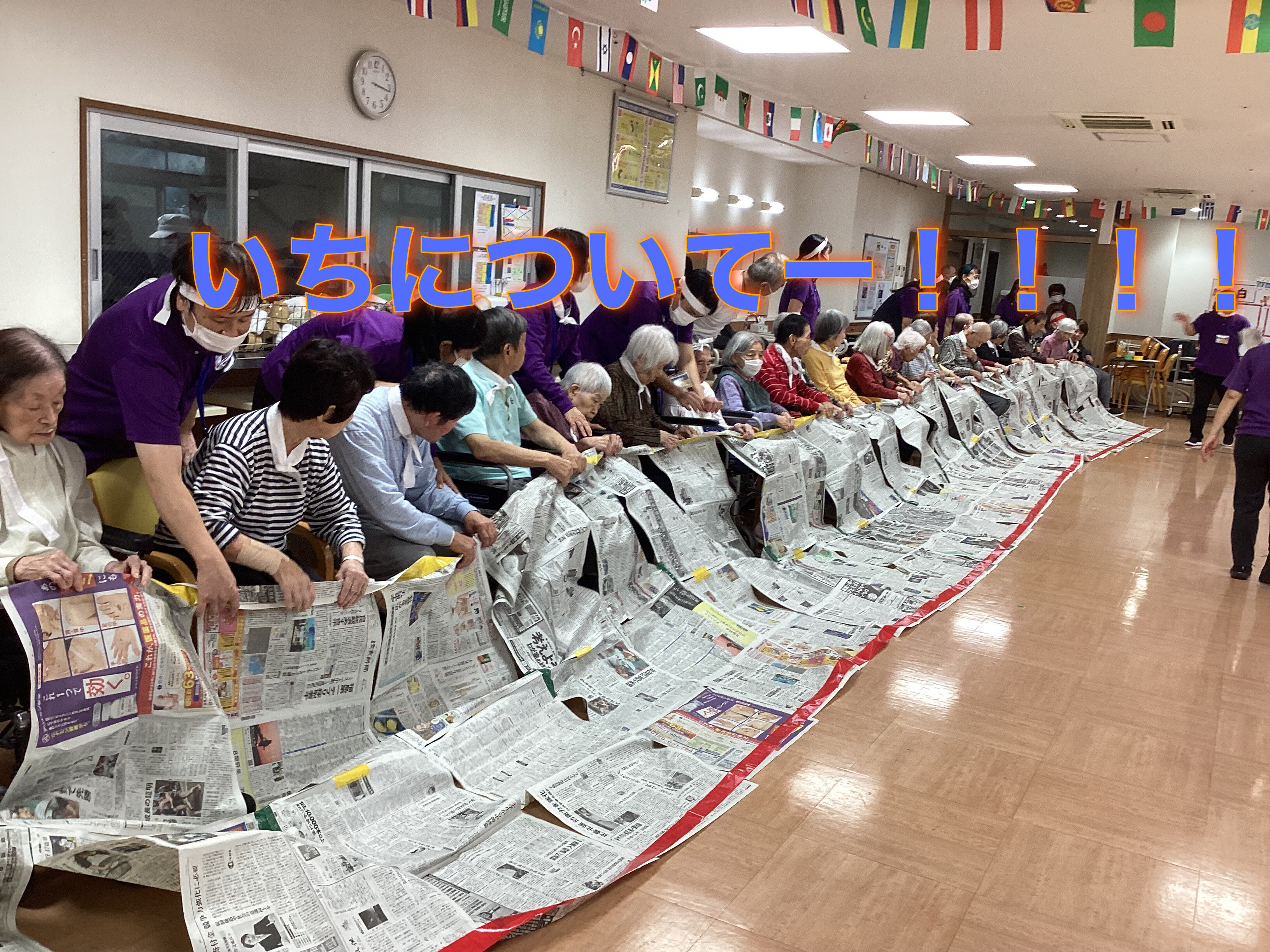 ・巨大新聞紙をチーム一体となって早く巻いた方が勝ち!!