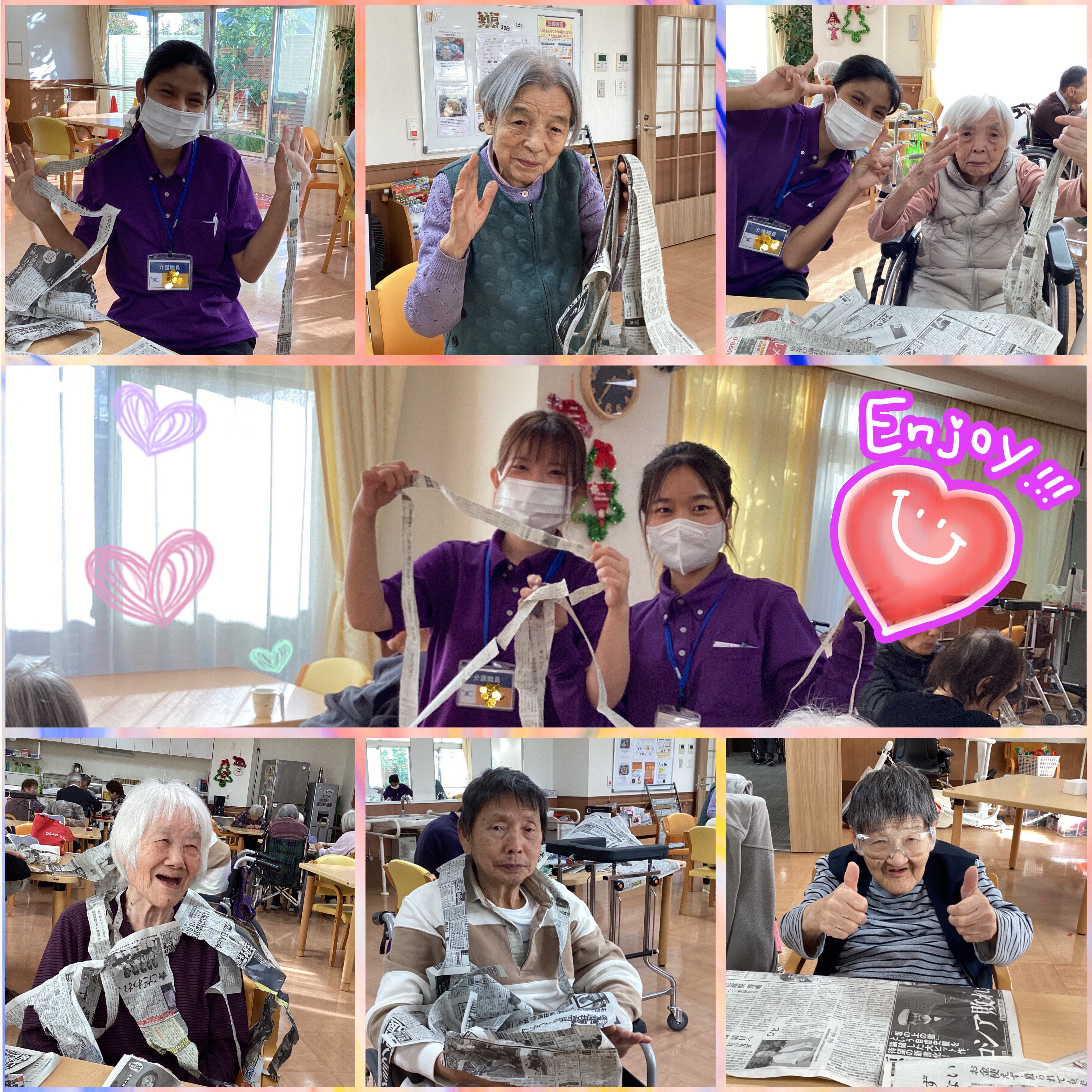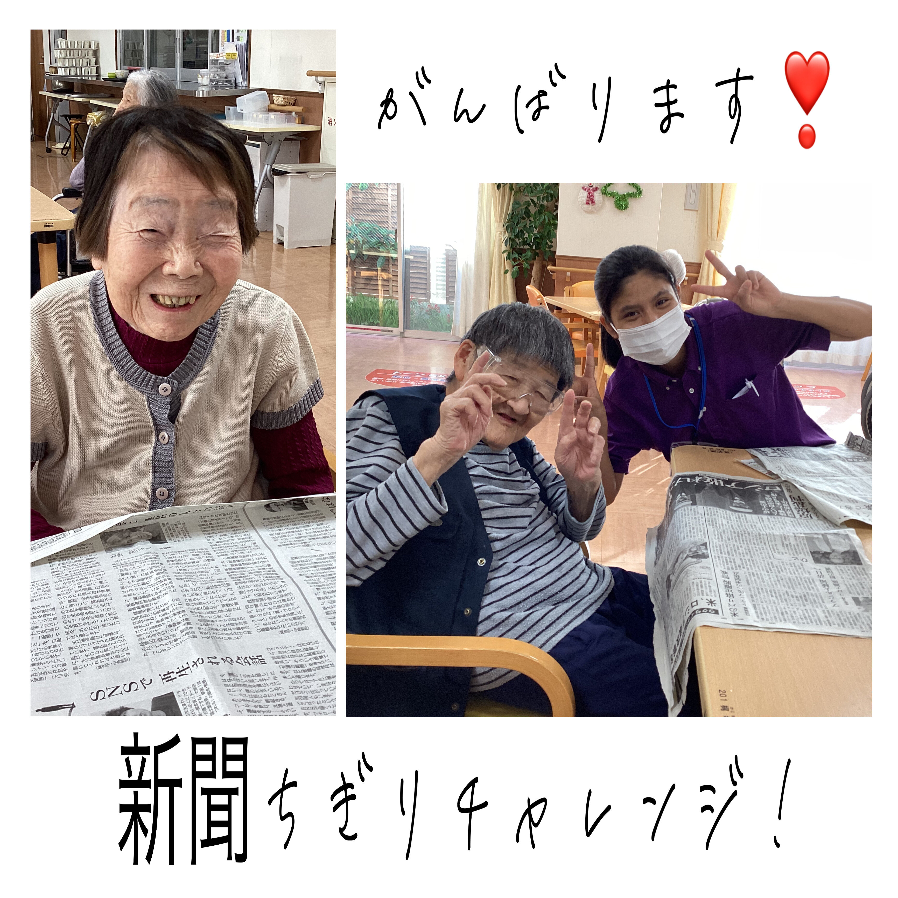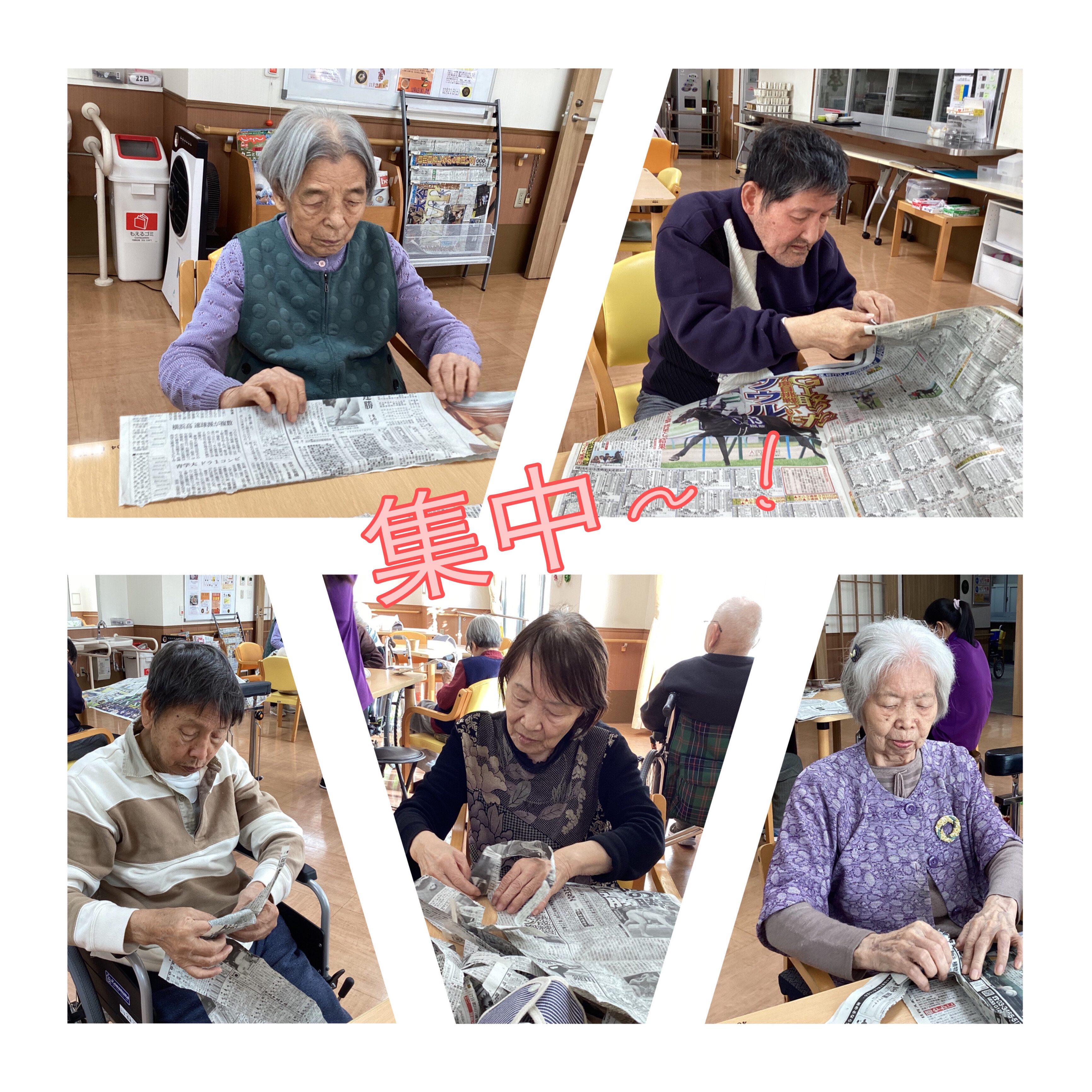 こんにちは!今日は、定番レクリエーションになりつつある新聞ちぎりの様子をお伝えします。読んで楽しく!ちぎって楽しく!再利用~!^^ちぎれないよう皆さん工夫して割いてくださってます。なが~くちぎれましたよ!ぐるぐる~巻けました!イキイキした生活リズムはいいですね!次回もお楽しみに~☆彡