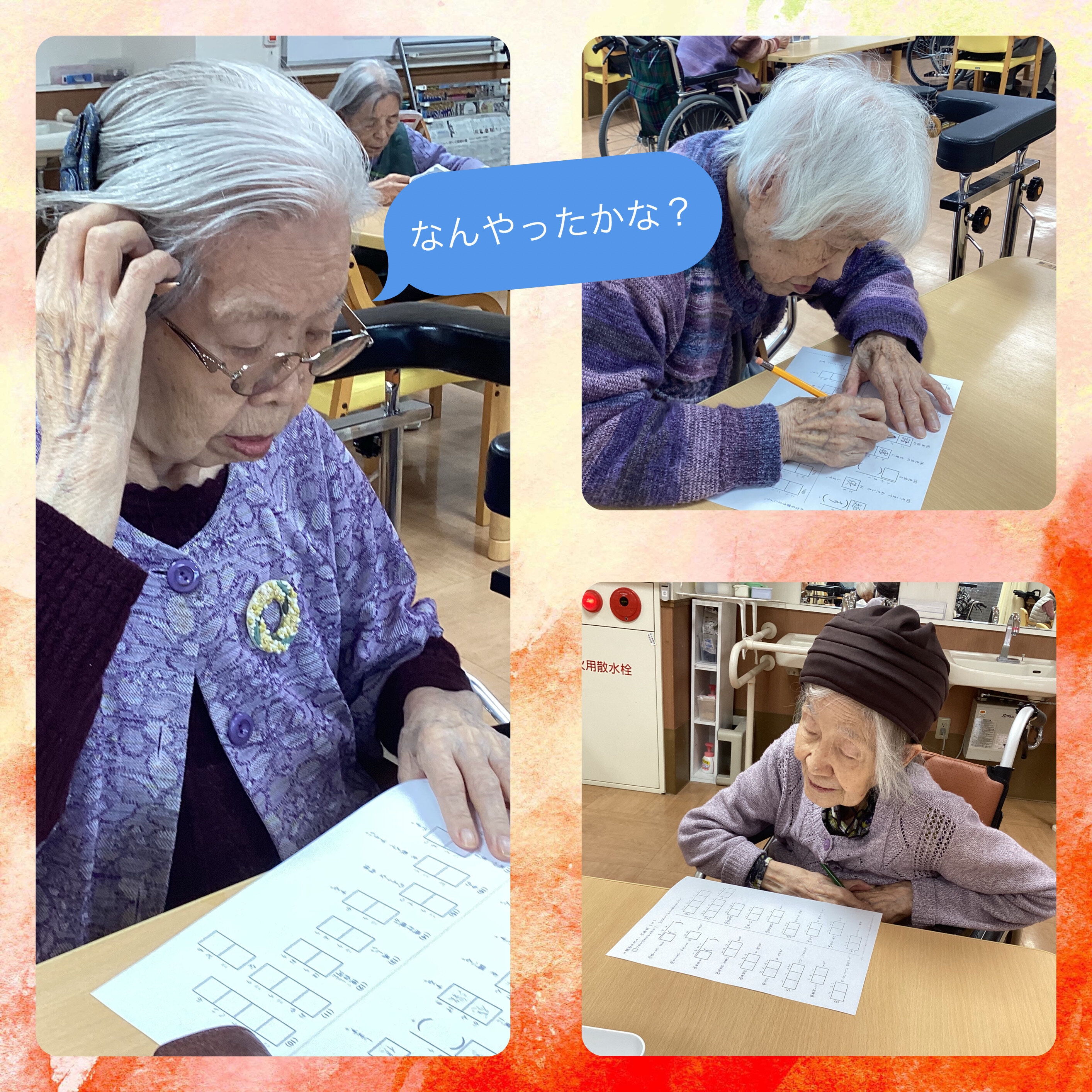 「お姉ちゃん、答え教えて!」「どんな漢字やったかな?」と思い出せず職員や入居者同士ワイワイ相談しながら問題を解いていらっしゃいました。