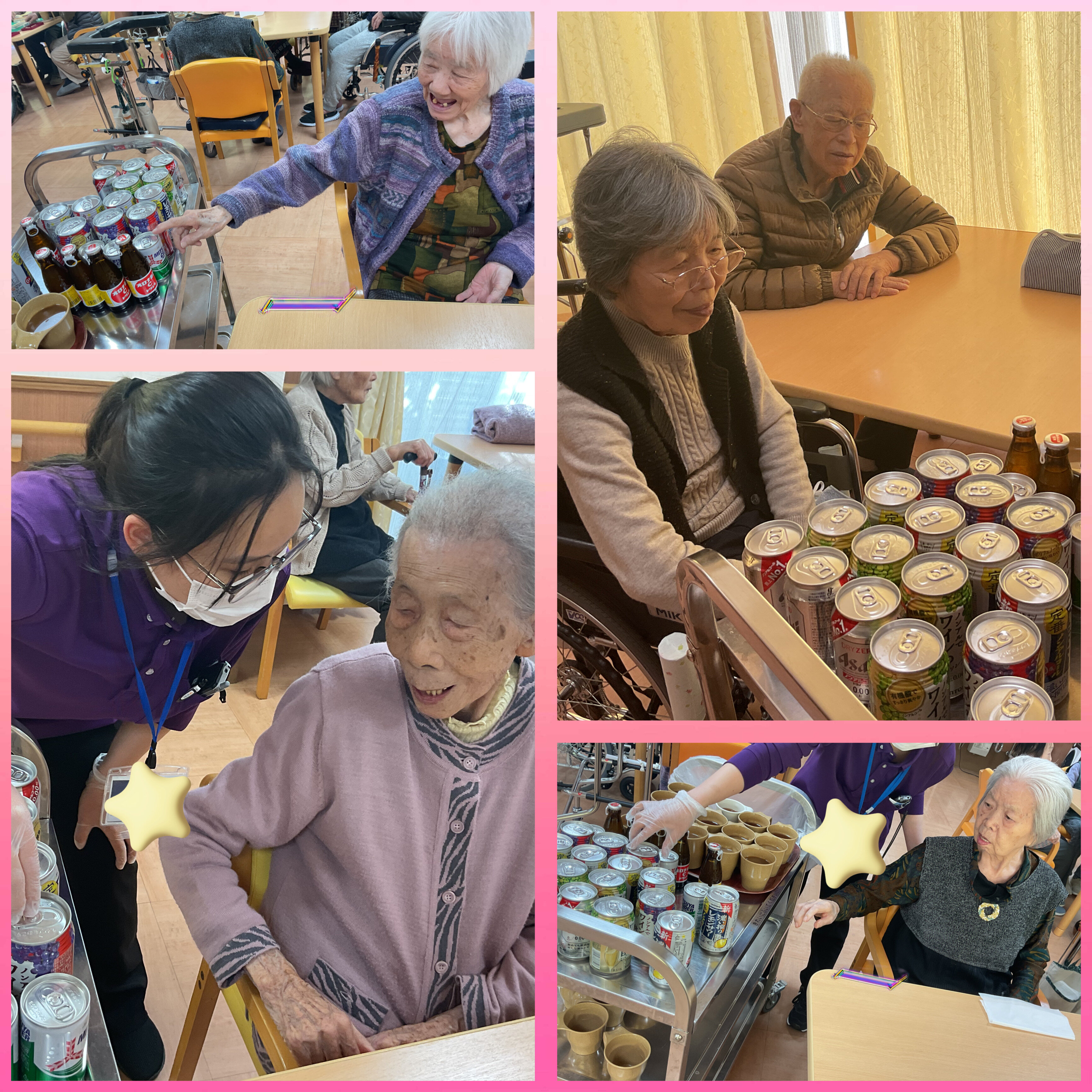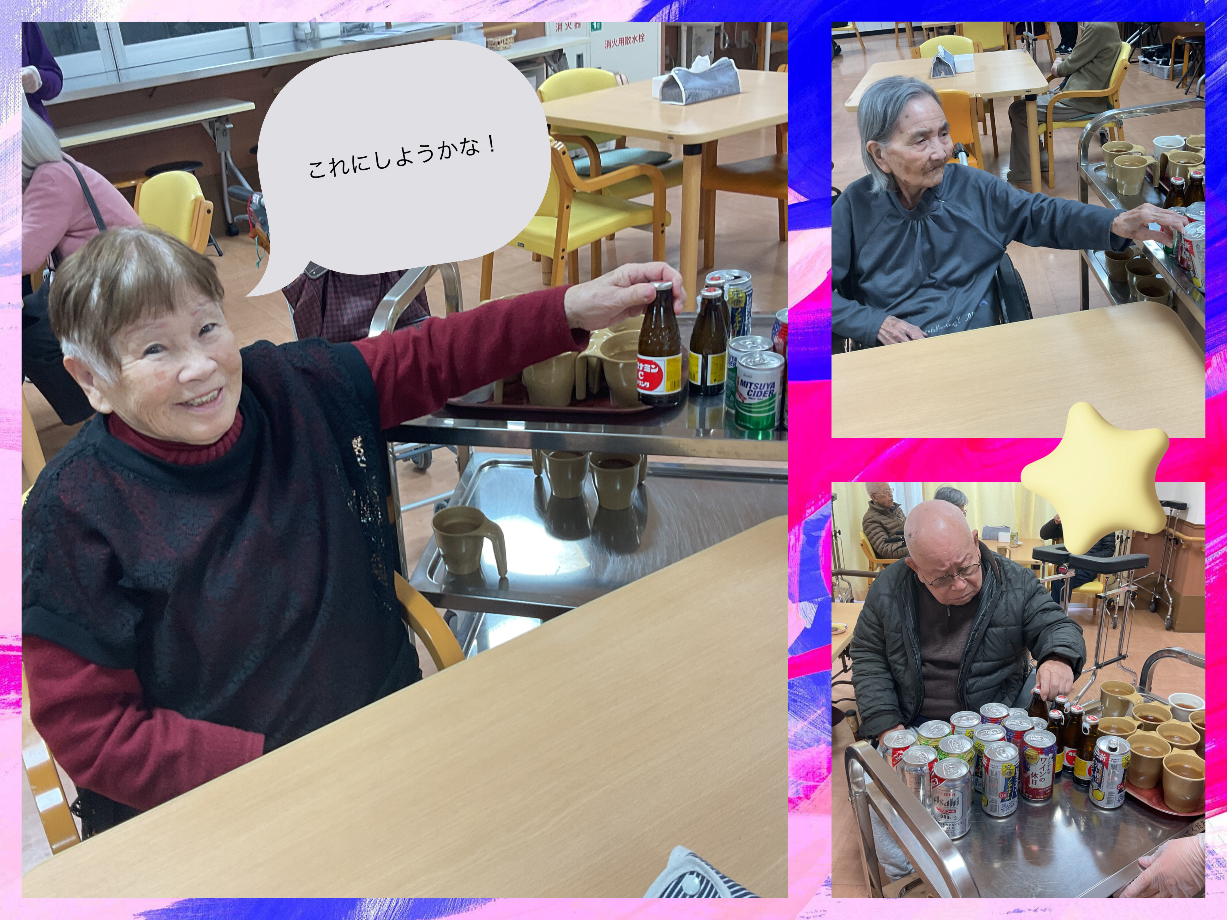 日曜喫茶では、数種類のジュースやノンアルコールのお酒を用意しており、入居者様自身に選んでもらっています。