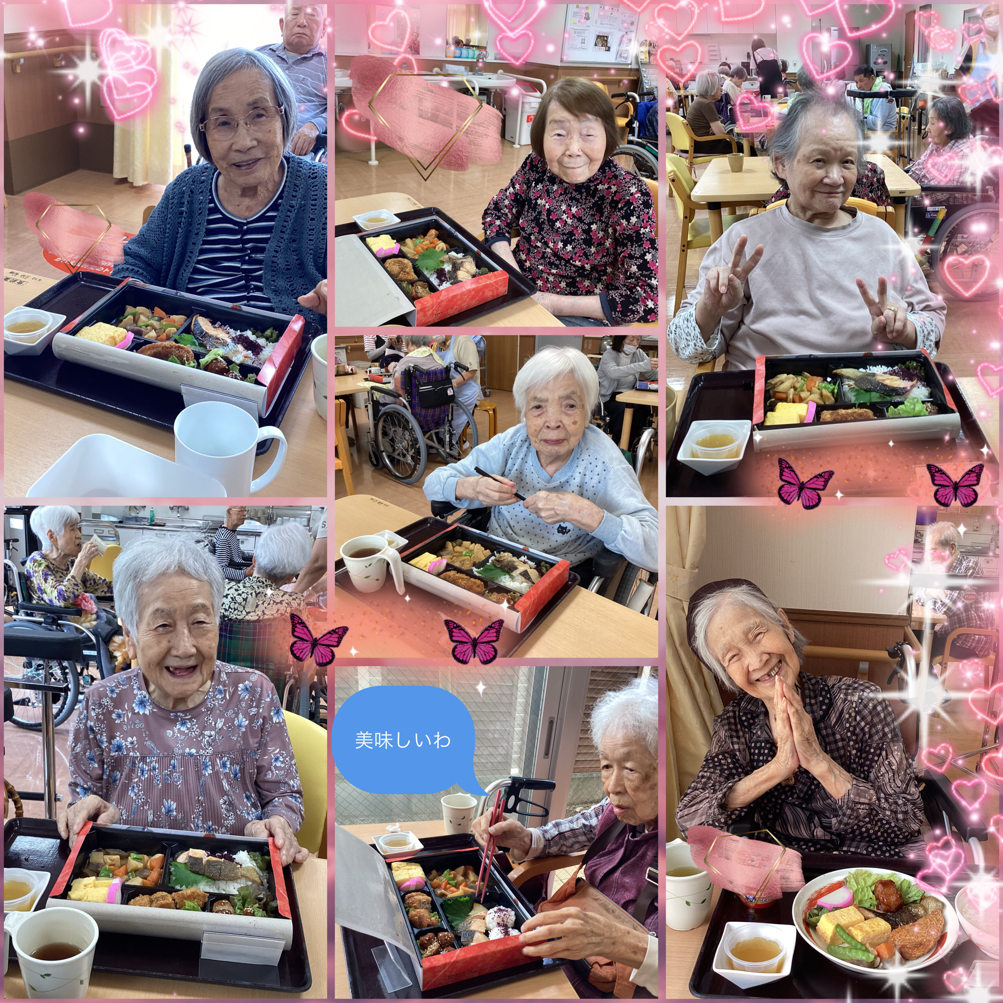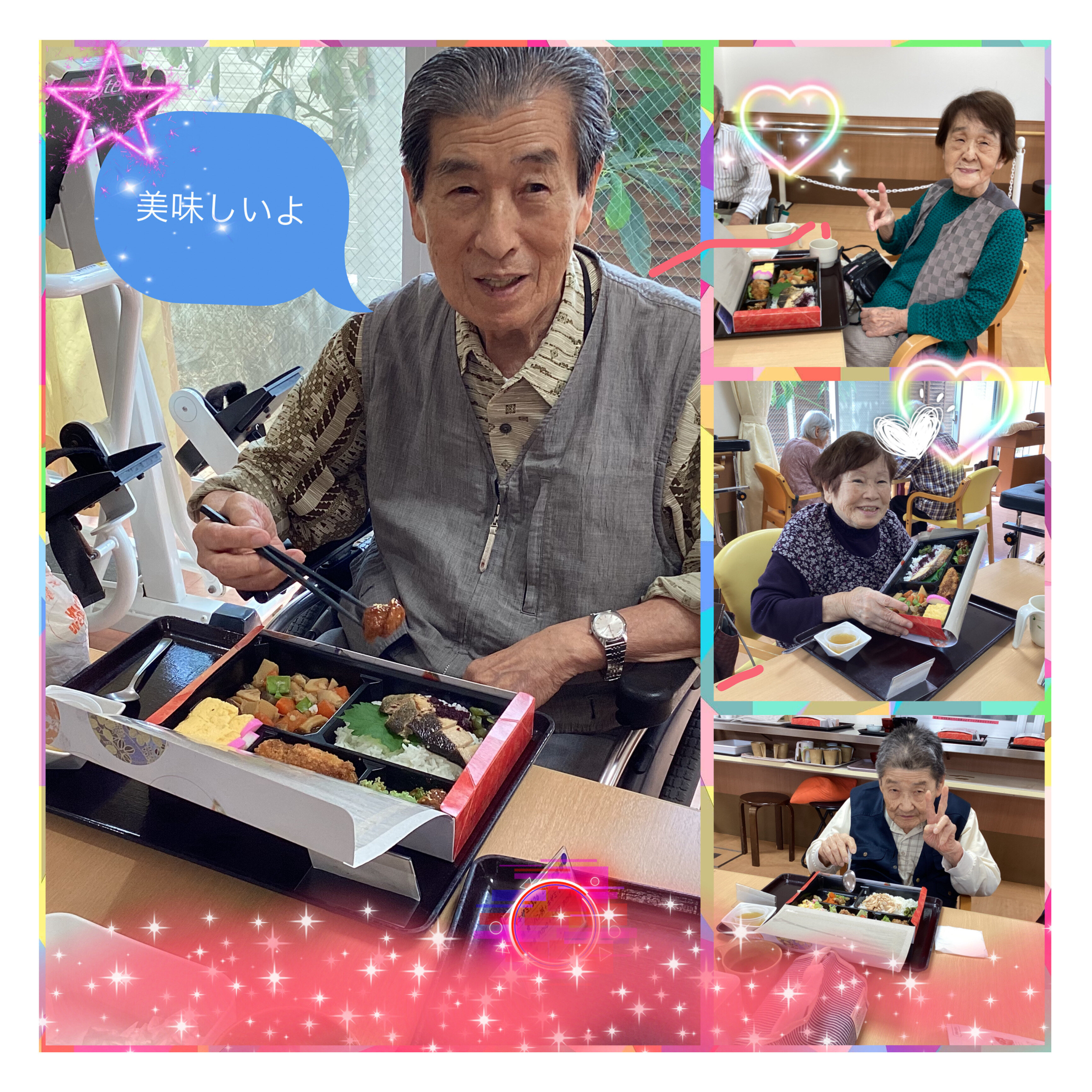 施設ではごちそうメニューとして、色とりどりの食材を盛り込んだ「行楽弁当」をご用意致しました。