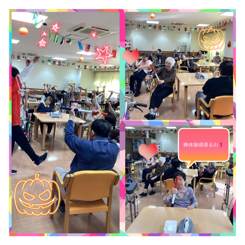 先生の掛け声に合わせて棒体操も行っています。皆さん自然と笑顔があふれ楽しそうなご様子でした。