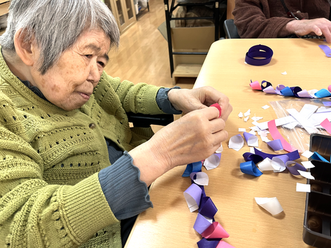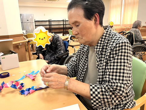 紙をくるっと丸める作業と、テープで貼る作業が主な工程なのですが、「丸めるの苦手!!」と仰ったご入居者はご自分で役割を決めて、