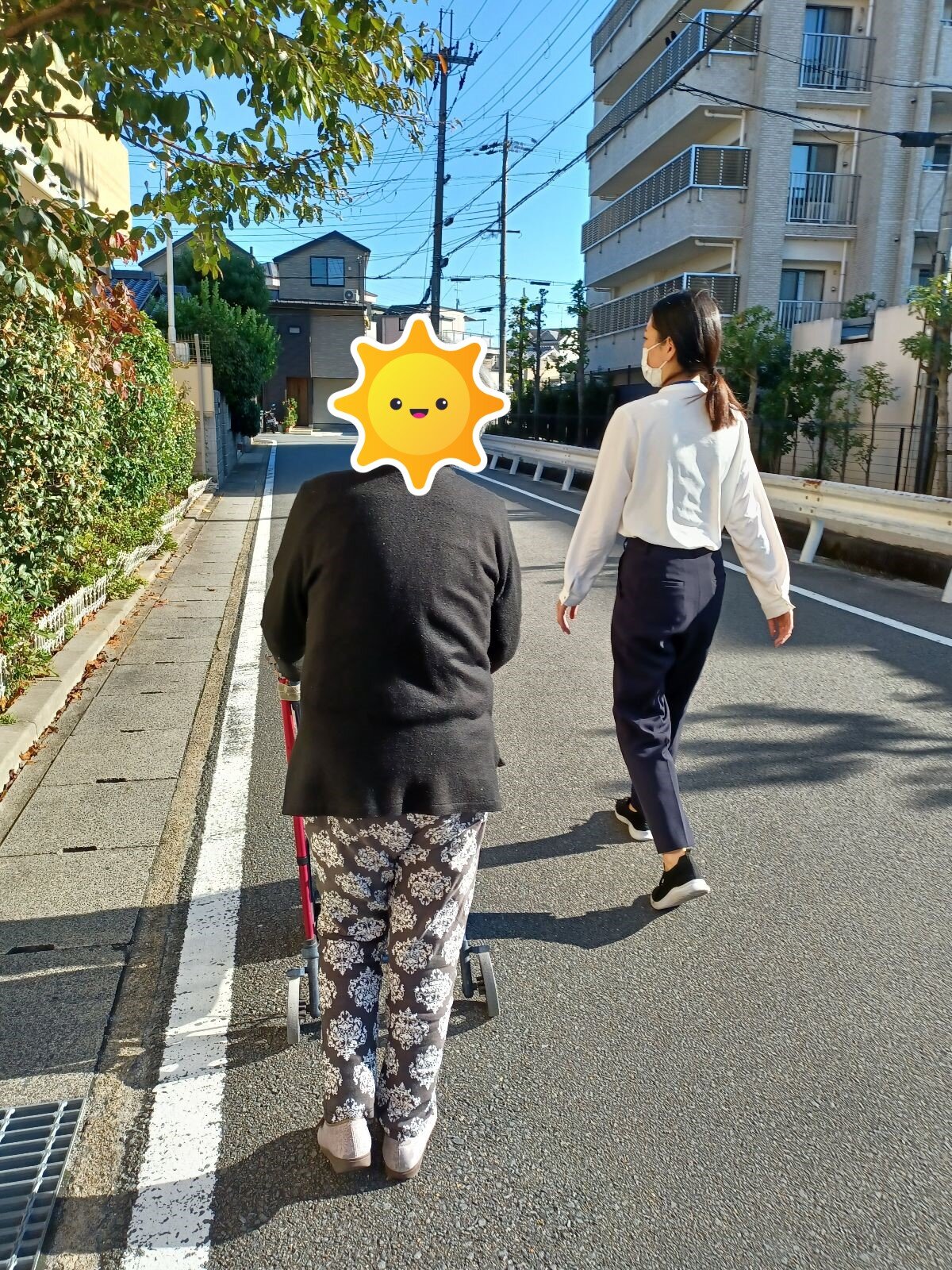 また、後ろを歩いておられるご入居者様も、
