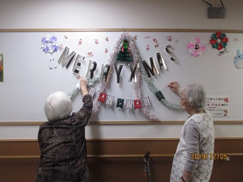 さて、せいりょう平野喜連では、12月25日のクリスマス会に向けて早くも!館内の飾りつけを行いました(^^♪