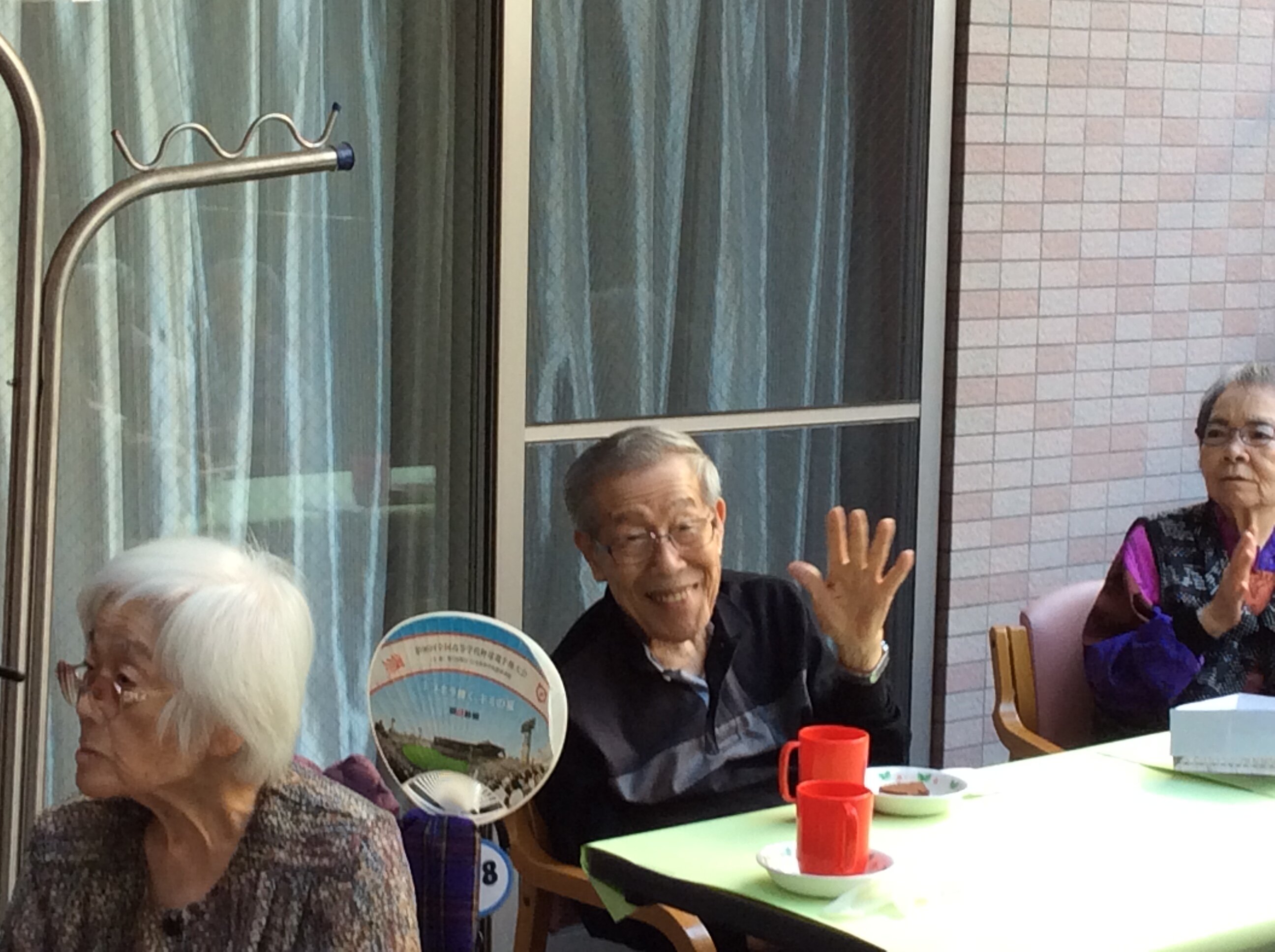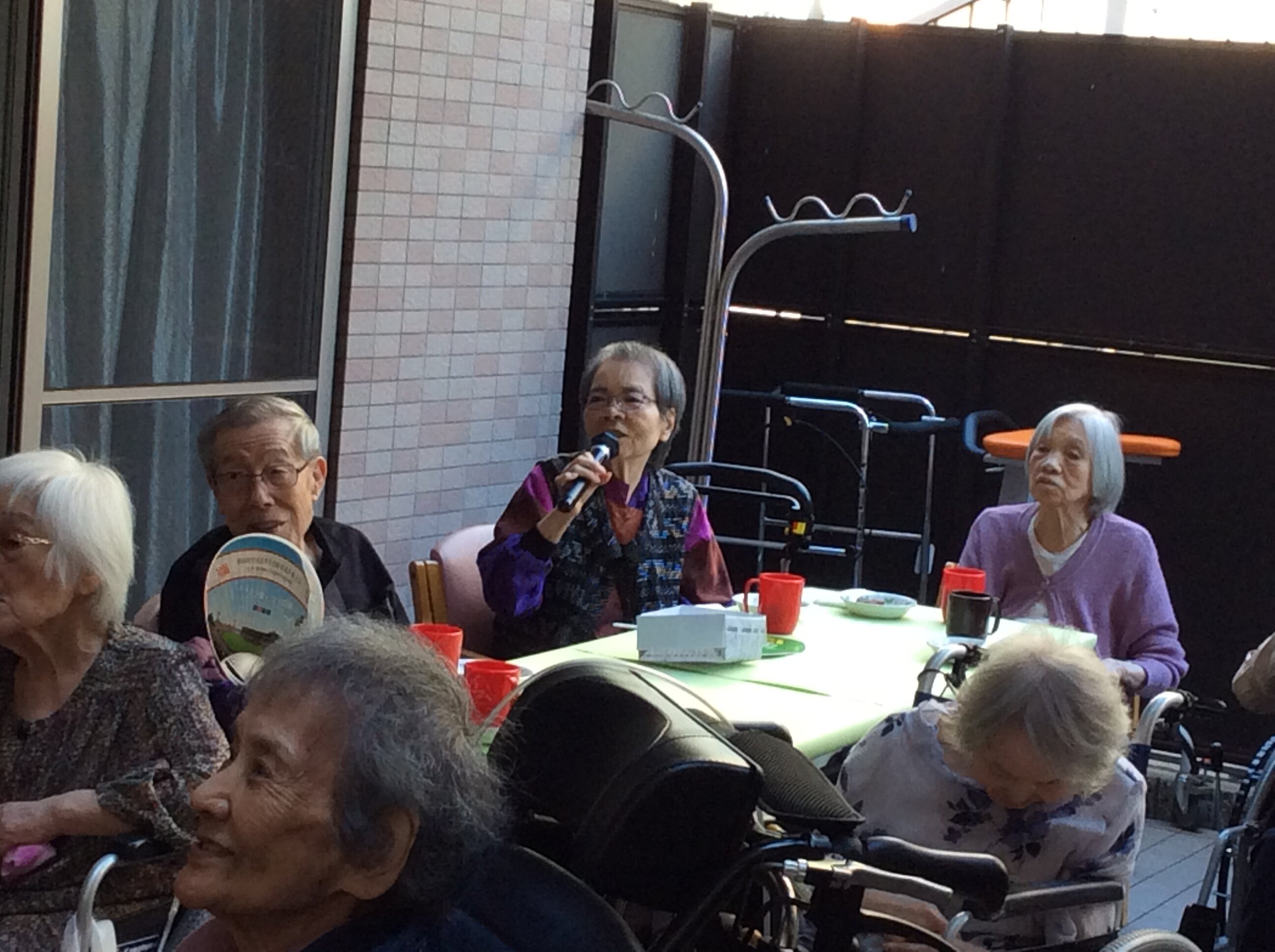 入居者様も青空の下で涼しい風に当たりながらカラオケ