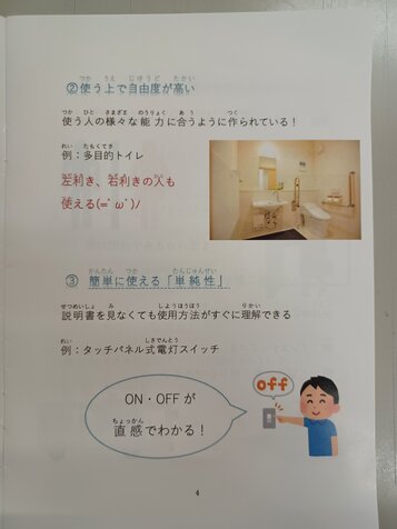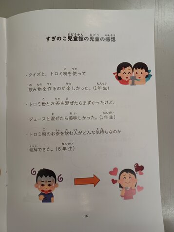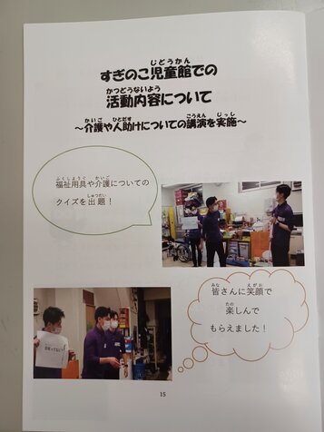 このような本を作成したり、児童館に行き介護や人助けのお話をしたり、トロミ粉が入っている飲み物を実際に飲んだ感想を聞いたり、体験型の研修をしていました。