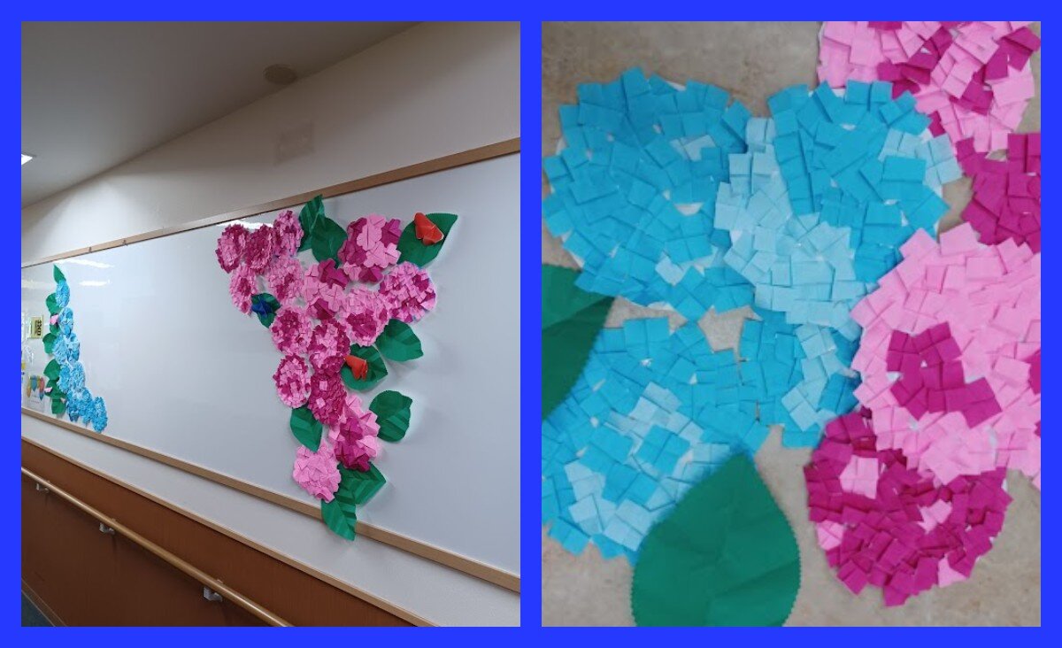カラフルな傘とアジサイのコラボ壁画が遂に完成(^_-)-☆
