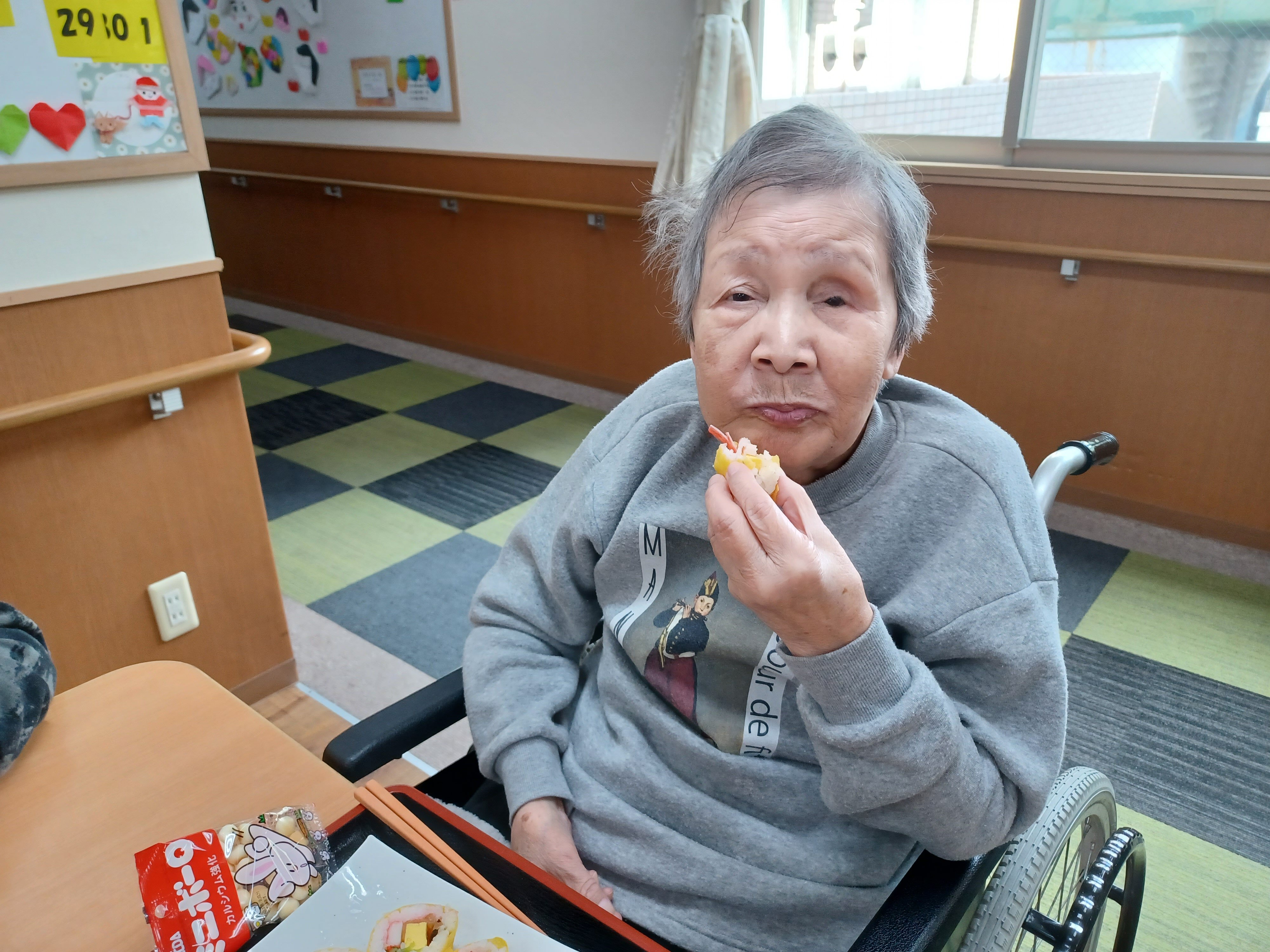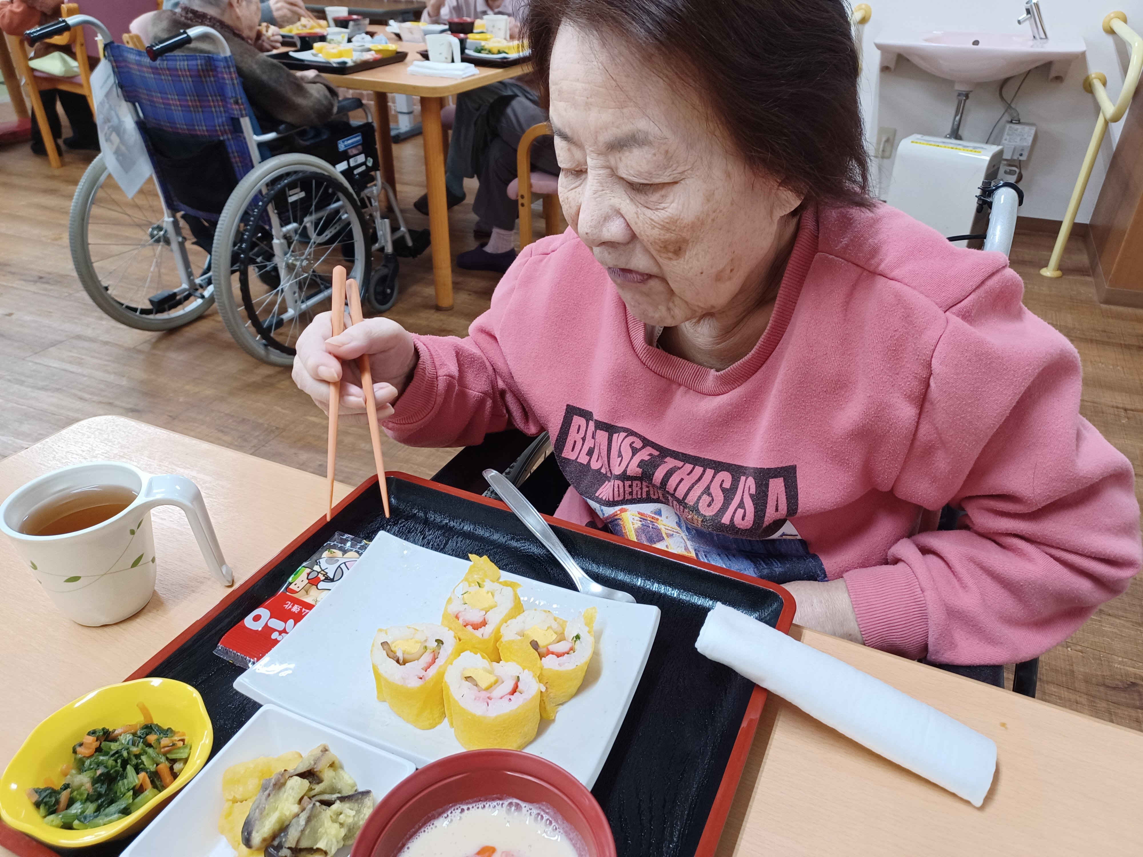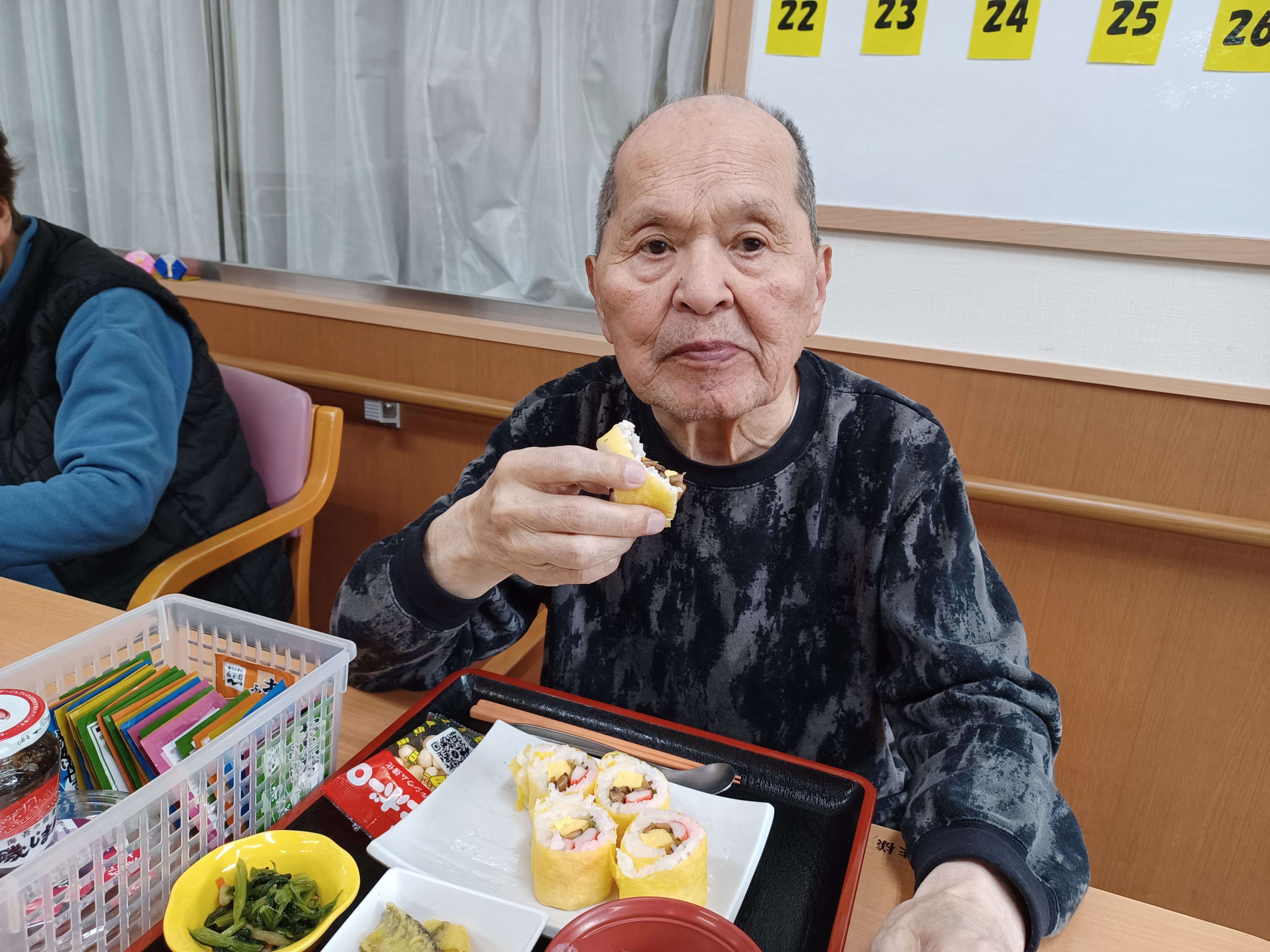 施設では、節分にちなんで卵巻き寿司(恵方巻き)を提供させていただきました。