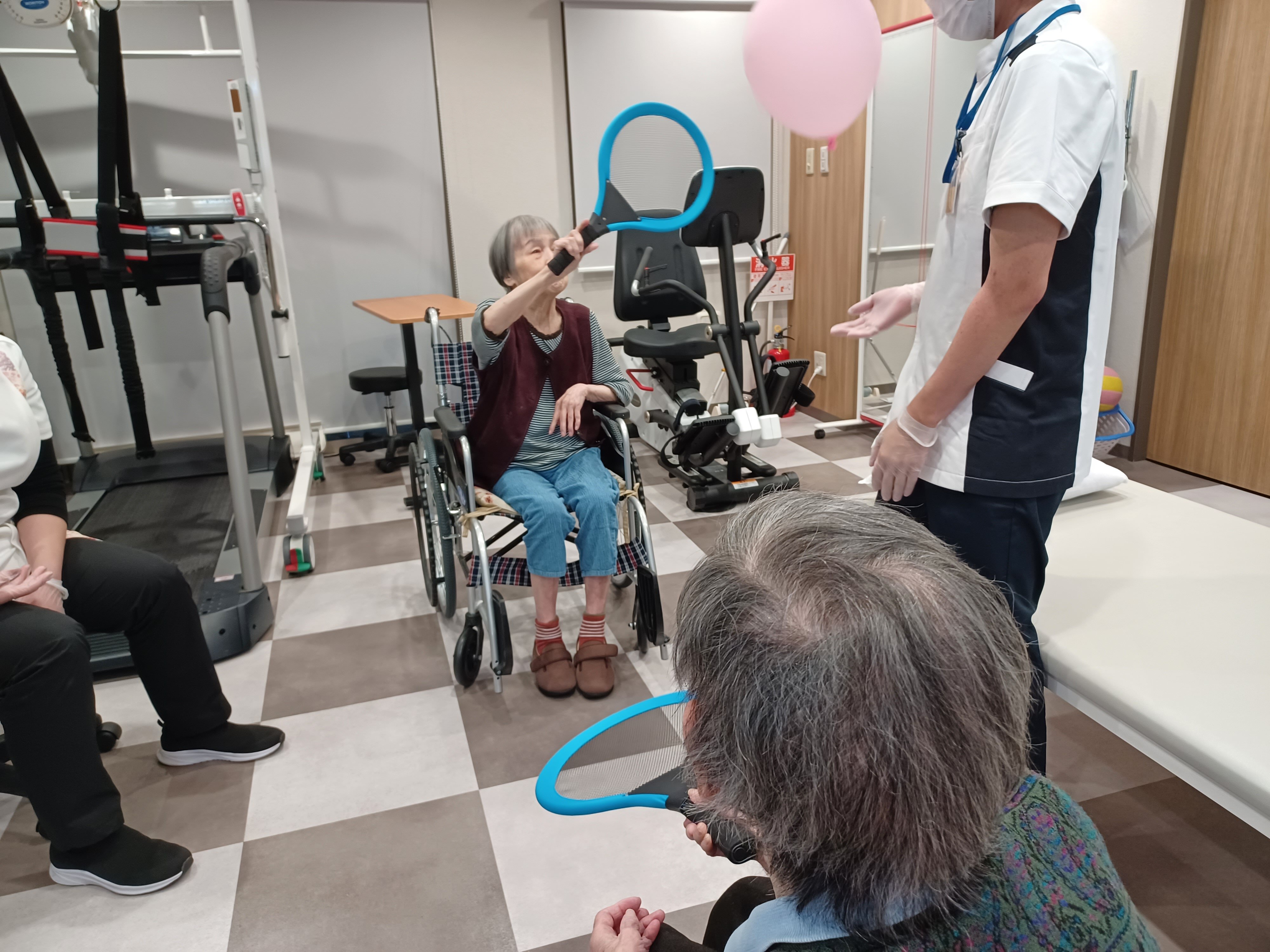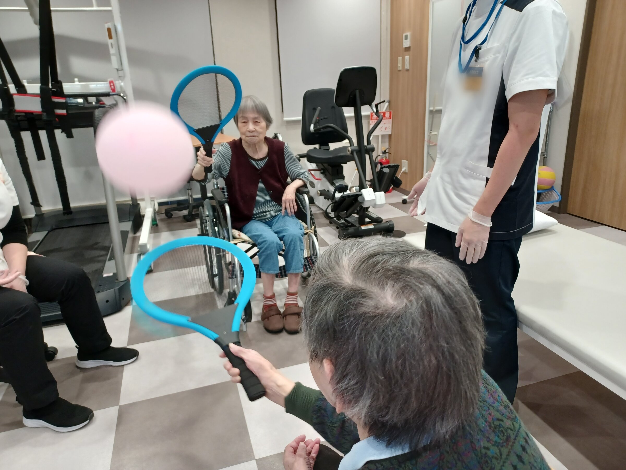 今日は、風船とラケットを使った体操レクリエーションを行いました。