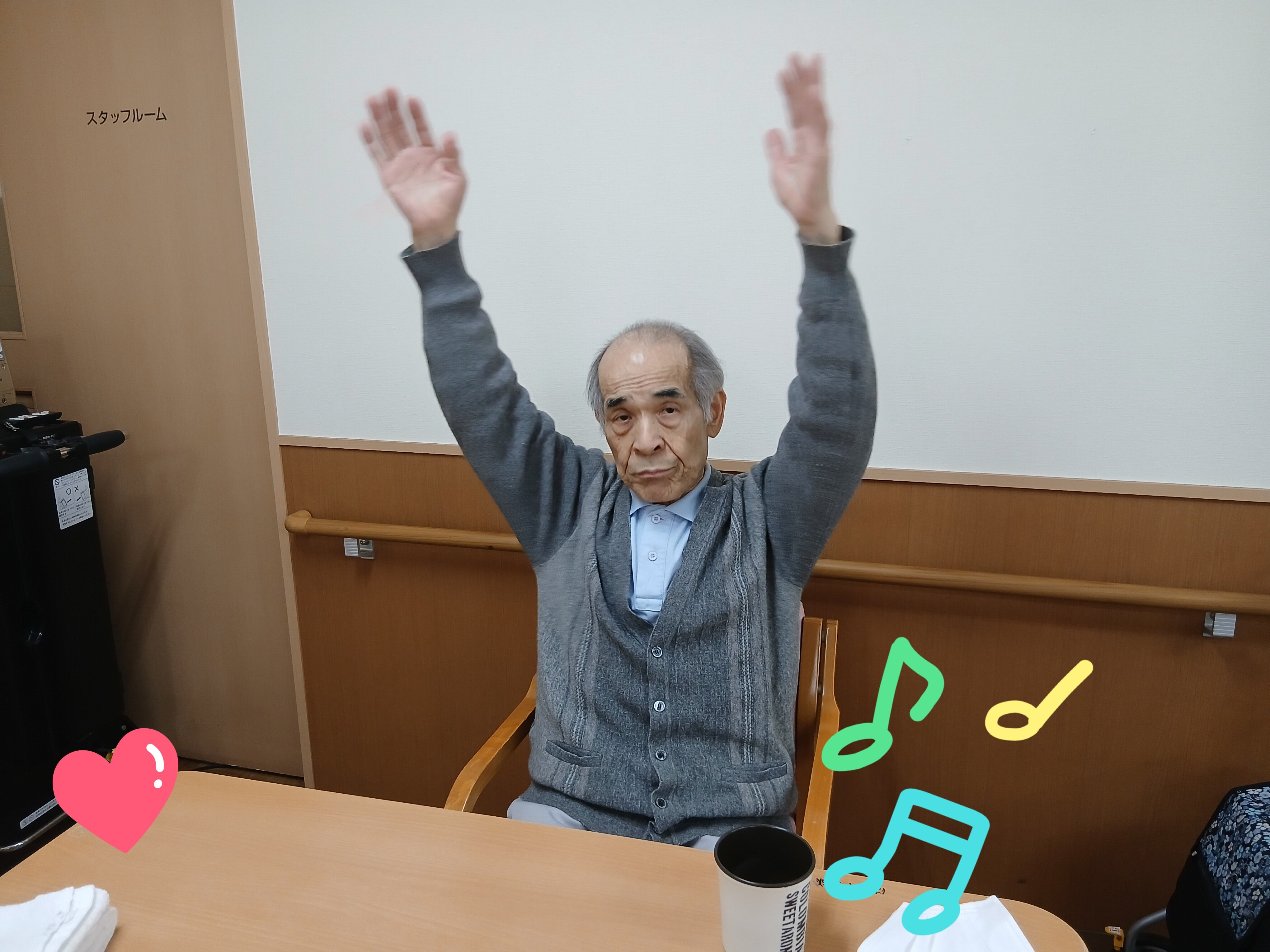 音楽に合わせて、腕を伸ばしたり体を動かしたりと、