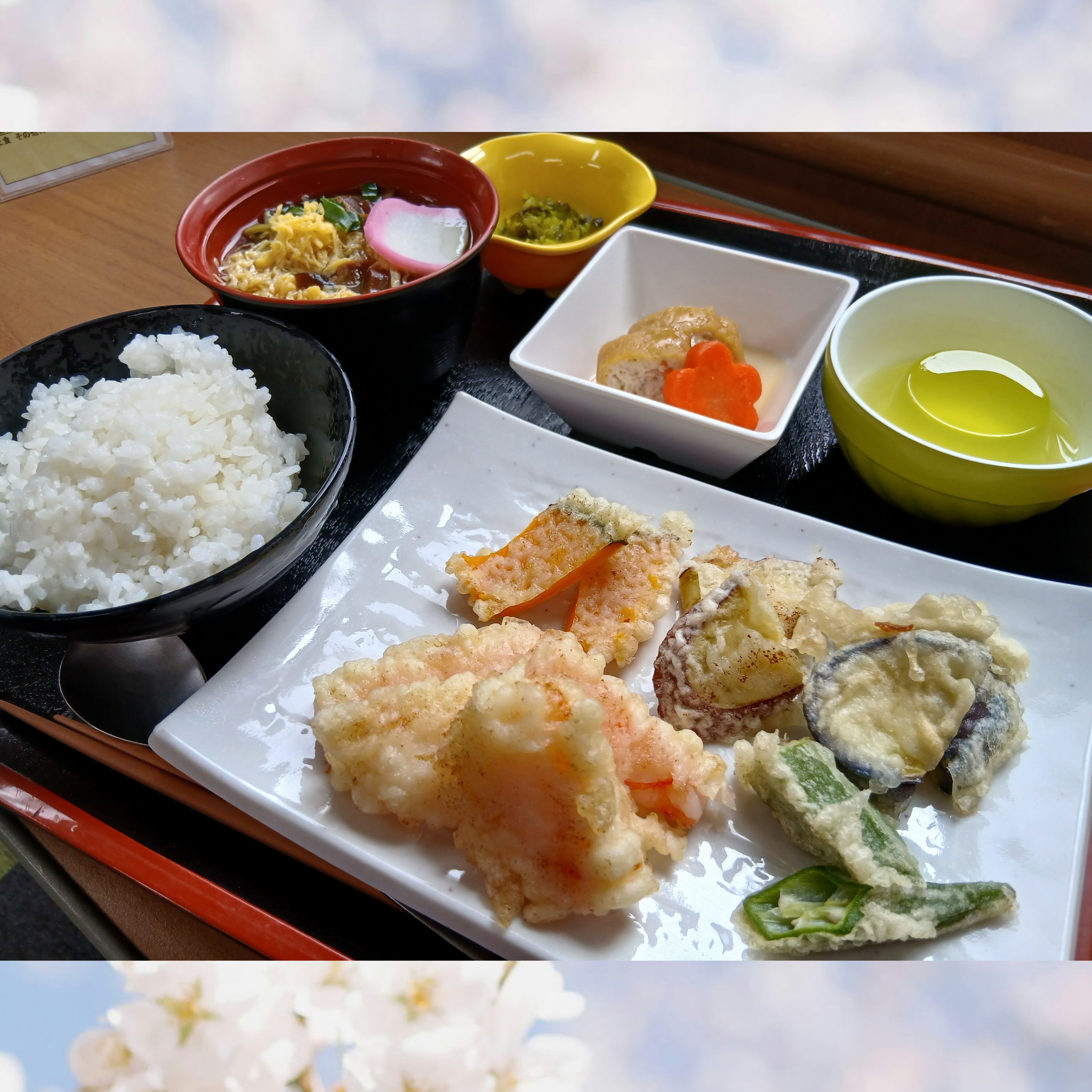 本日は、天ぷら盛合せと茶蕎麦♪