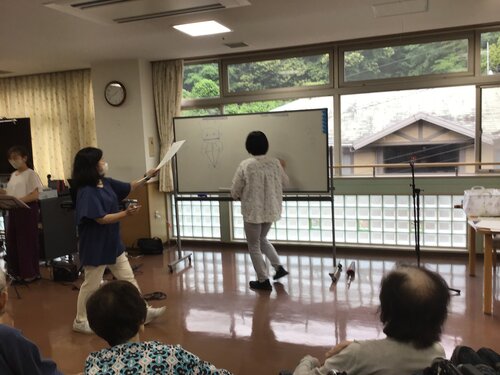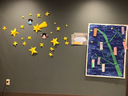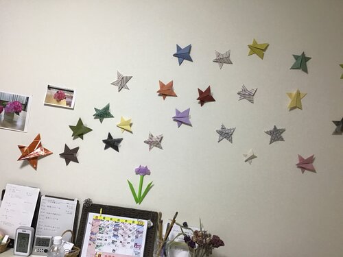 手を伸ばして折り紙の作品を沢山貼って下さいね。
