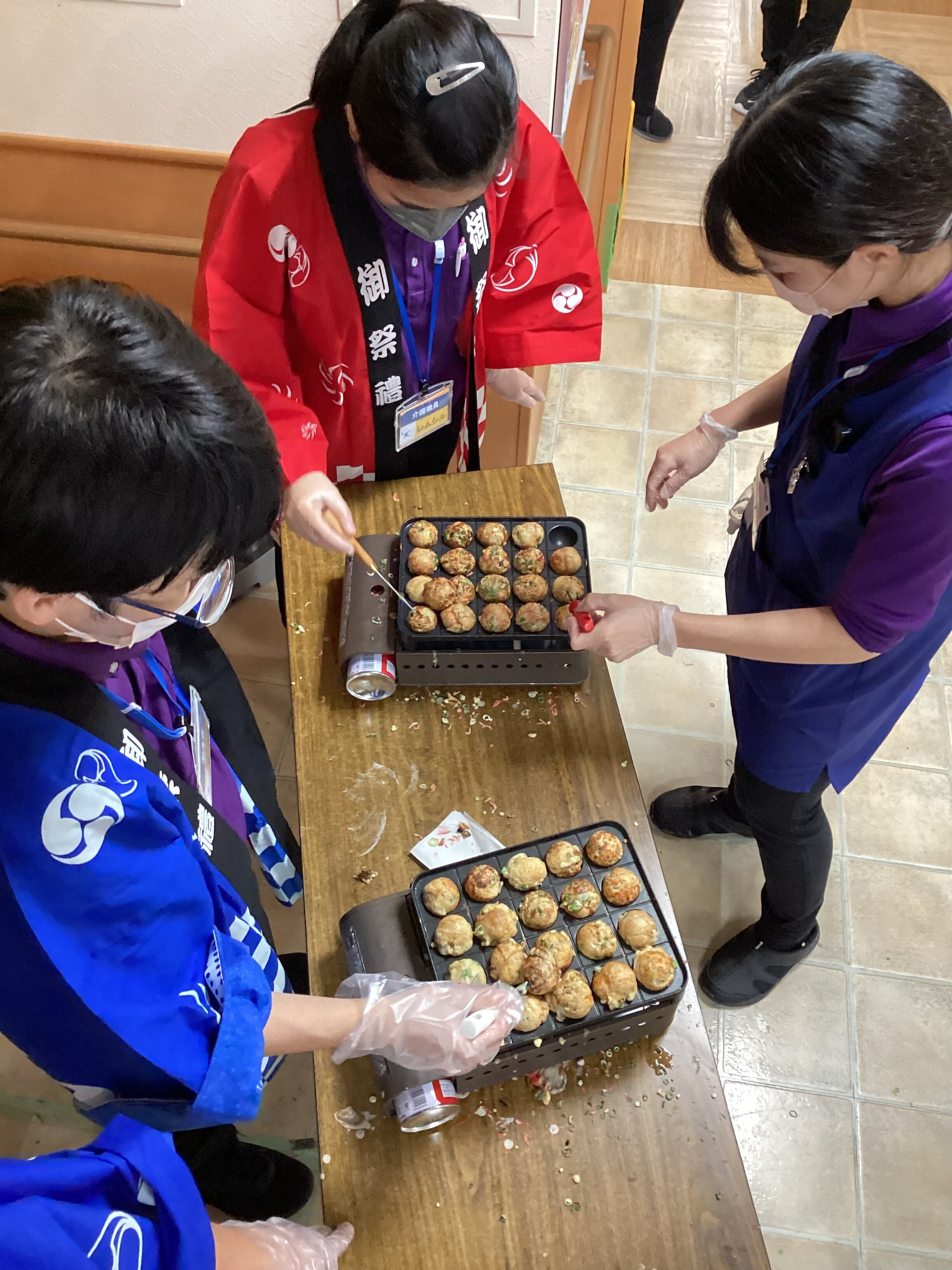 職員がはっぴを着て雰囲気を出してたこ焼きづくりをしています。