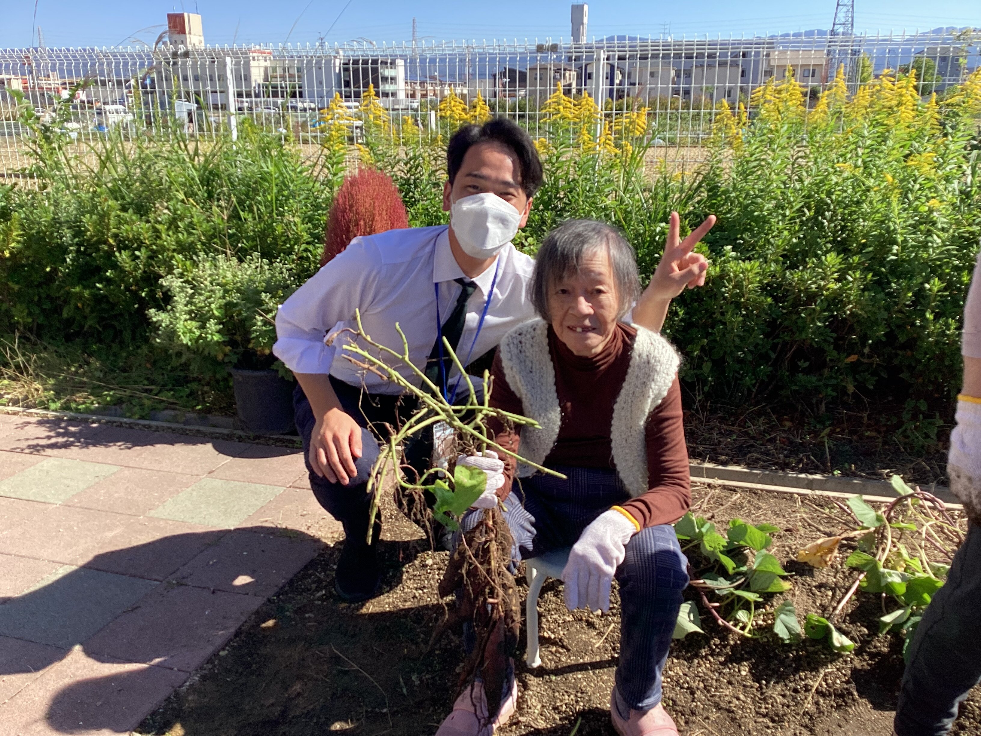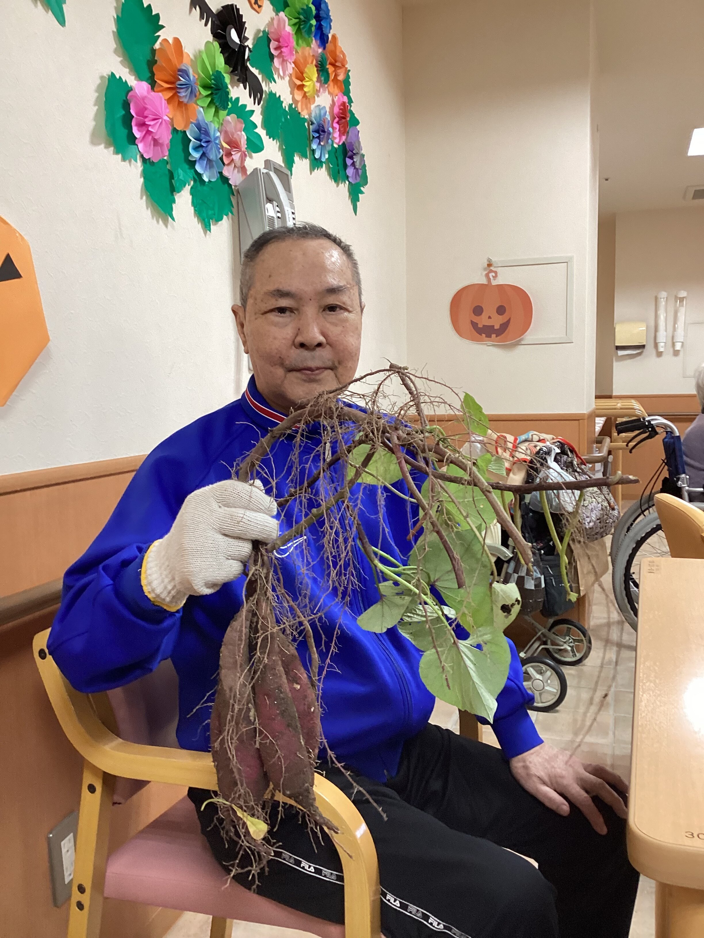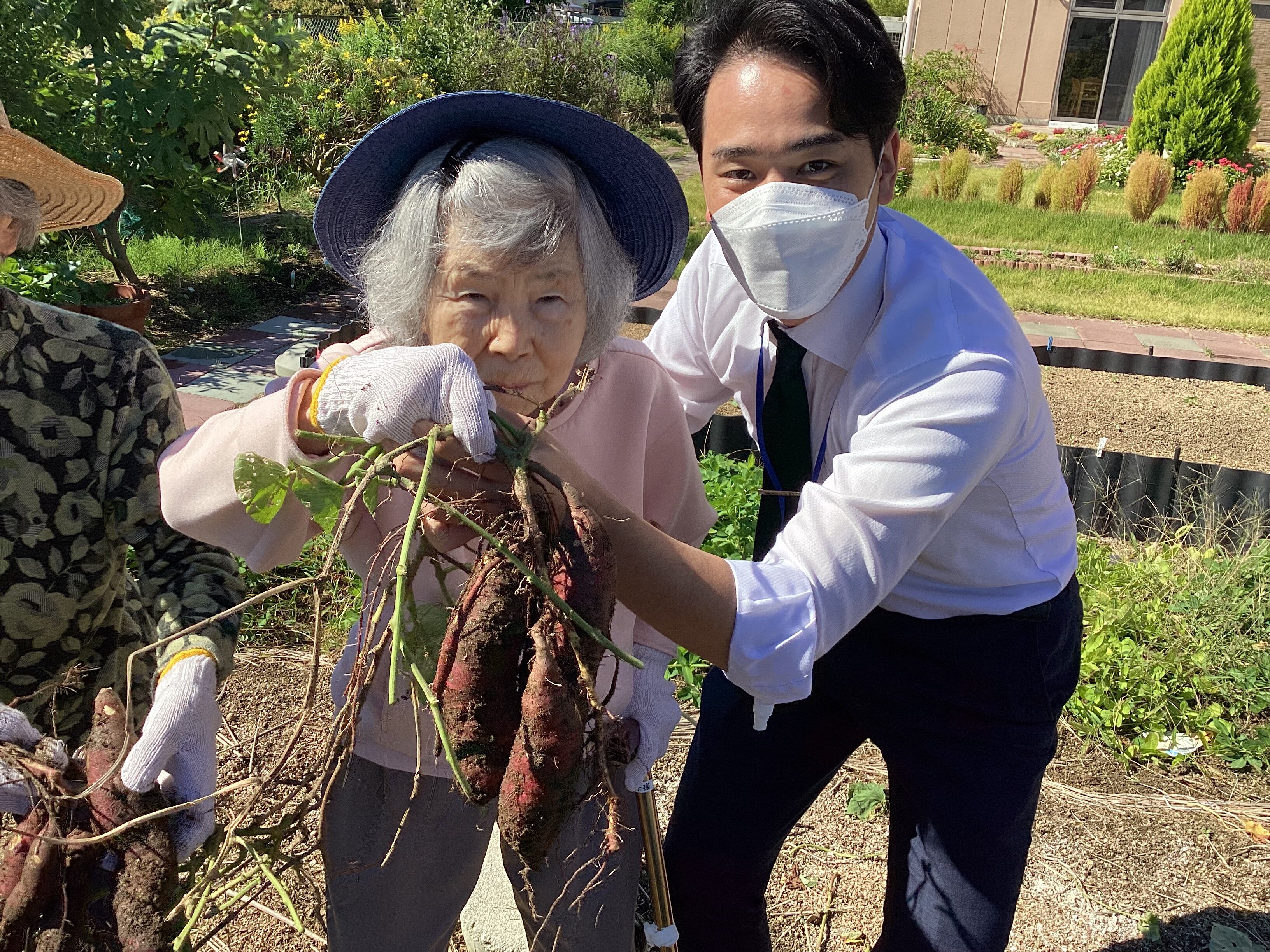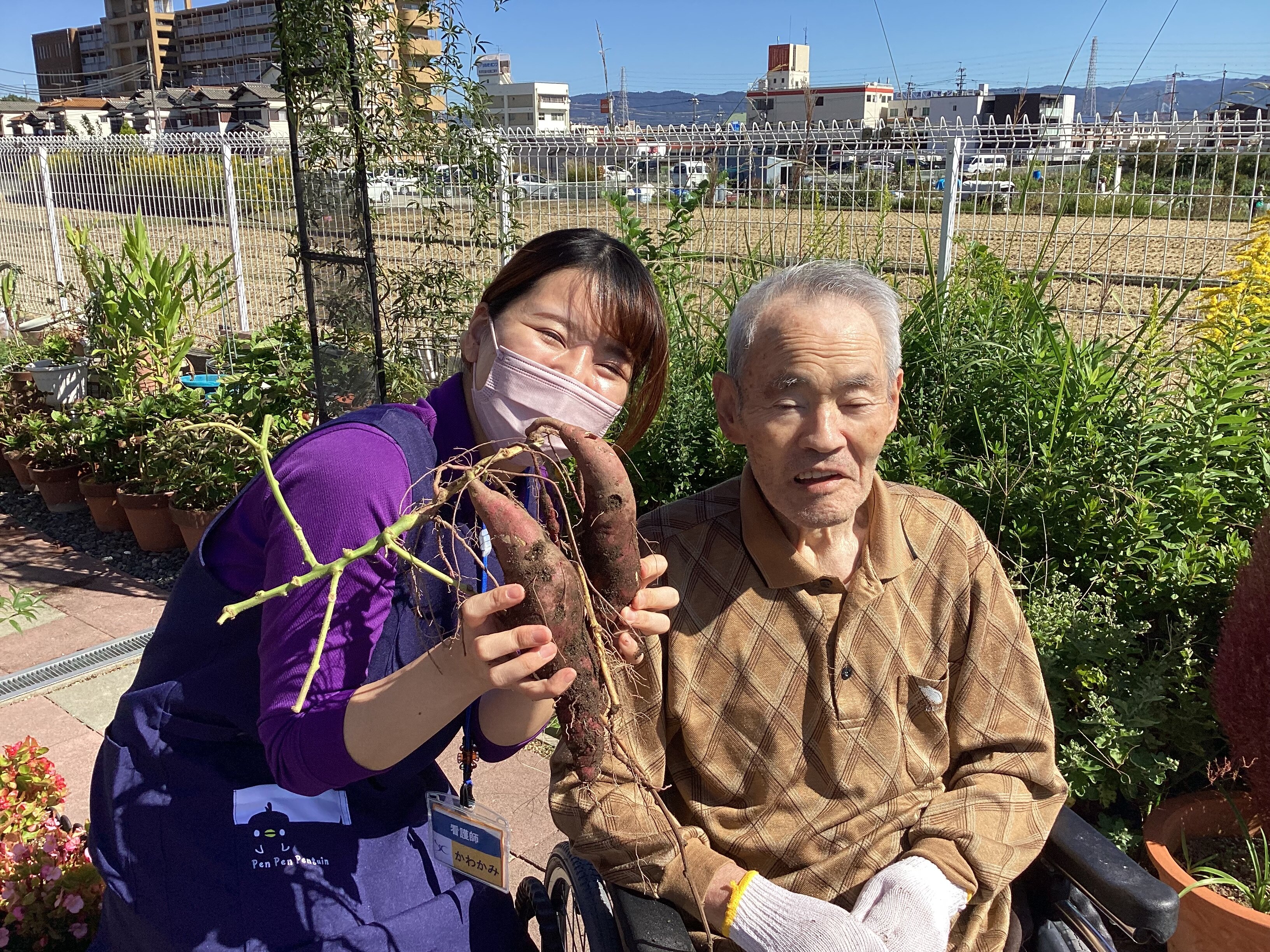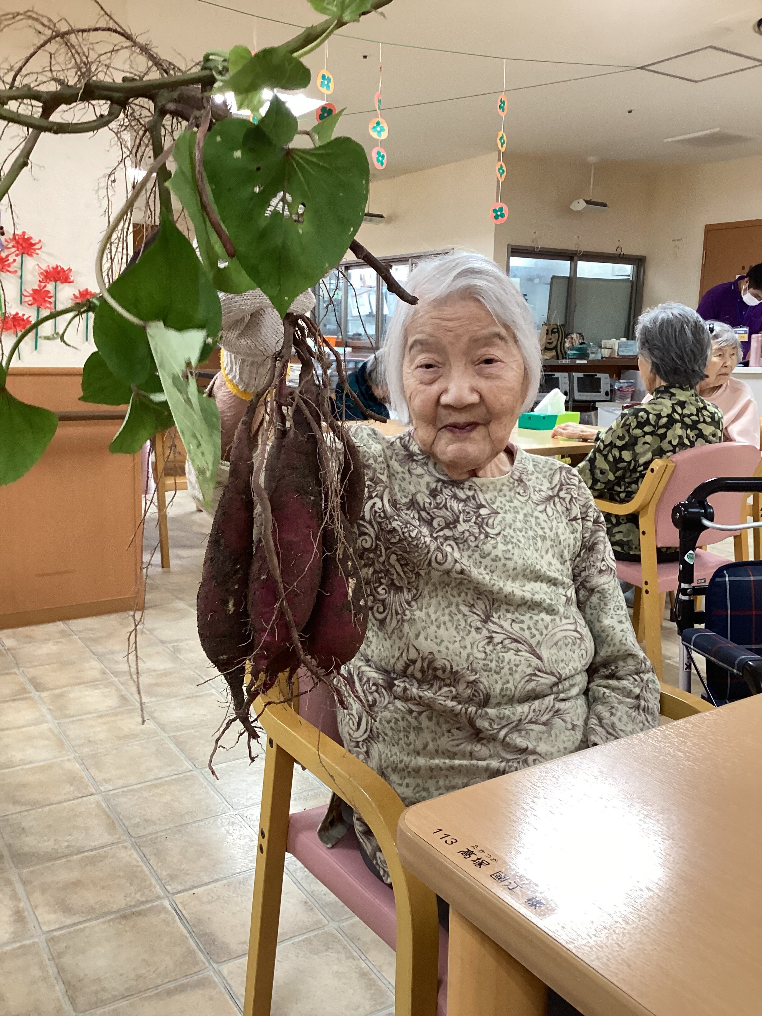 先日、職員とご入居者の皆様で筒井の自慢の庭でなったサツマイモを収穫しました(^^♪