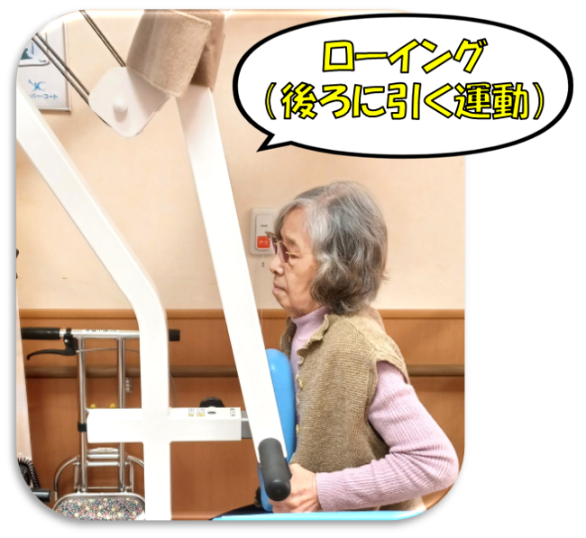 当施設にはマシントレーニング用の機械が4機種、歩行訓練や立ち上がり訓練を行うための平行棒が1台、滑車運動の機械などがあります。ご入居者の皆様には、個別の状況に合わせて機械を使い分けて運動して頂いてます。