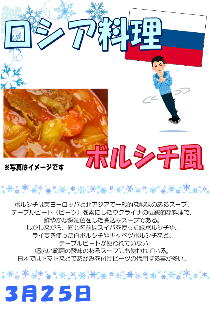 今週のピックアップメニューは「ロシアグルメ」と「鶏の日」です!