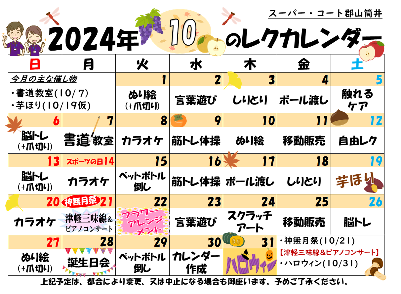 他にも「書道教室」「触れるケア」「芋ほり」「ハロウィン」等企画しています!楽しみですね~♪