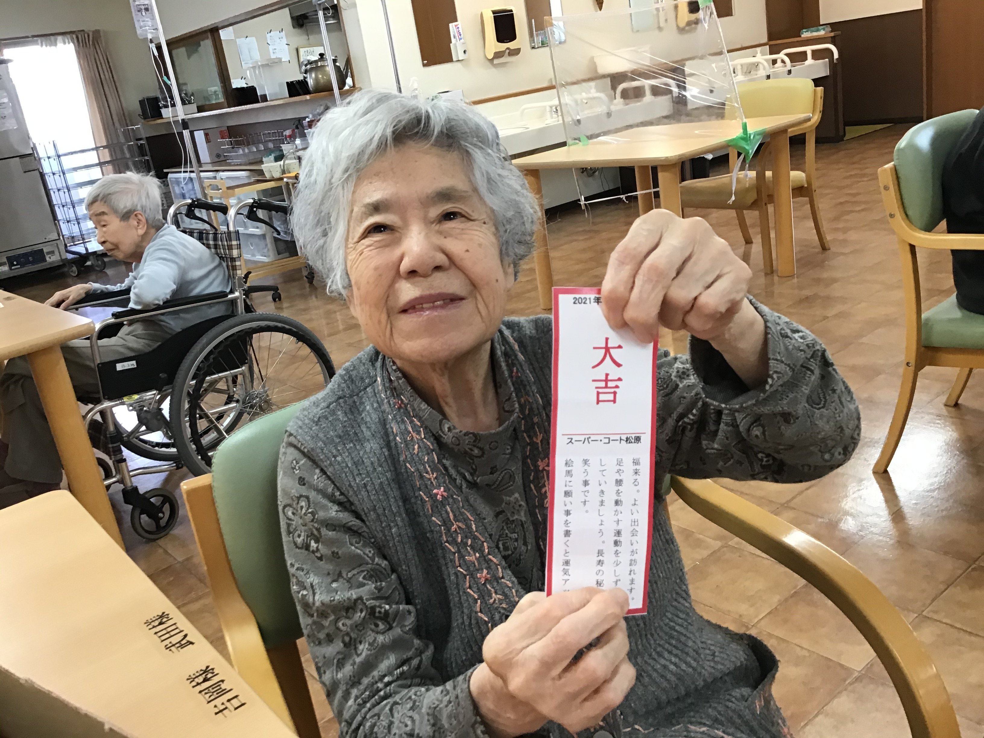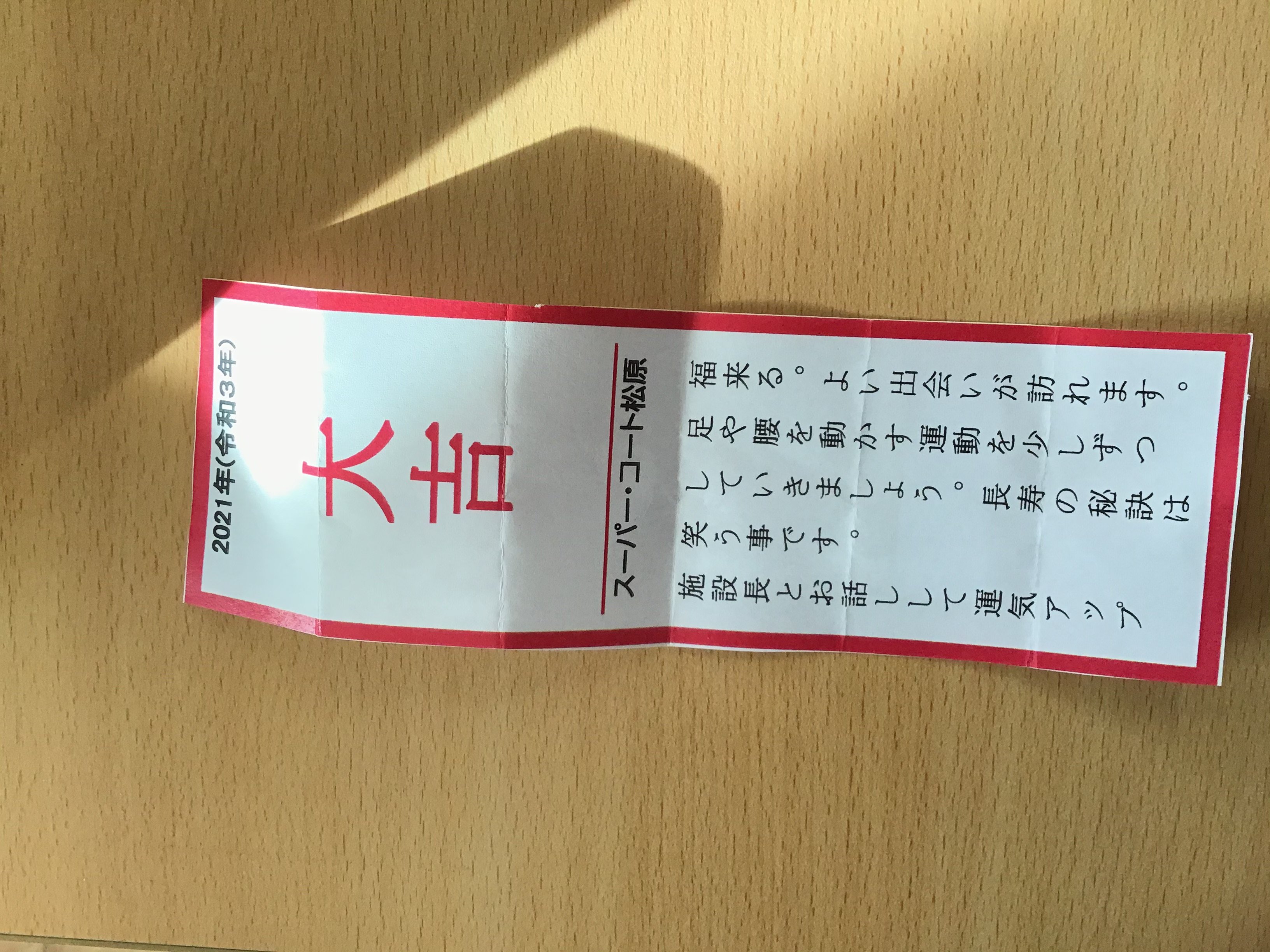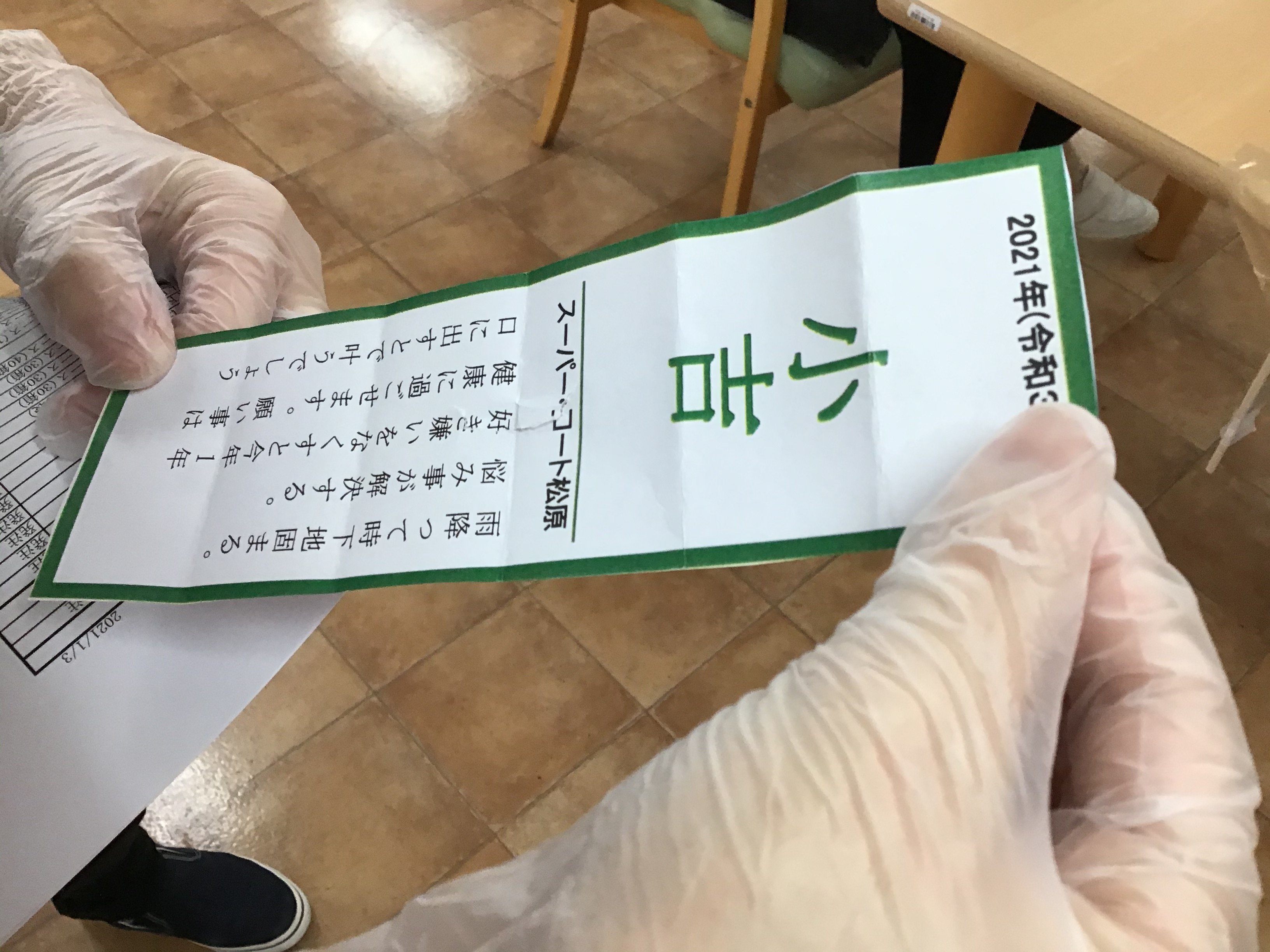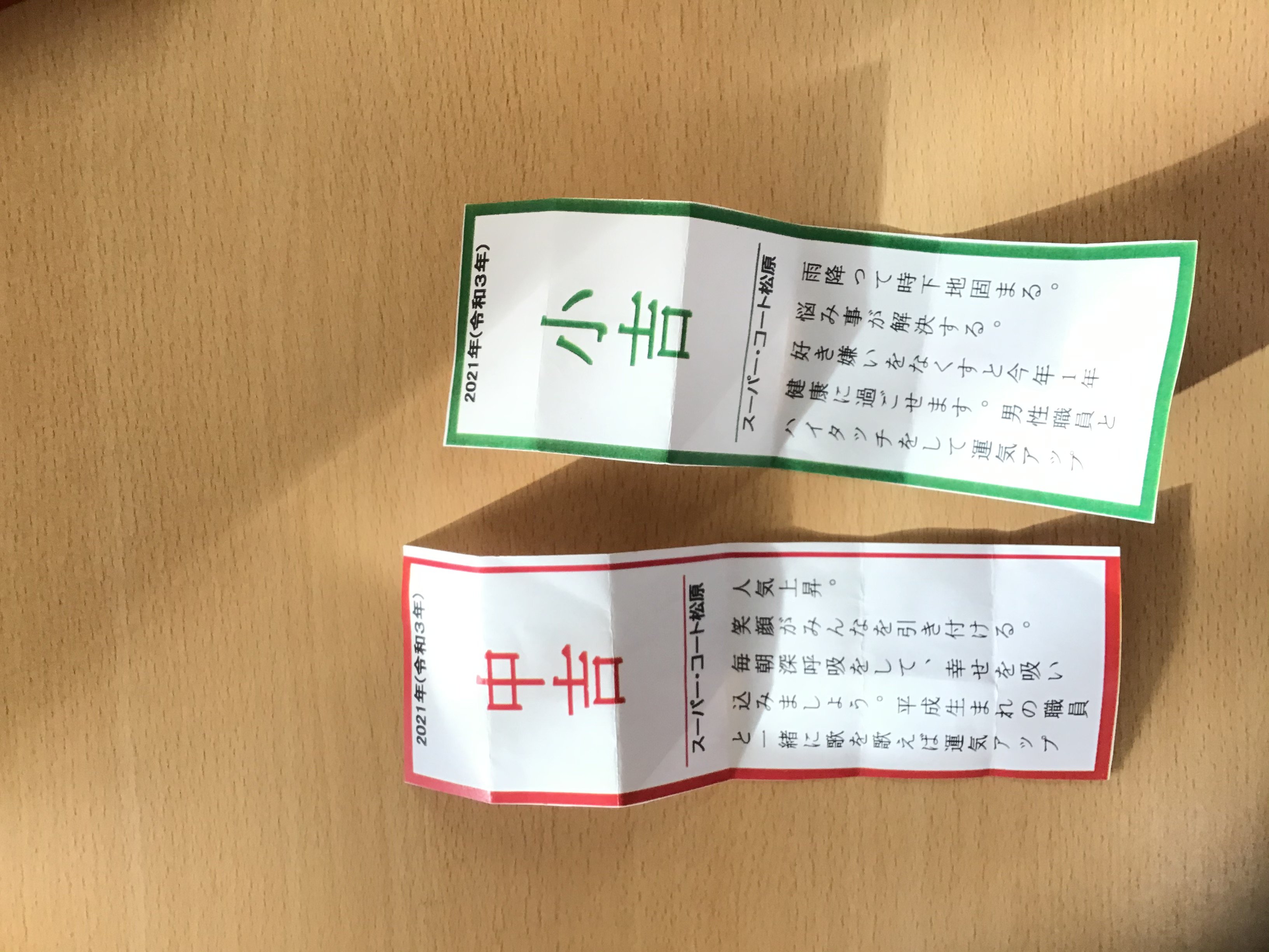 小吉には「雨降って地固まる。悩み事が解決する。好き嫌いをなくすと今年1年健康に過ごせます。男性職員とハイタッチをして運気アップ。」と書いてます!