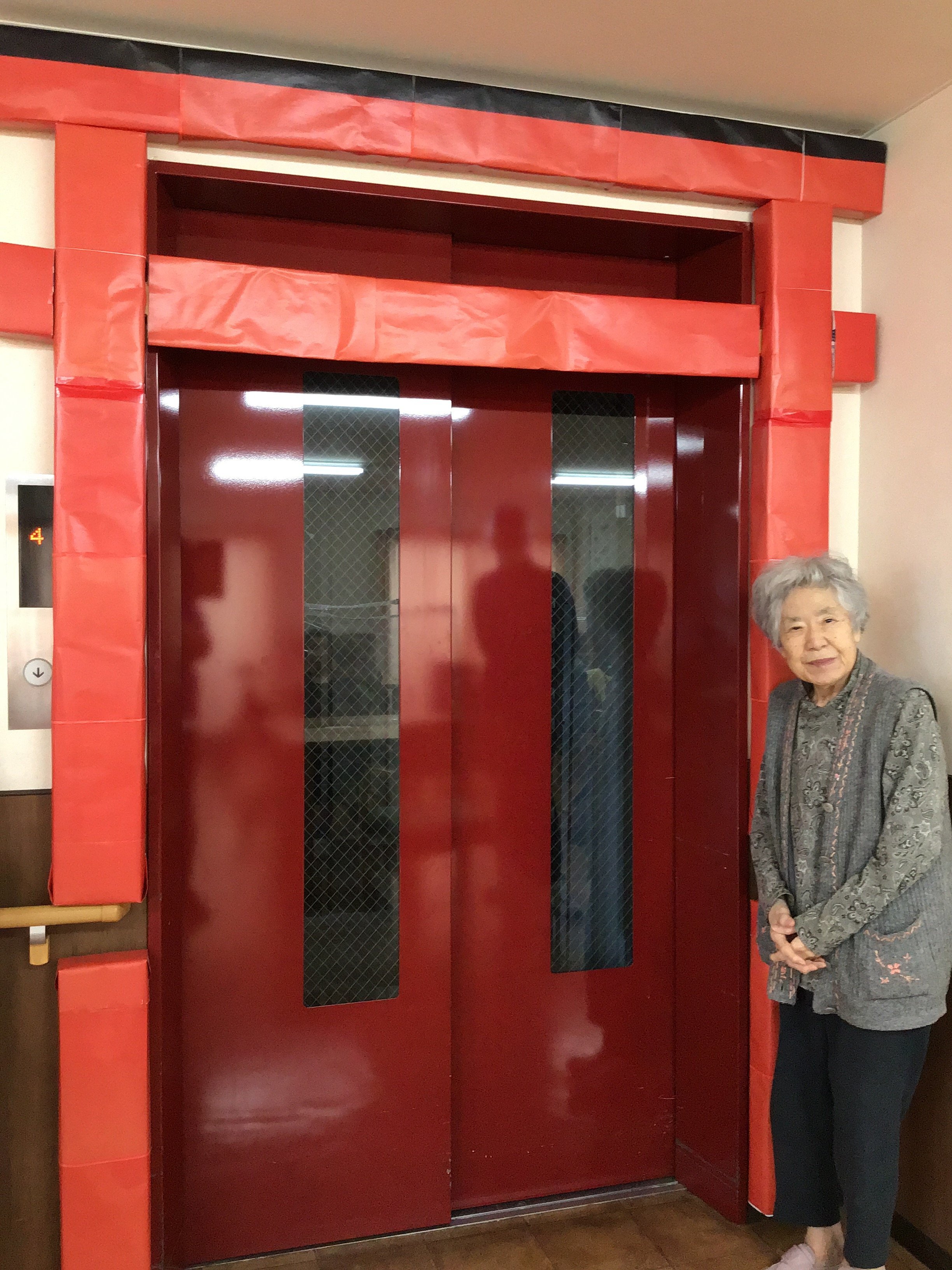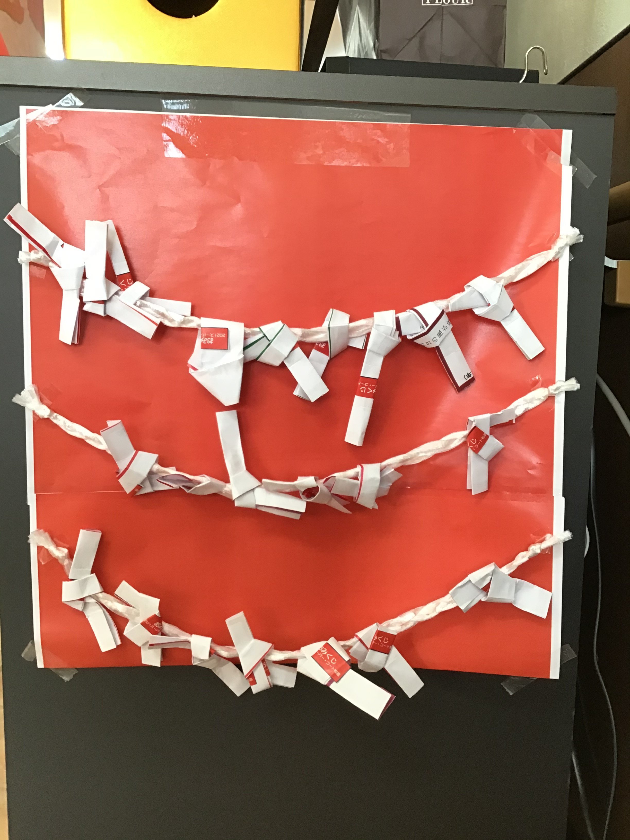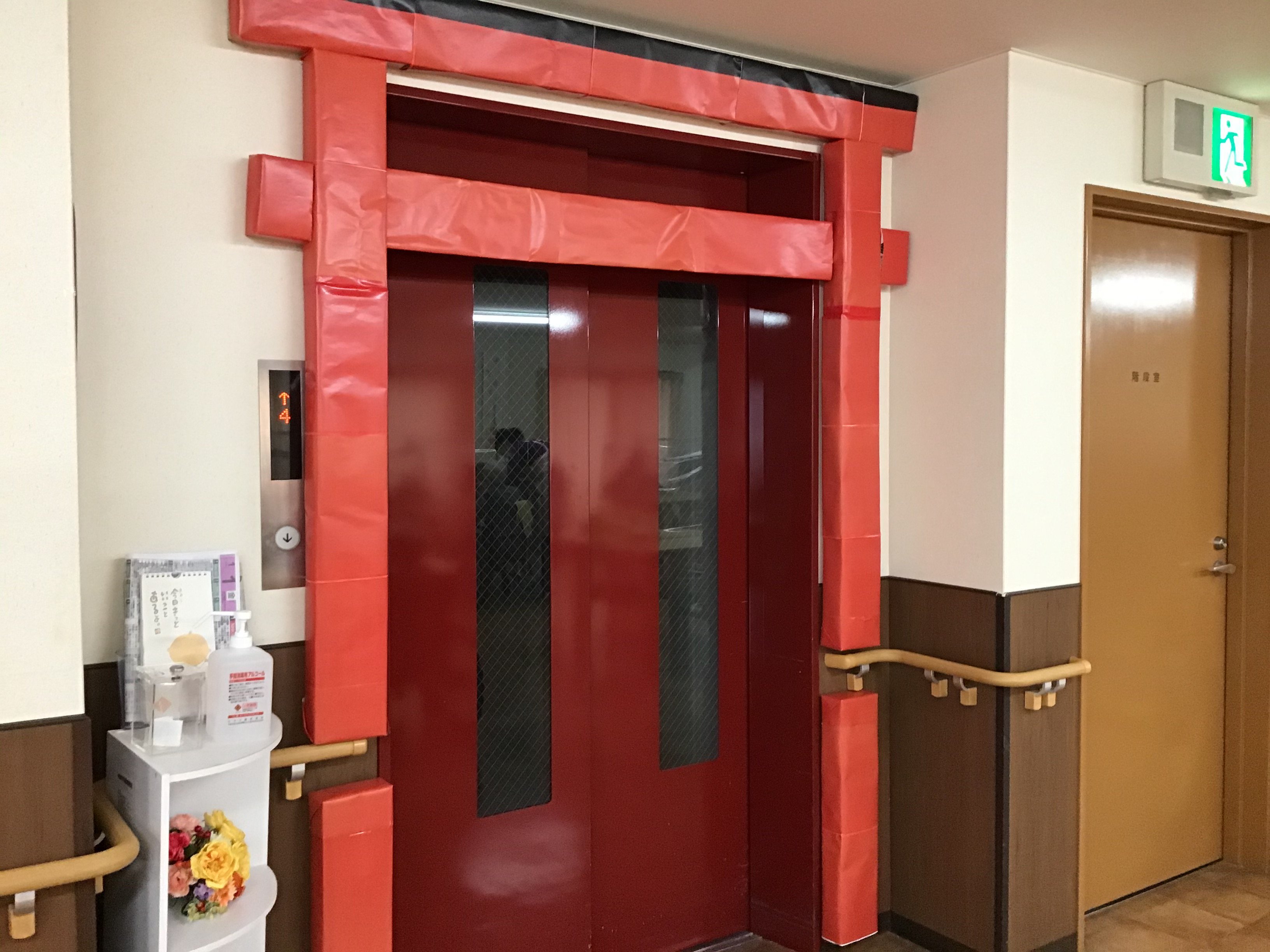 エレベーターの色に違和感なく、鳥居がありますね!おみくじは本物かと見間違う出来栄えですね!