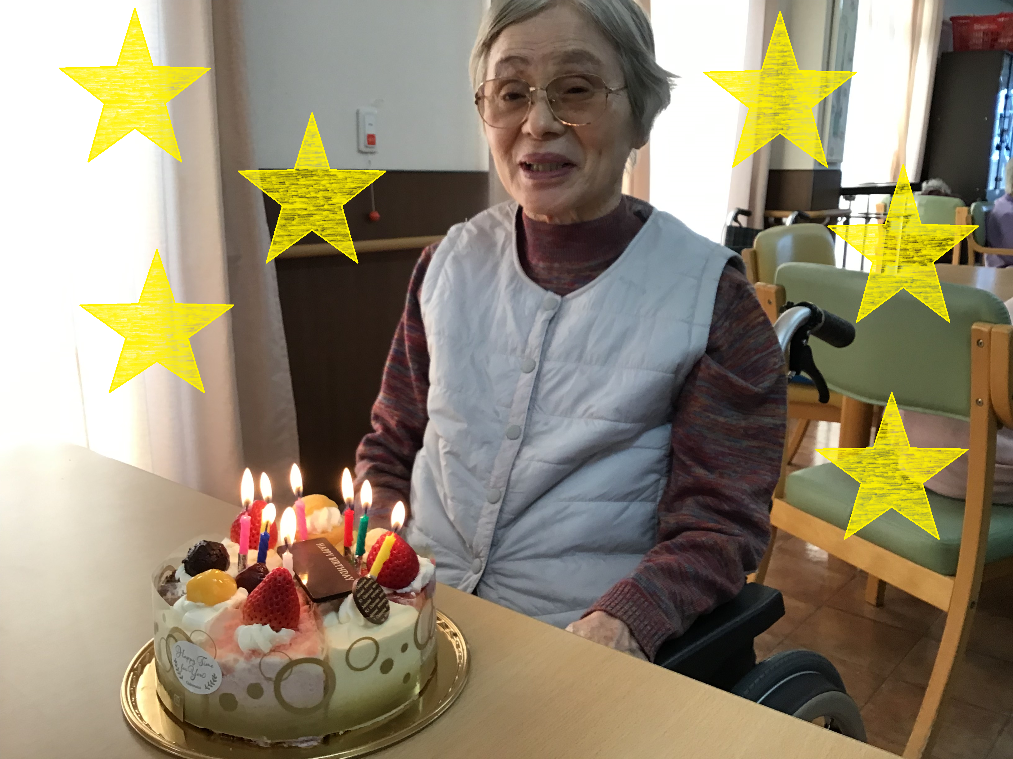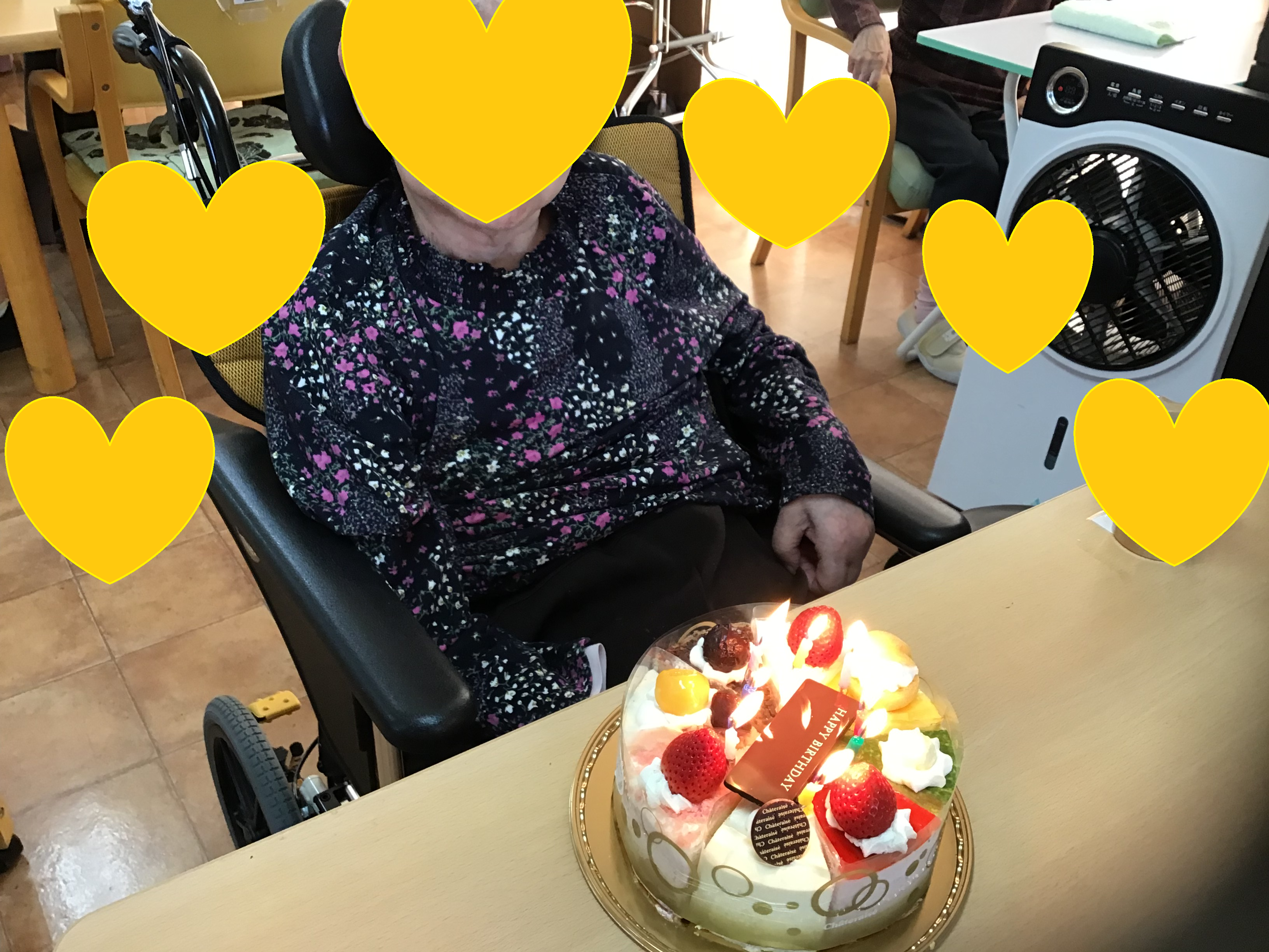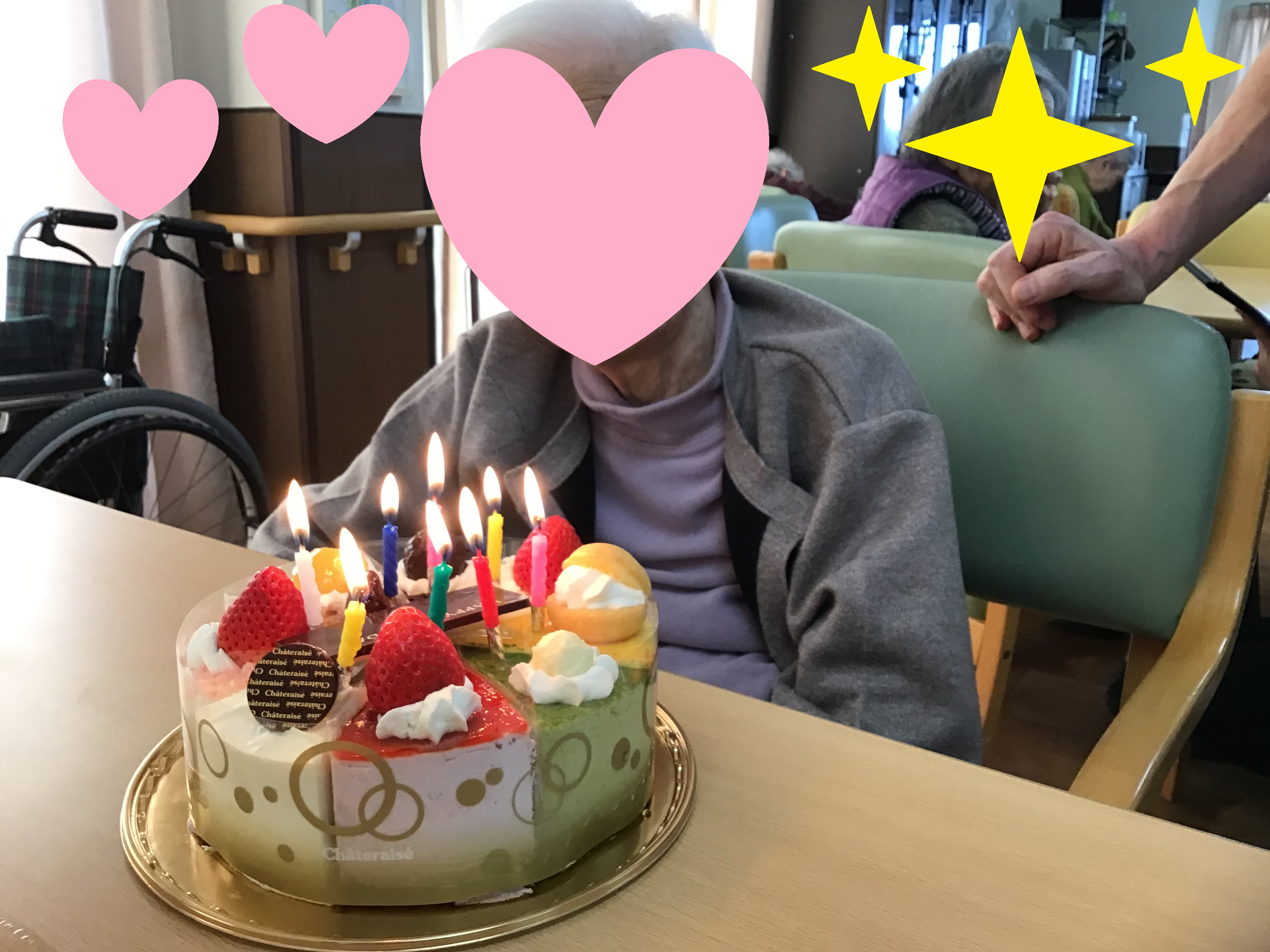 まずは、2月生まれのご入居者様とホールケーキの写真です。