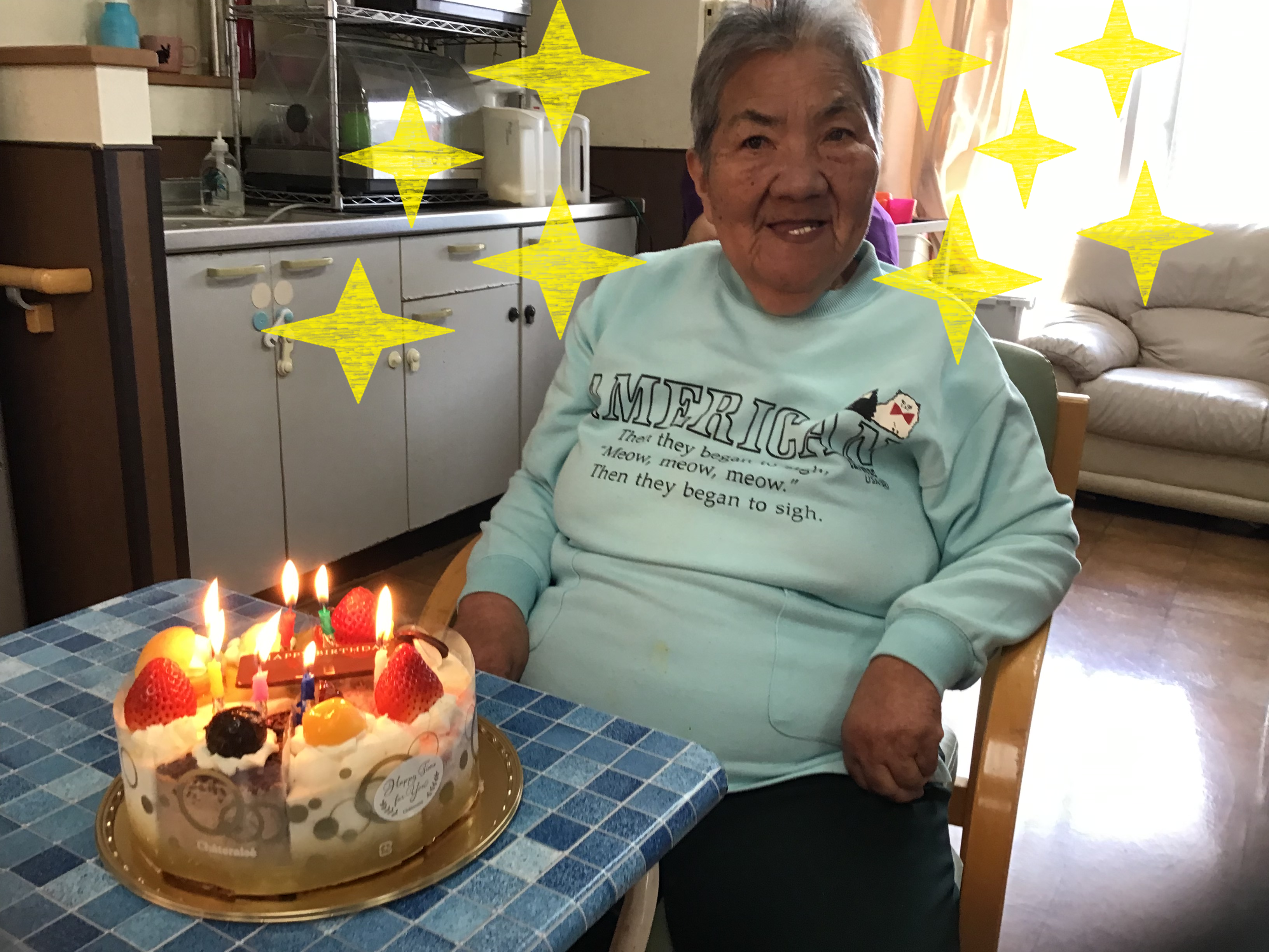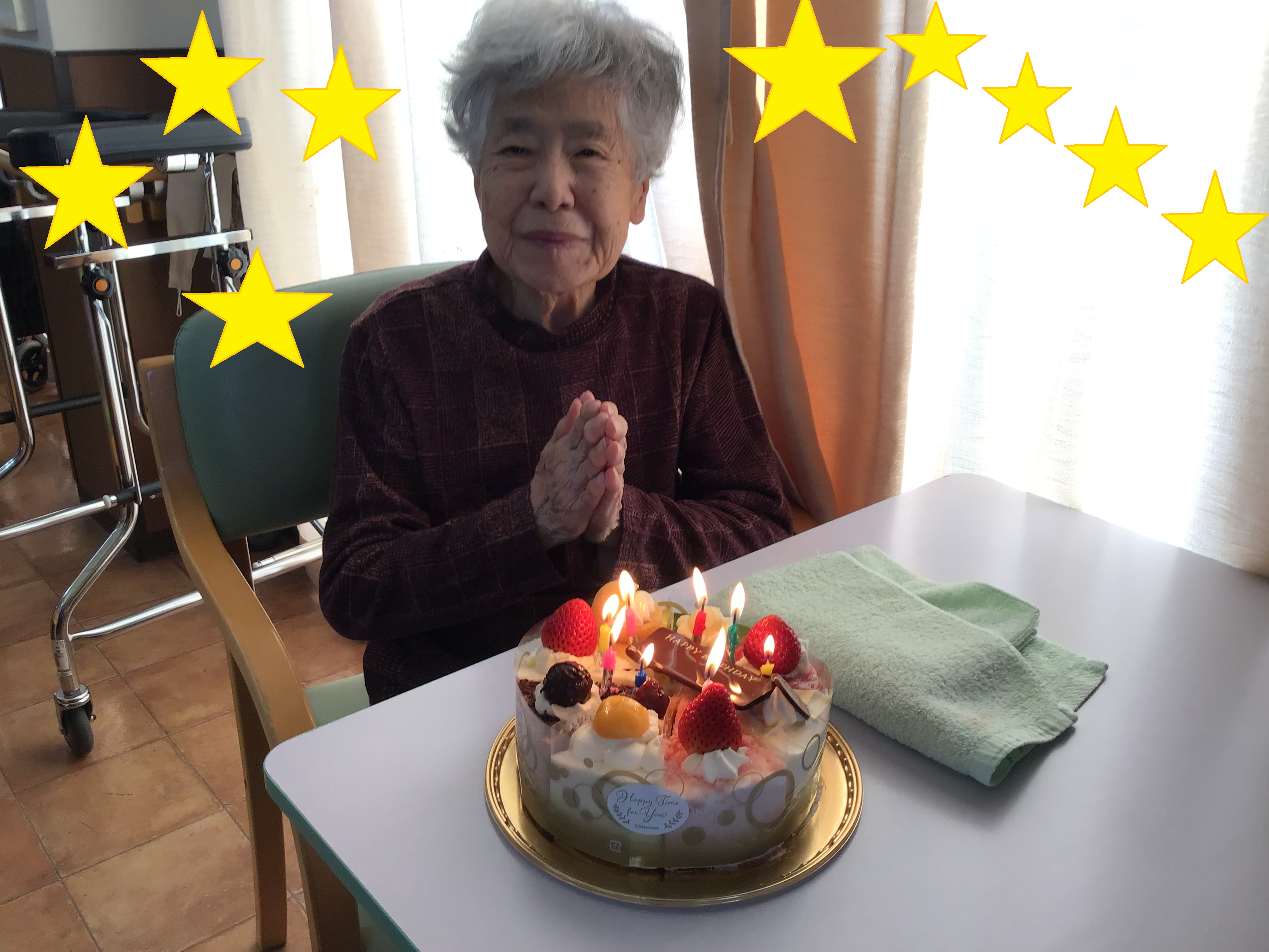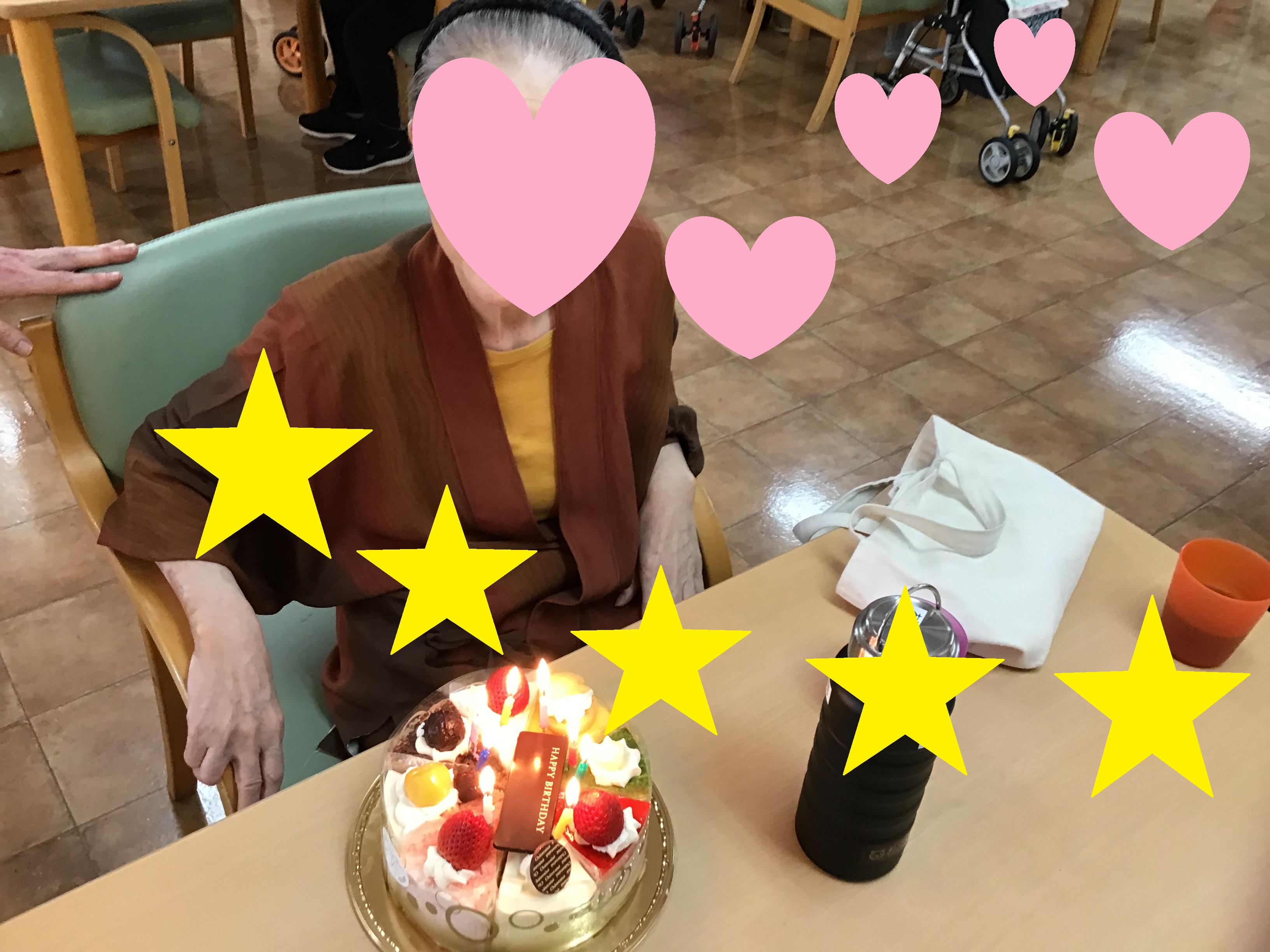 まずは、2月生まれのご入居者様とホールケーキの写真です。