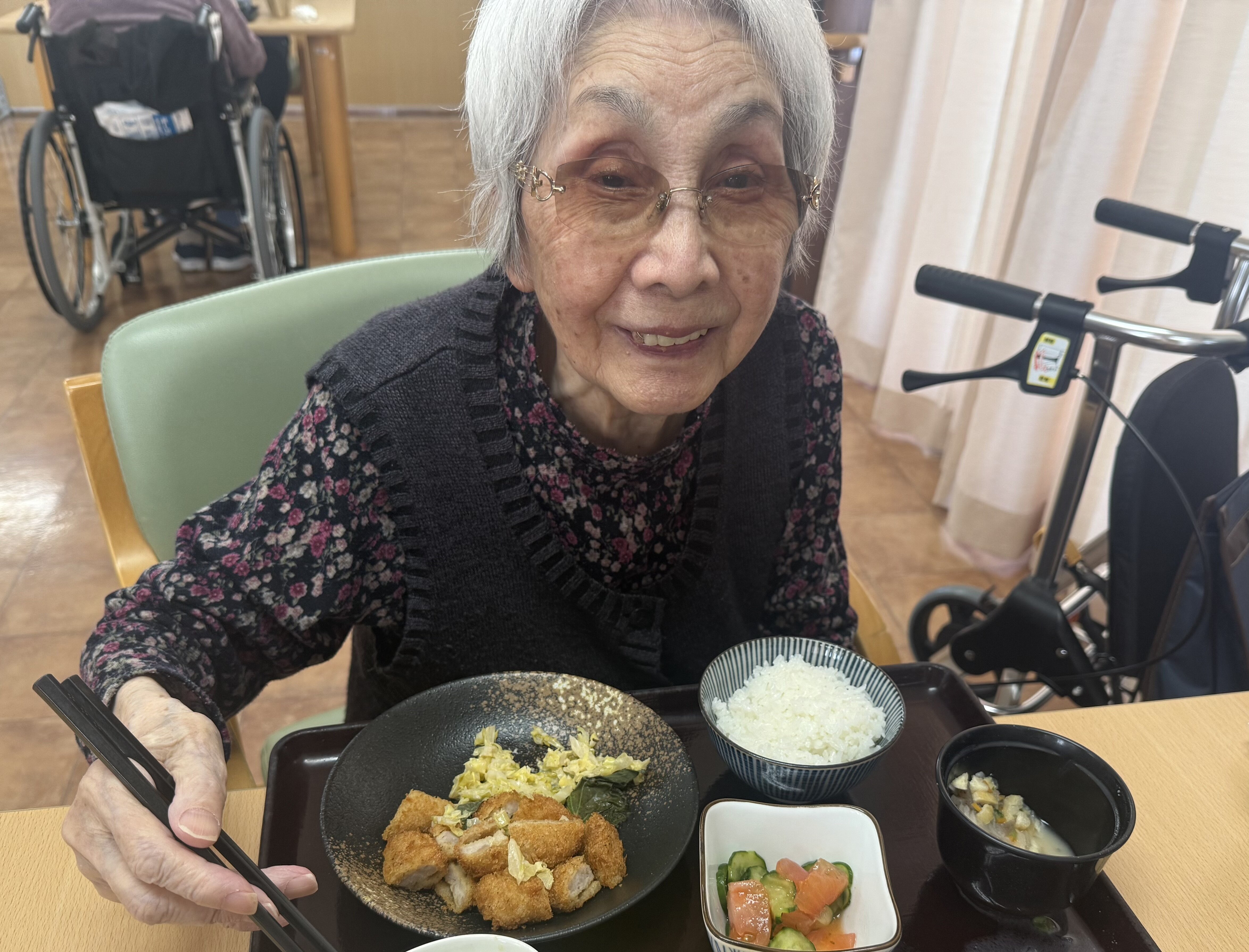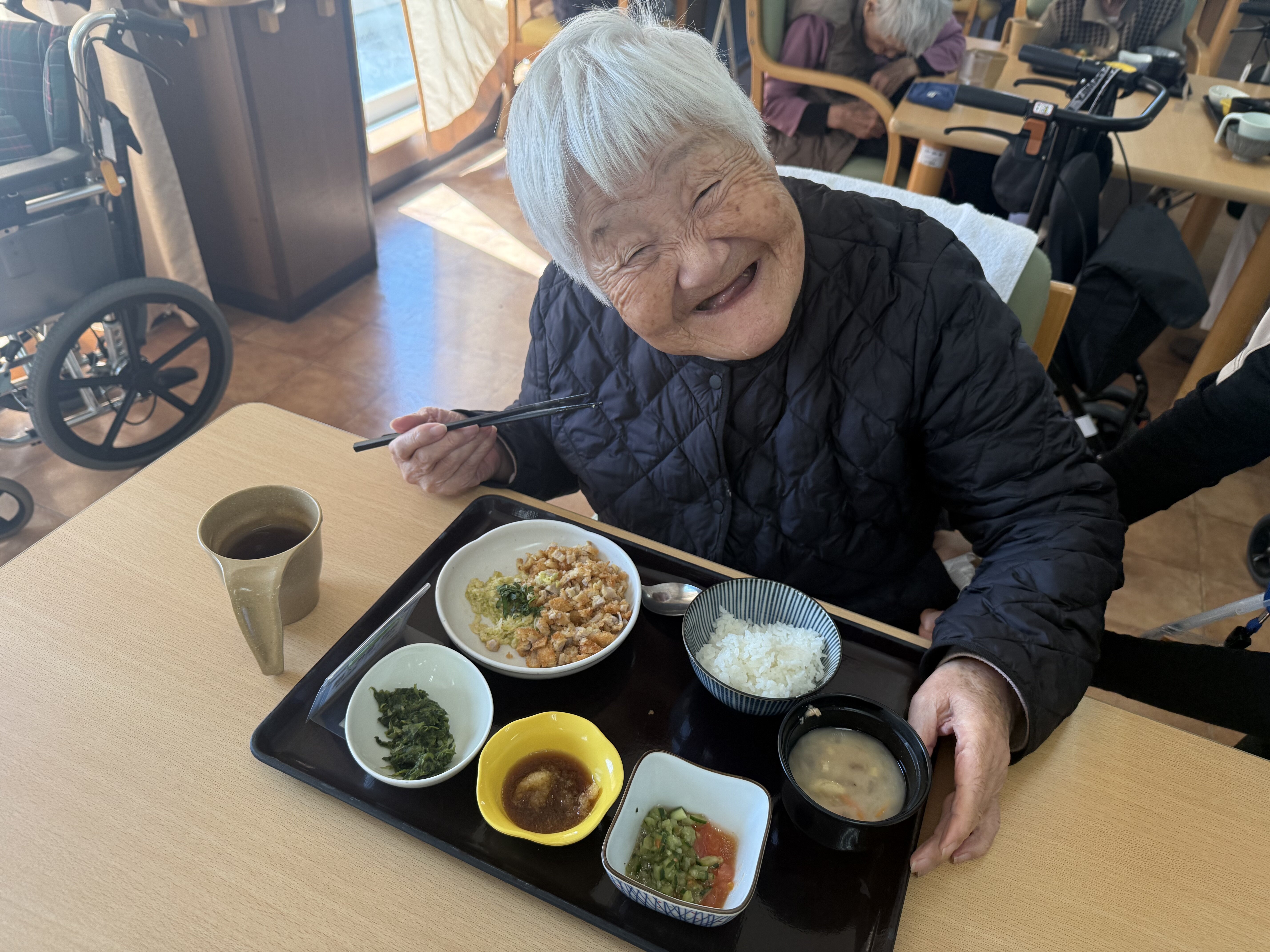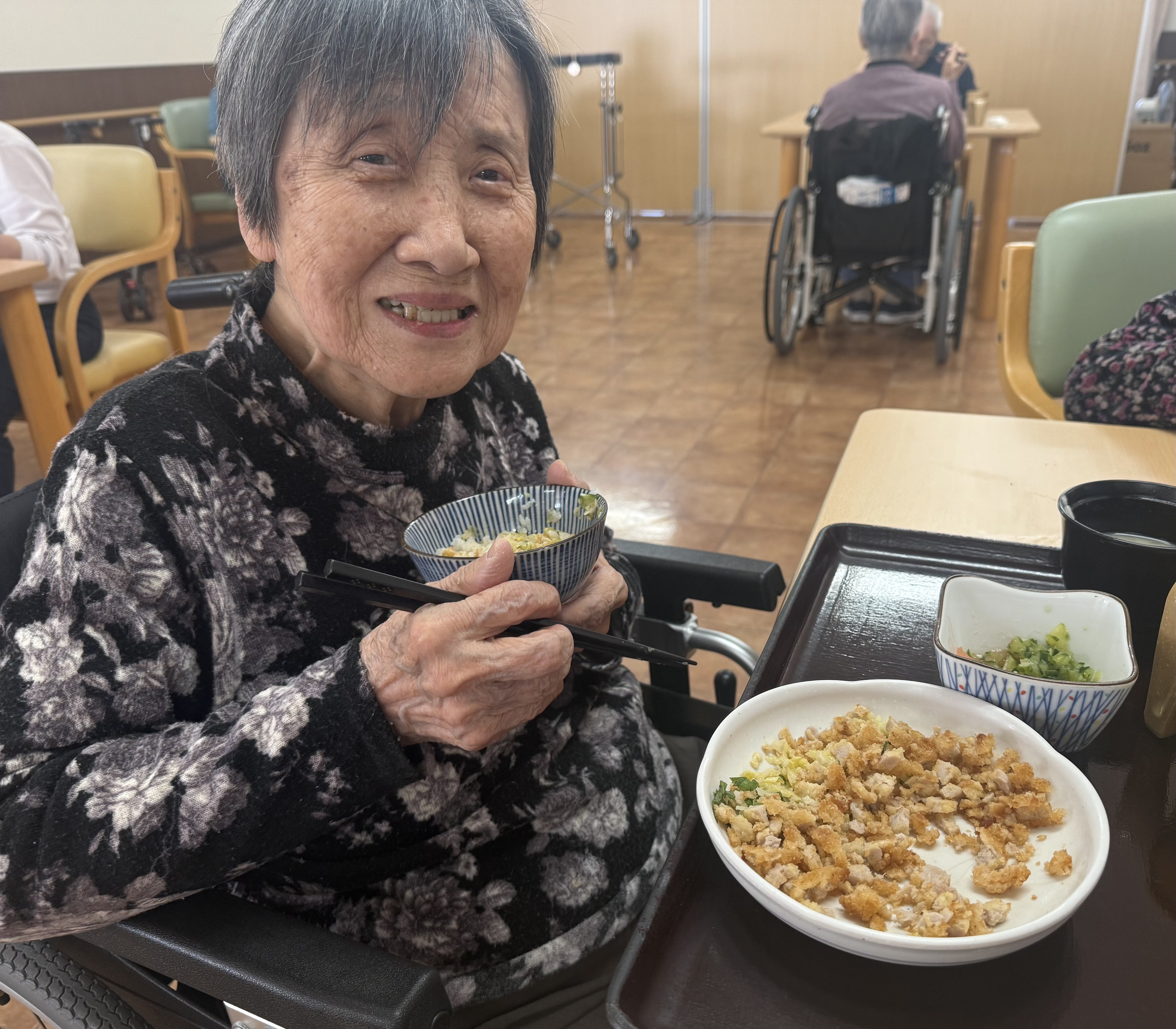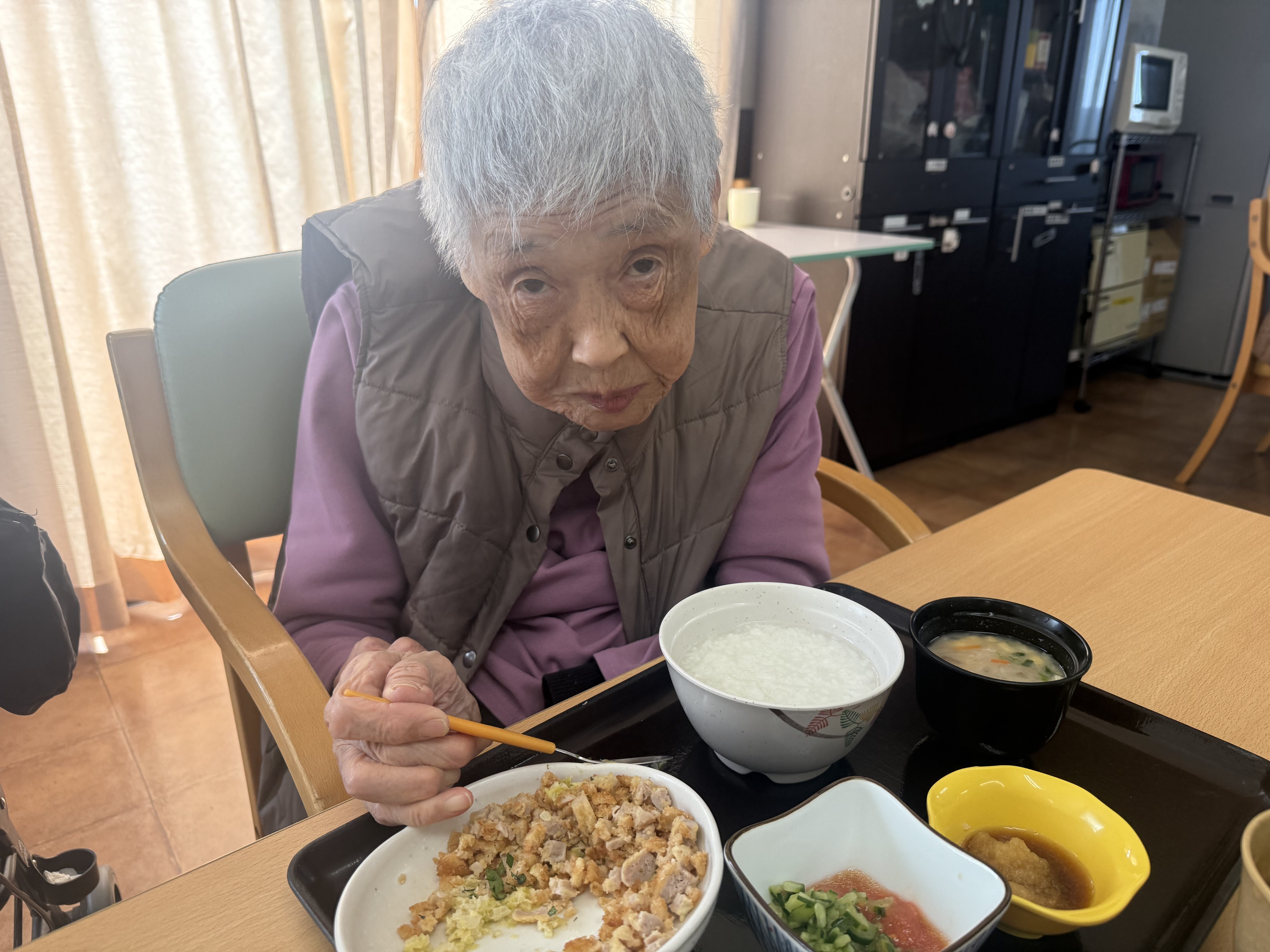 「美味しいよ。お姉ちゃんも食べる~?」などと職員とも楽しくお話されていました!(^^)!